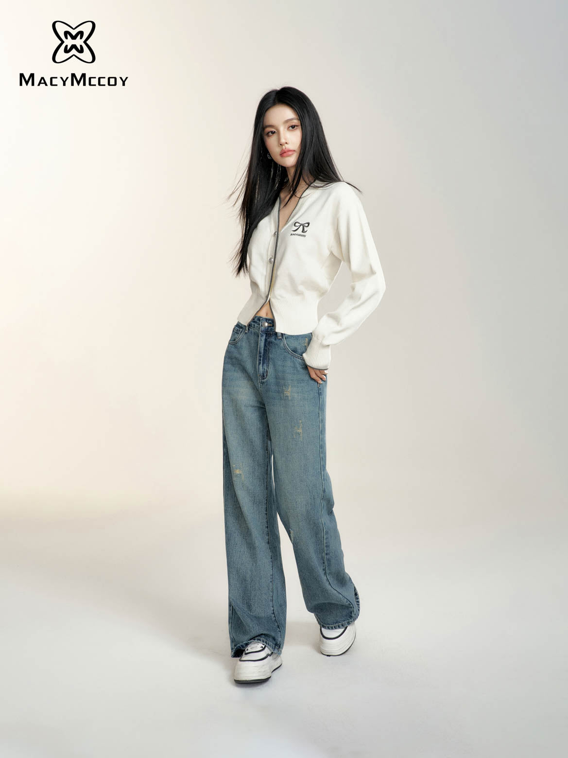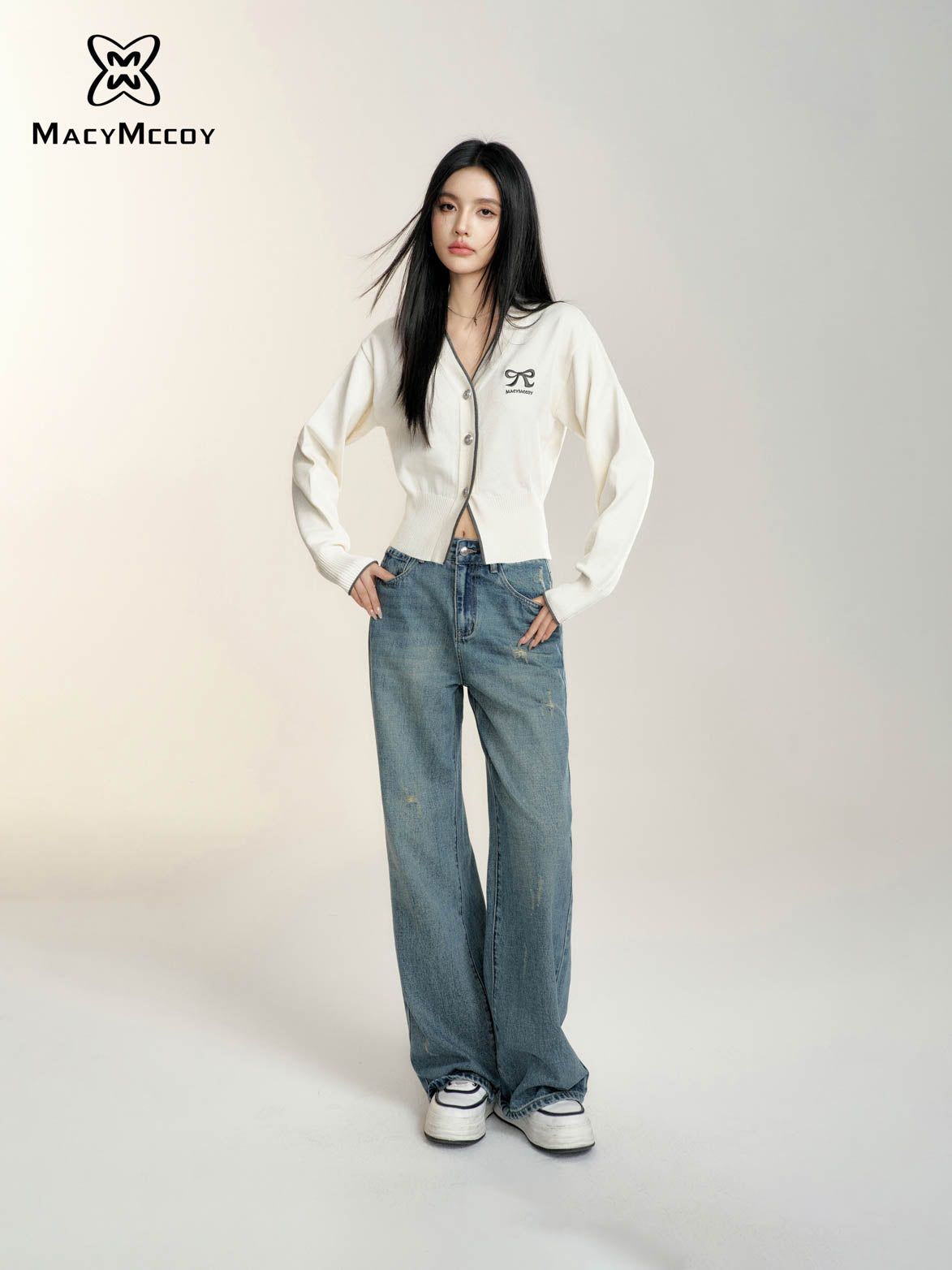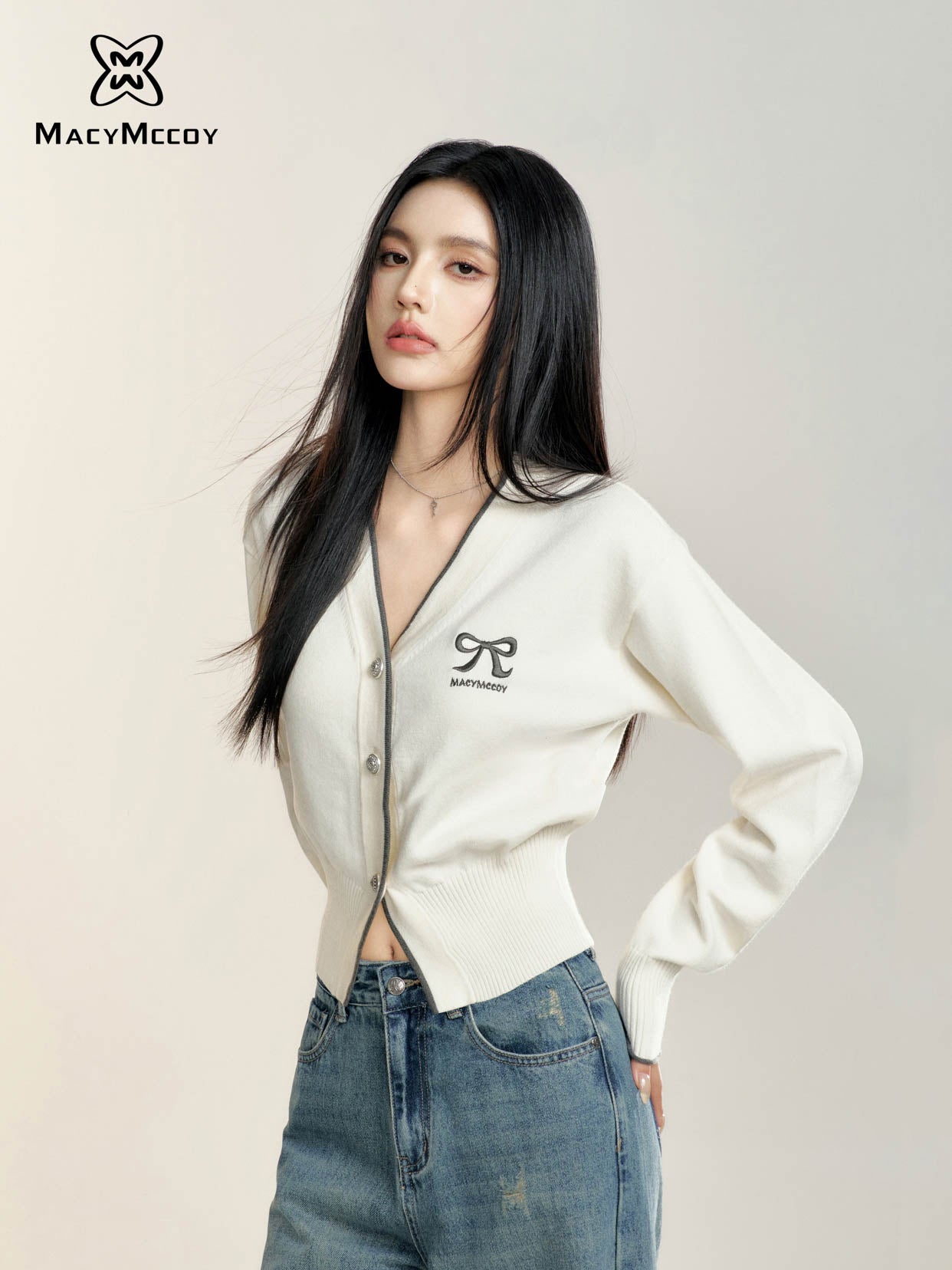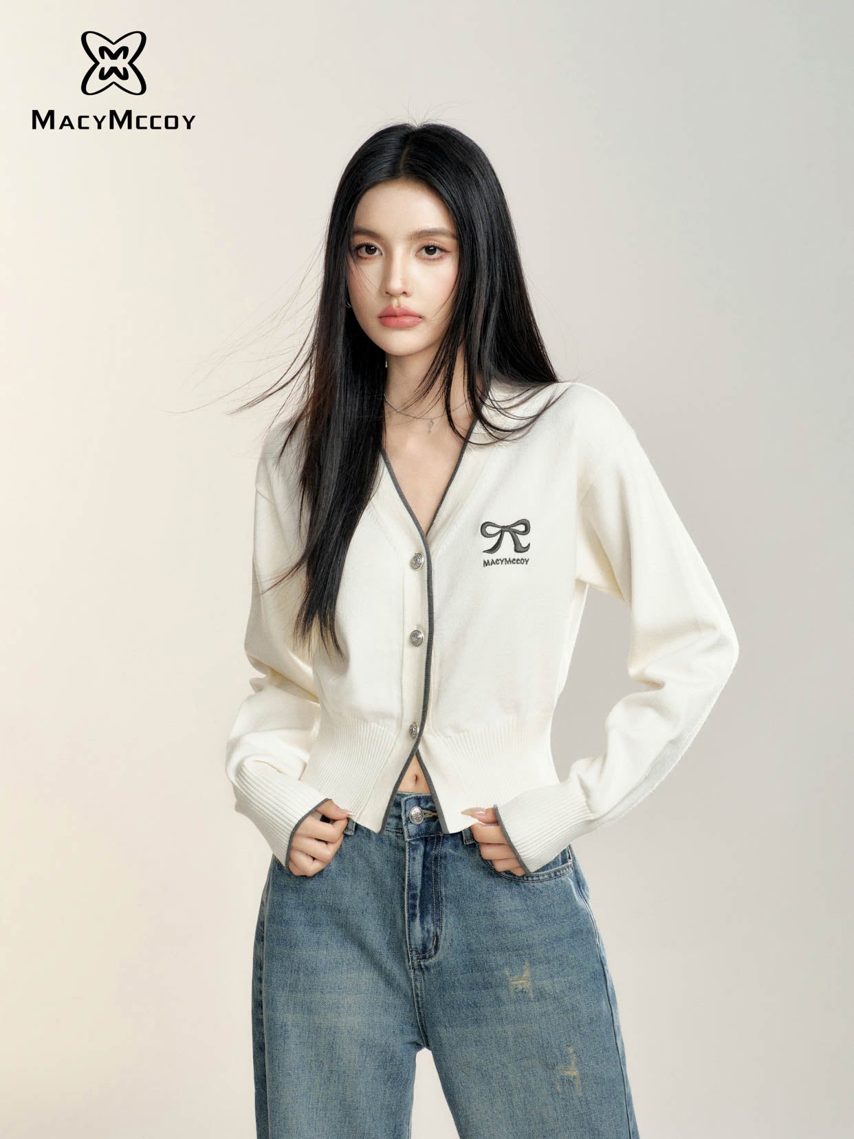 MacyMccoy 2408 撞色蝴蝶结针织开衫