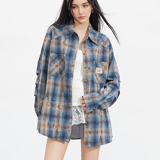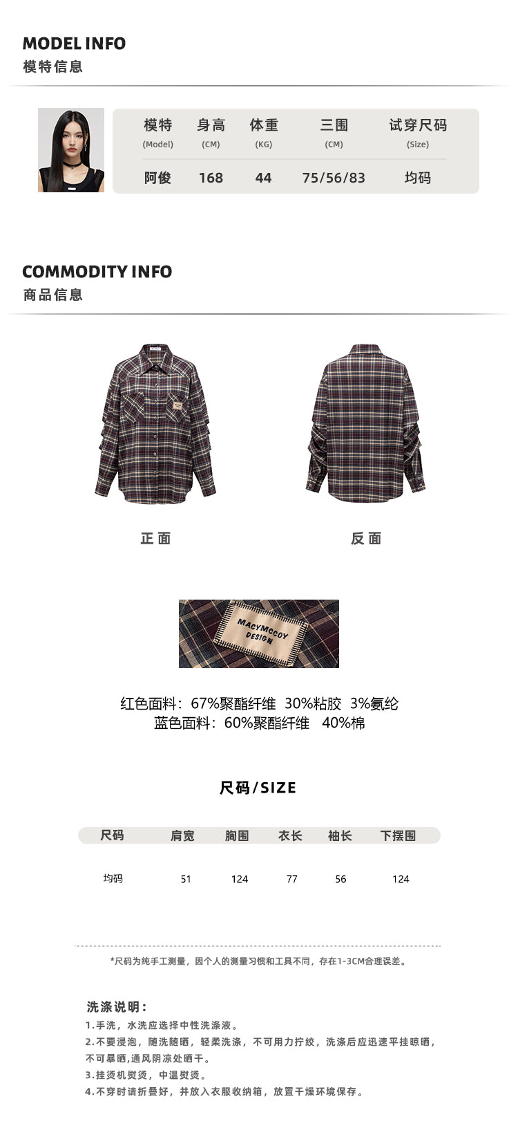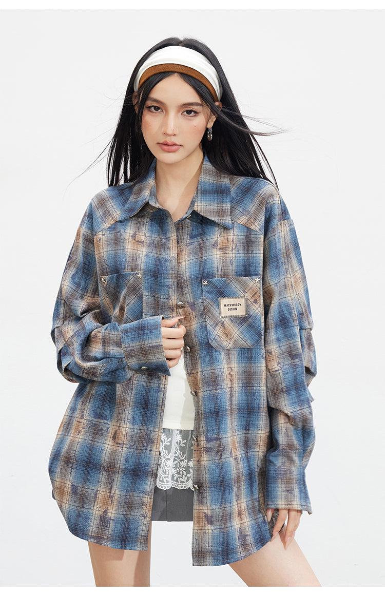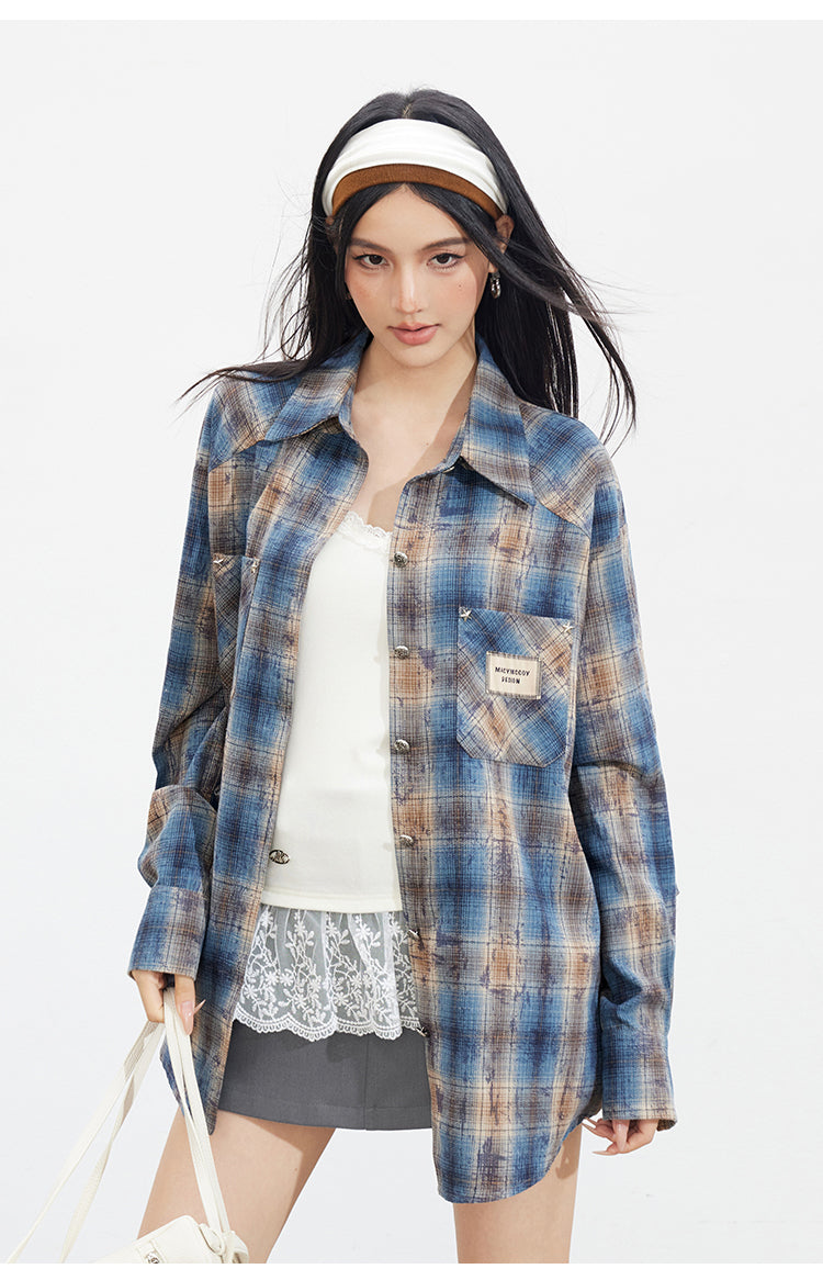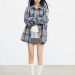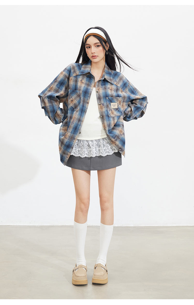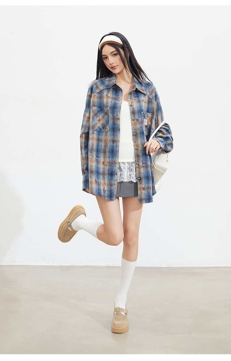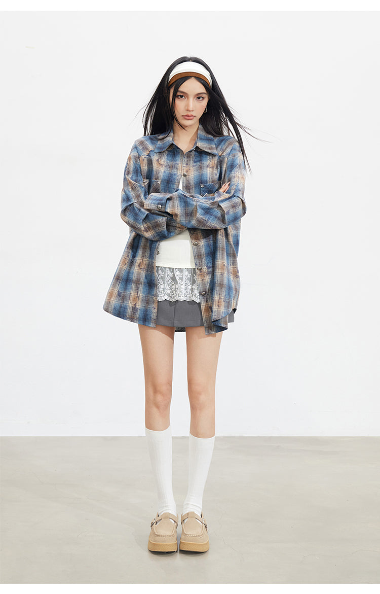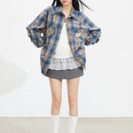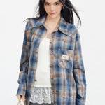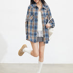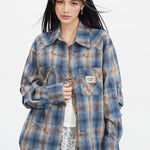 MacyMccoy 2510 复古宽松长袖格子衬衫 蓝格