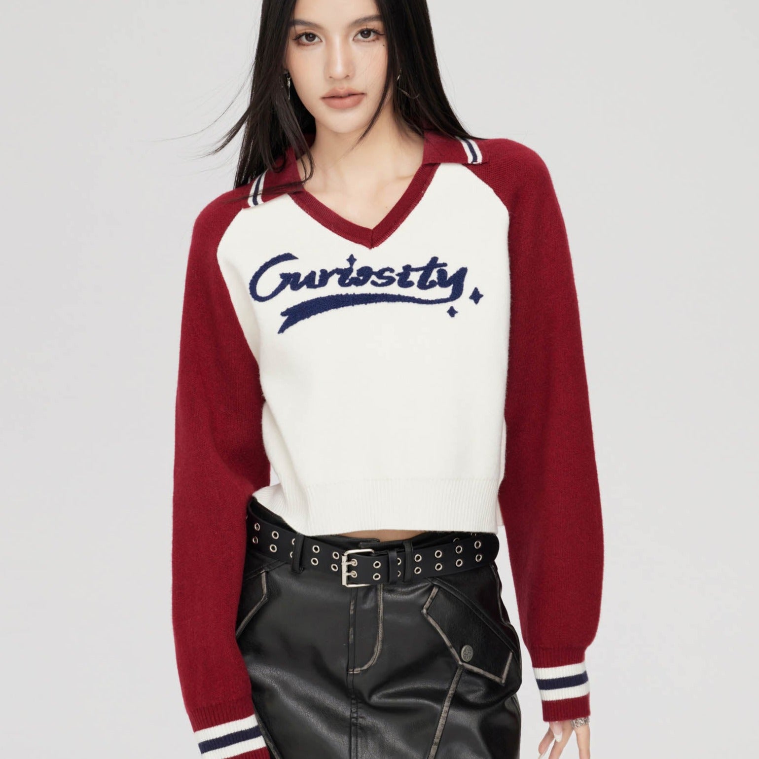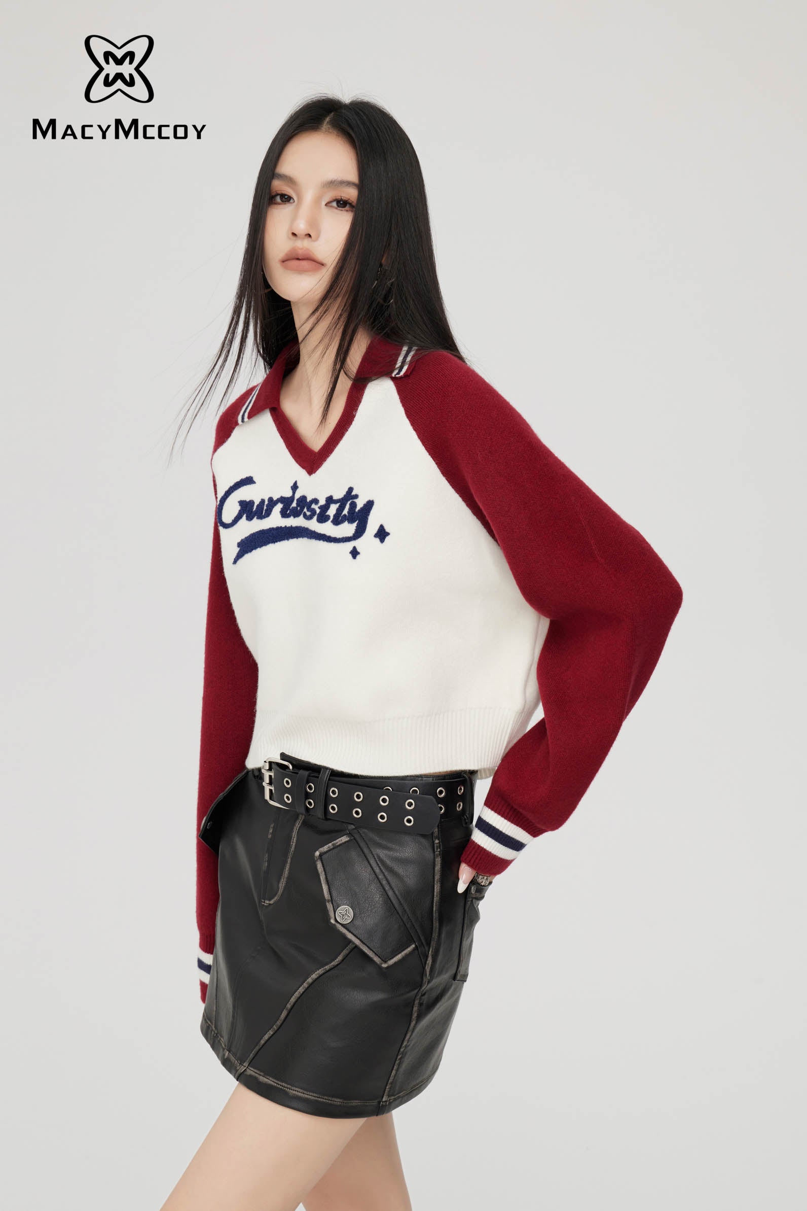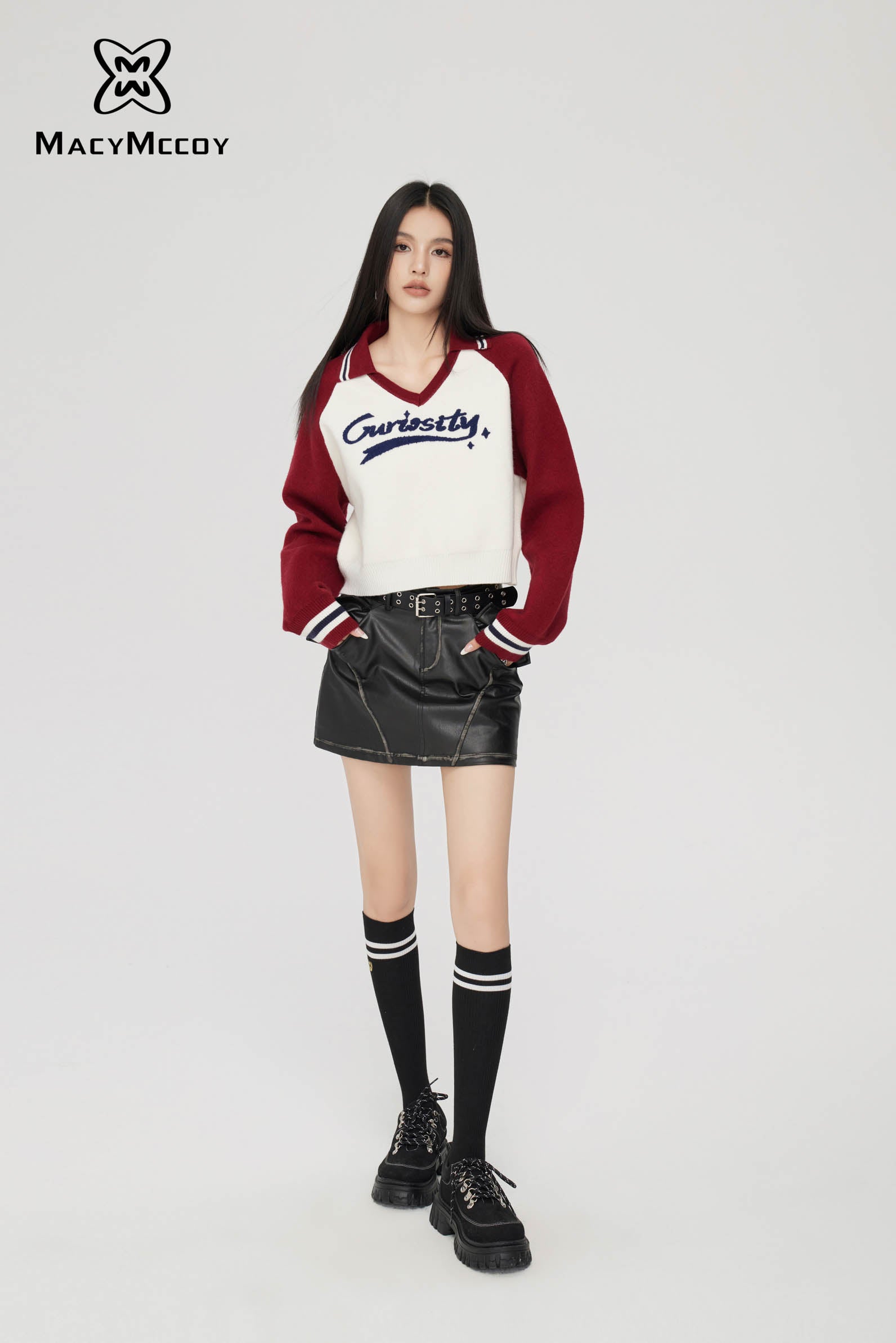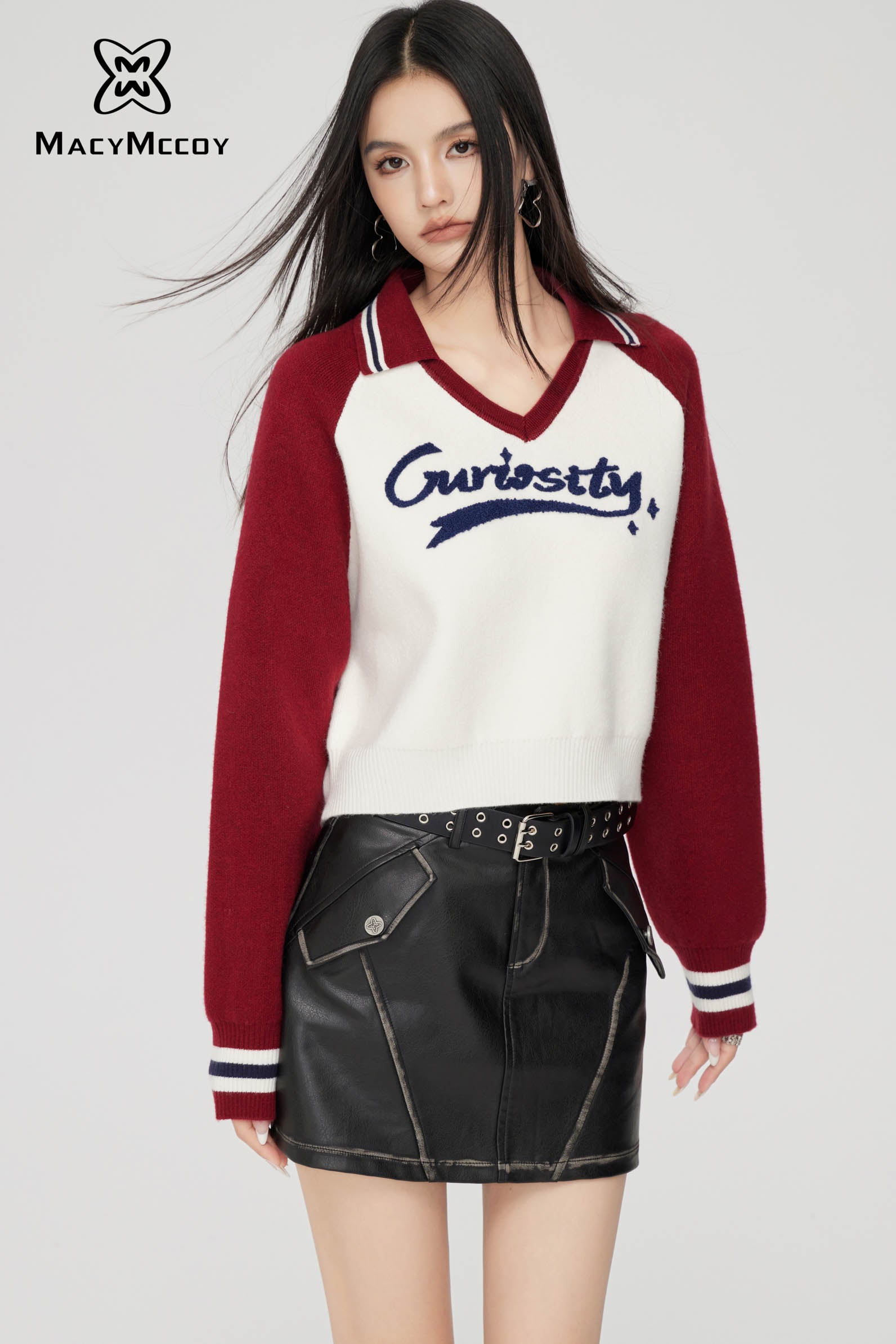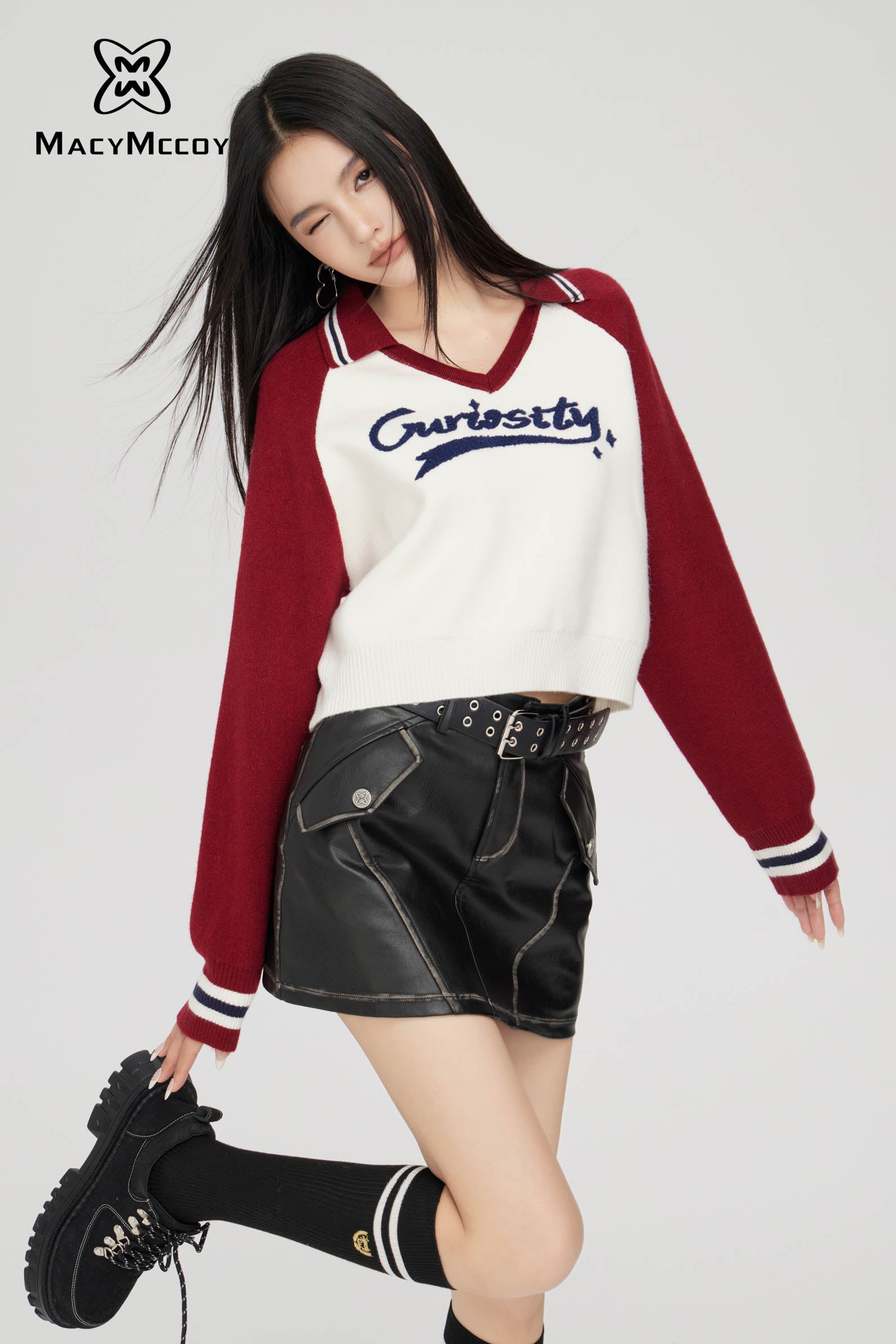 MacyMccoy SS2310 撞色V领短款毛衣 红