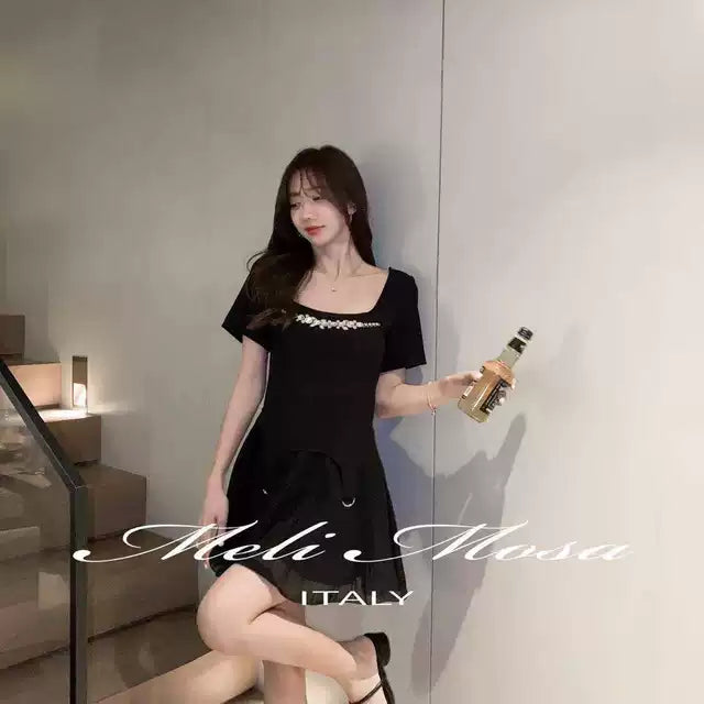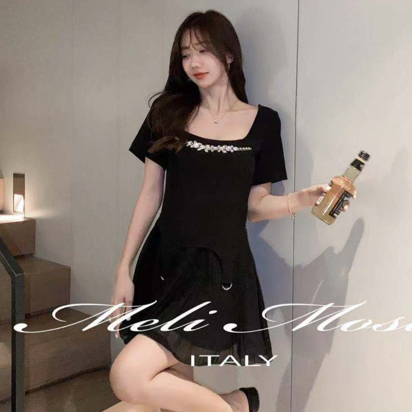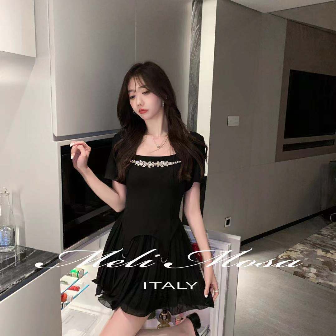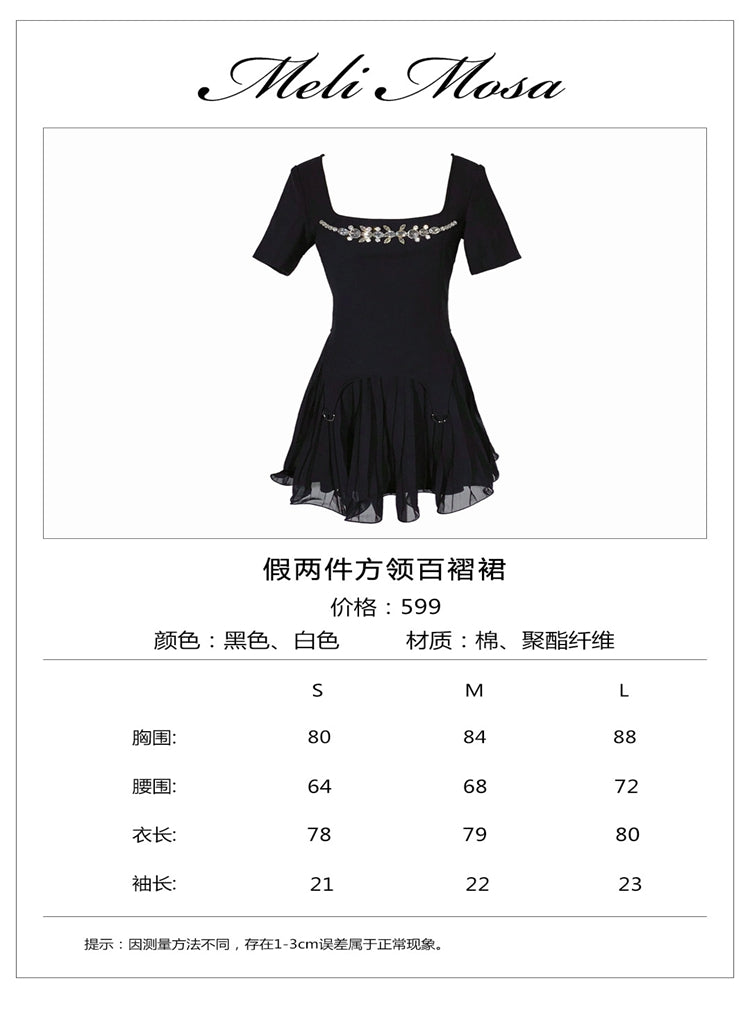 MeliMosa SS2309 假两件方领百褶连衣裙 黑
