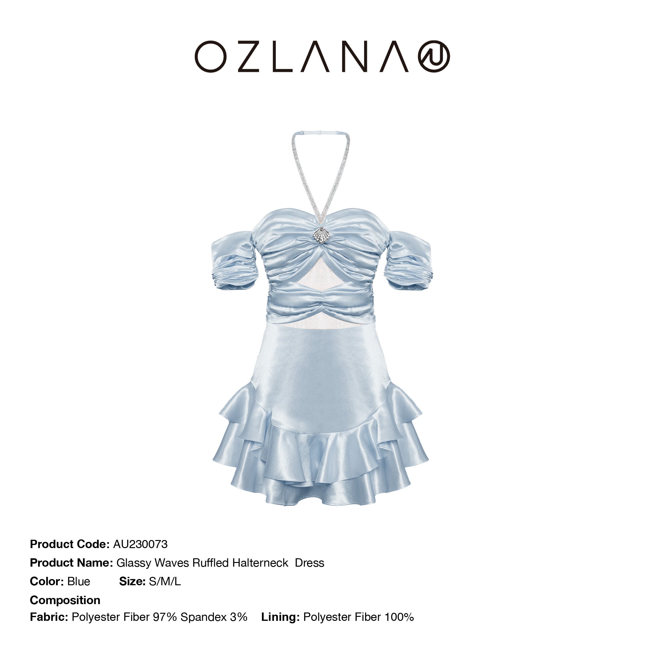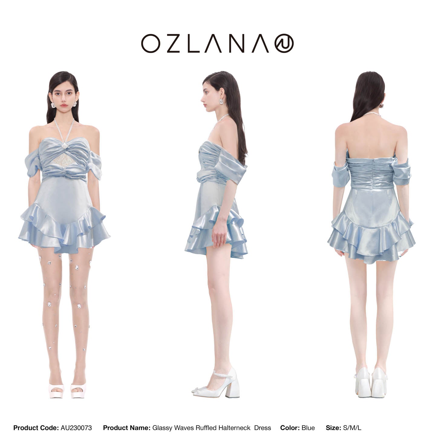 OZLANA SS2304 Glassy Waves Ruffled Halterneck Dress Blue