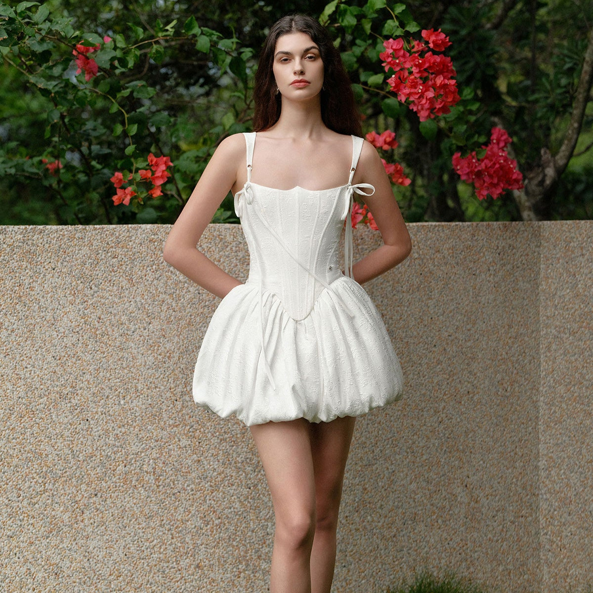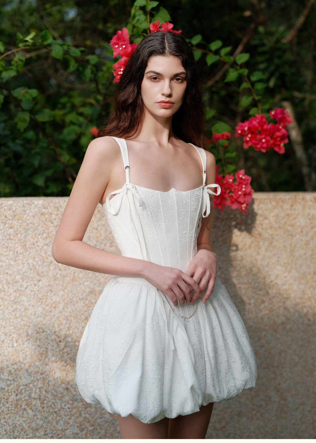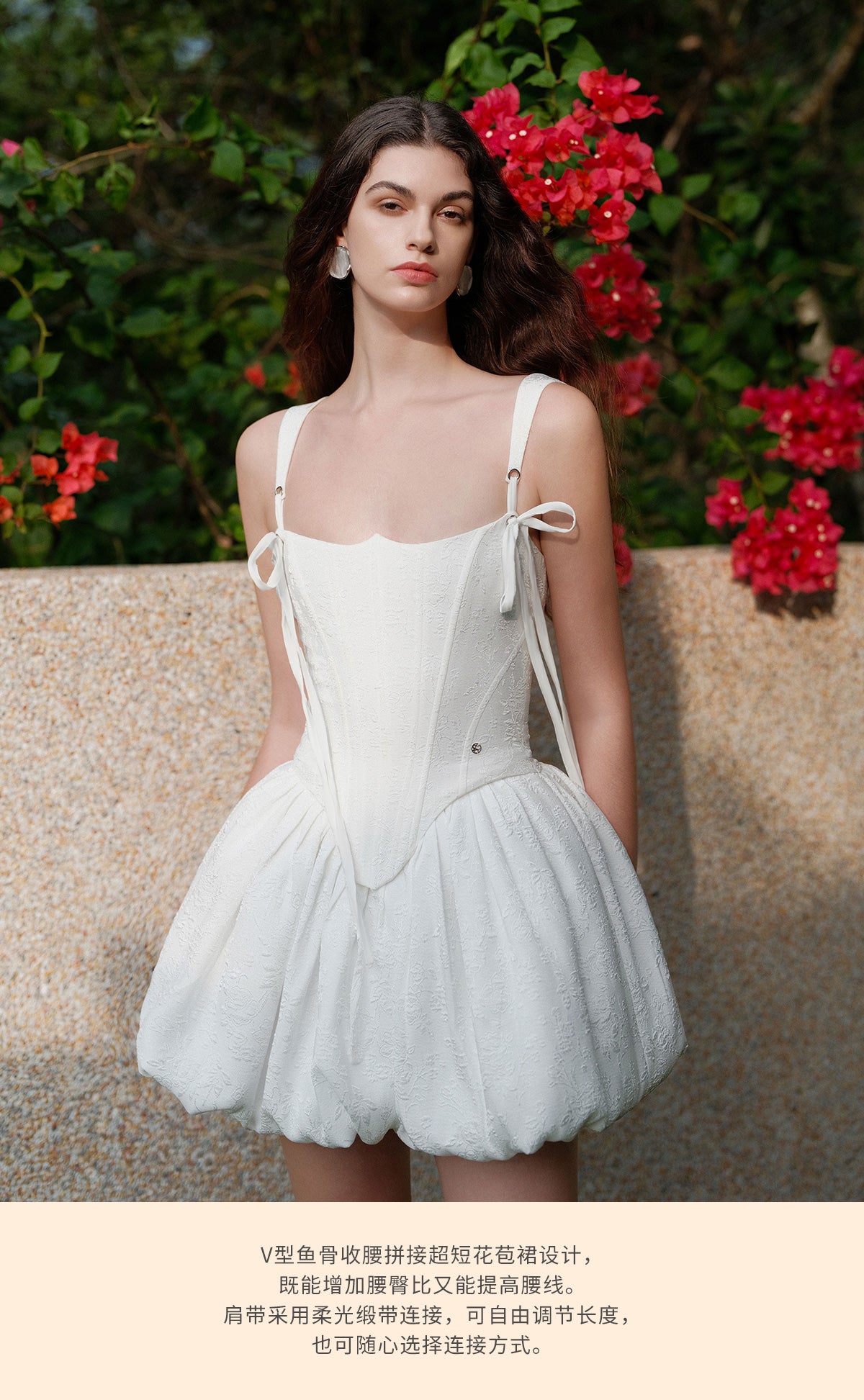 SHEER LUCK 2502 鱼骨收腰千金感吊带泡泡短裙 珍珠白