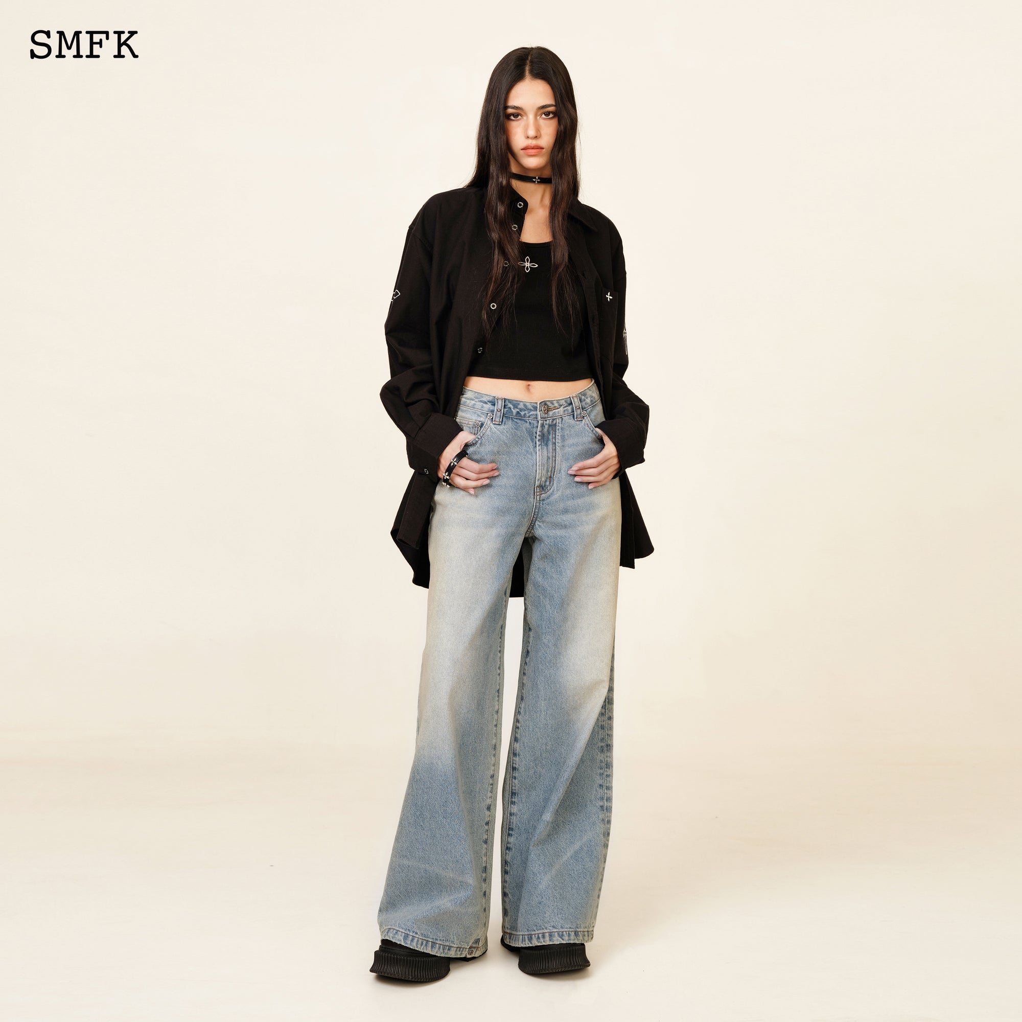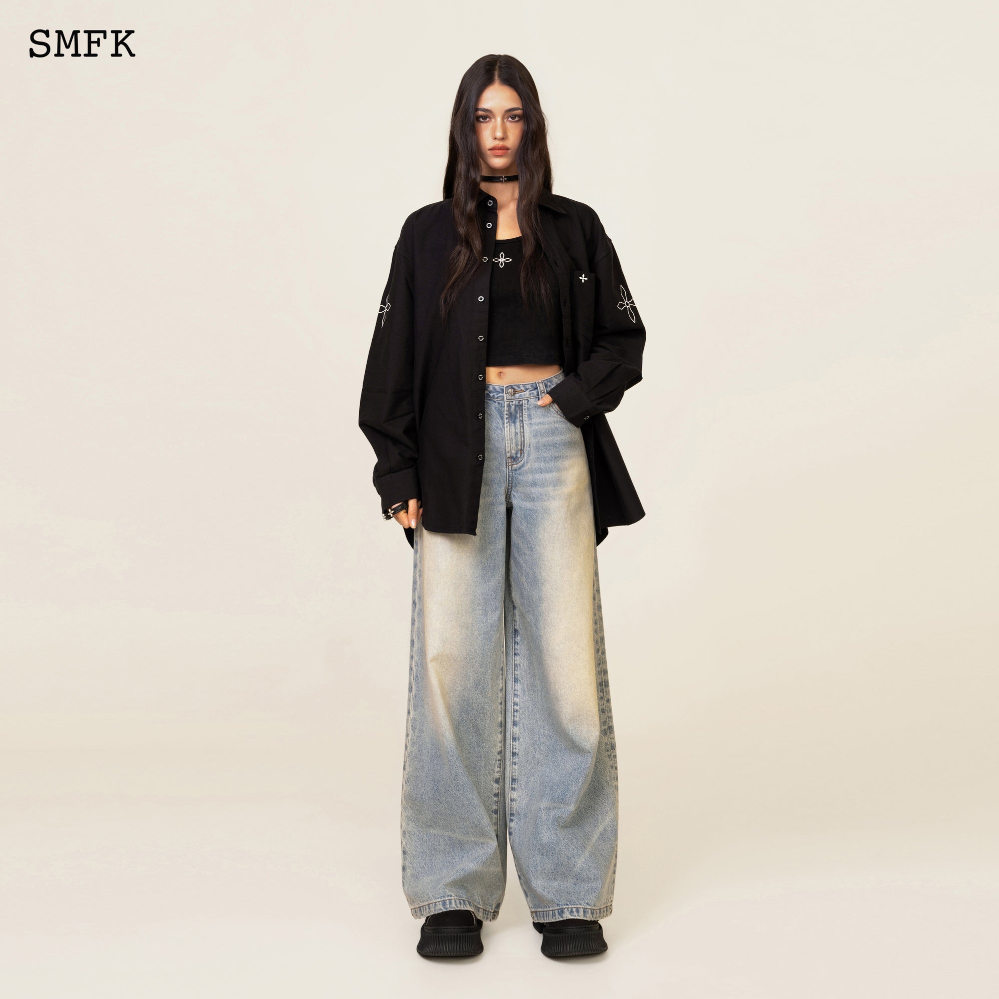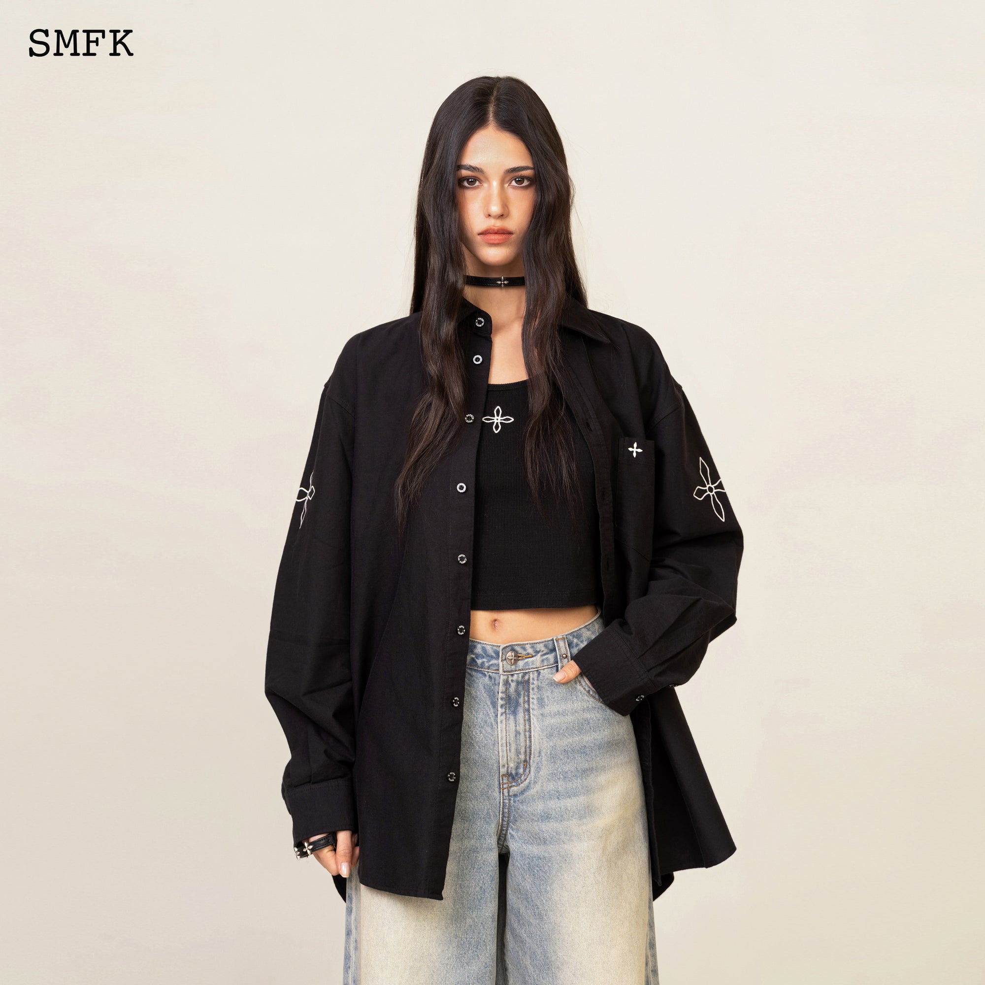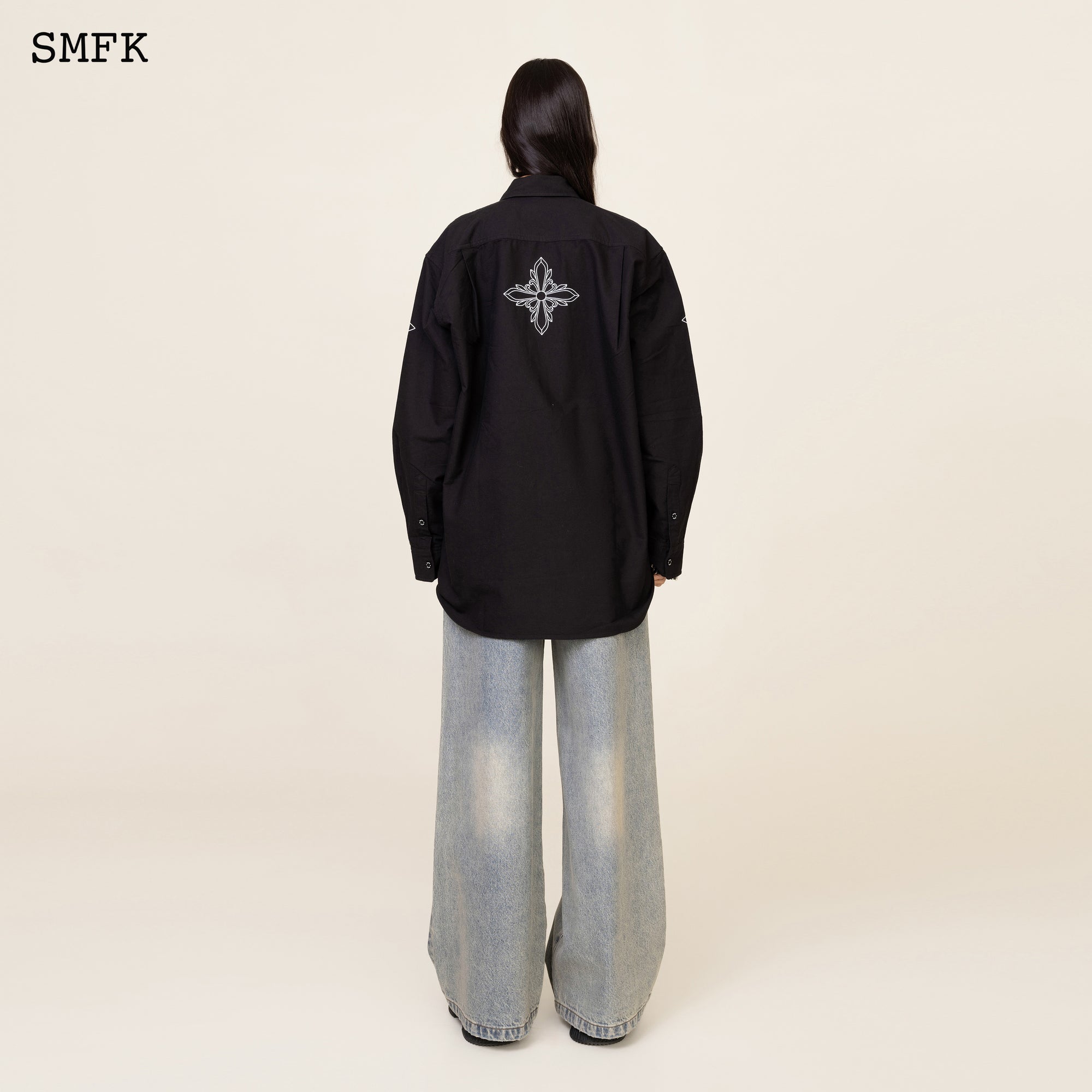 SMFK 古典衬衫于文文同款刺绣十字花复古纯棉水洗宽松上衣 黑