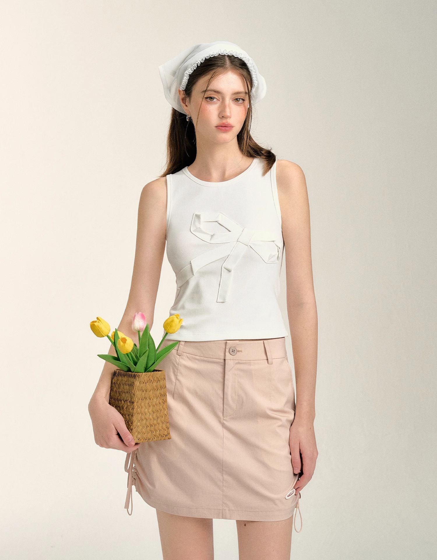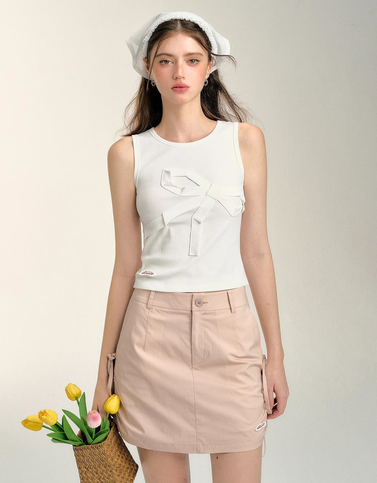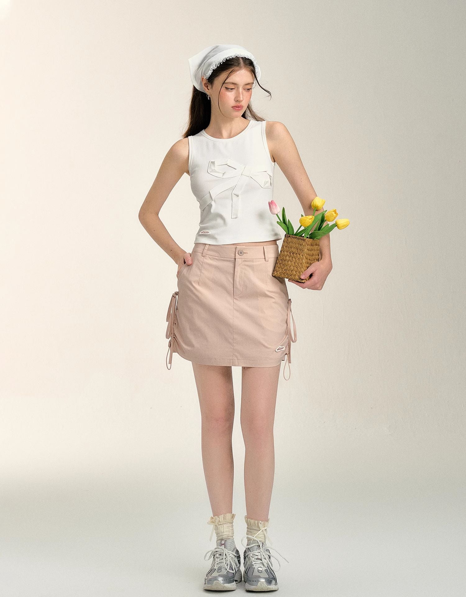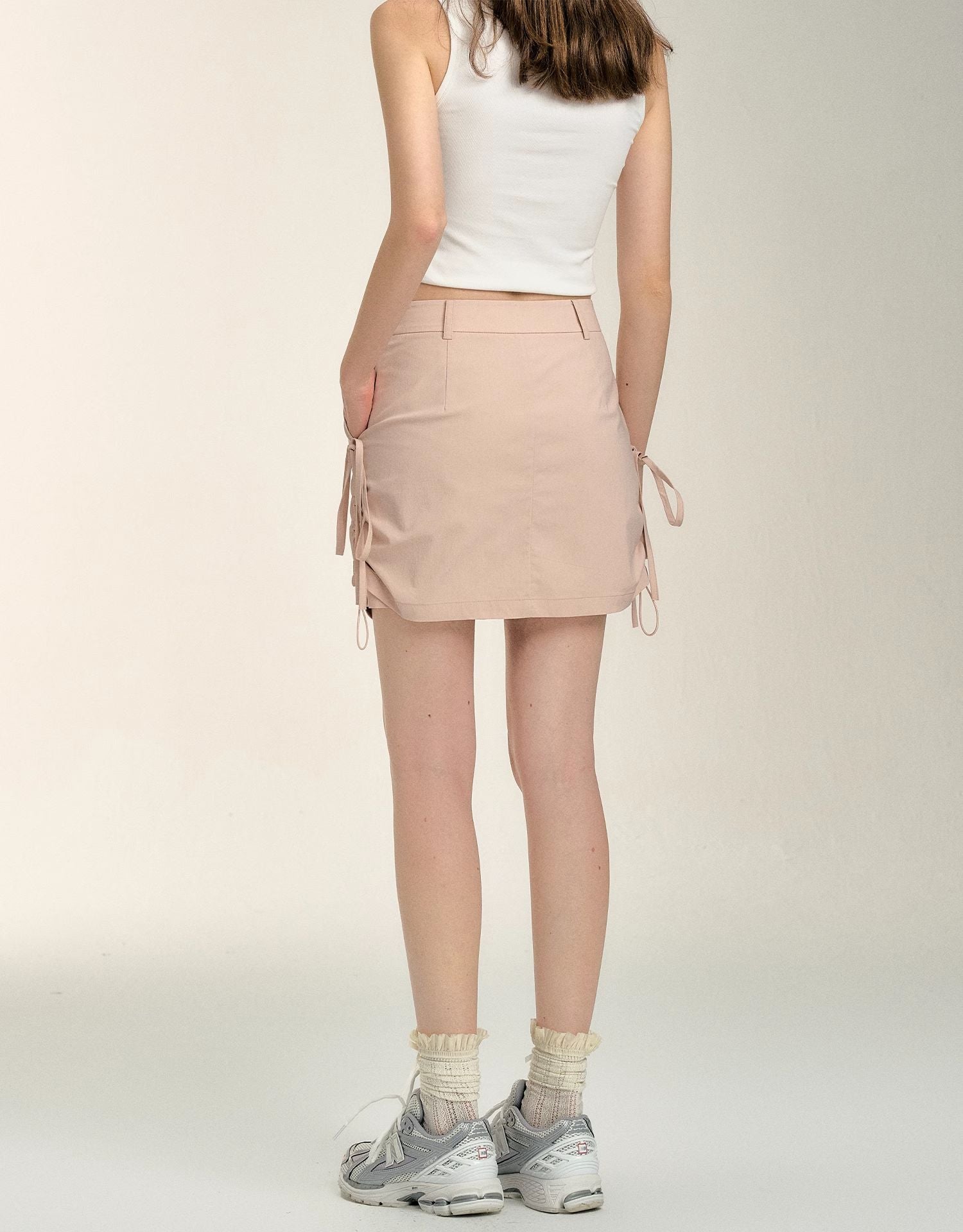 SOMESOWE 2407 甜辣蝴蝶结抽绳工装短裙 皮粉