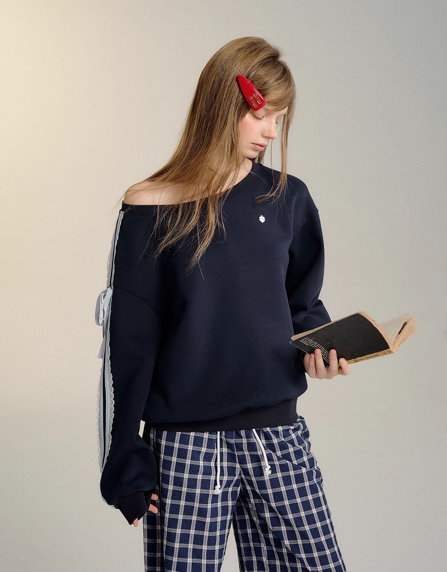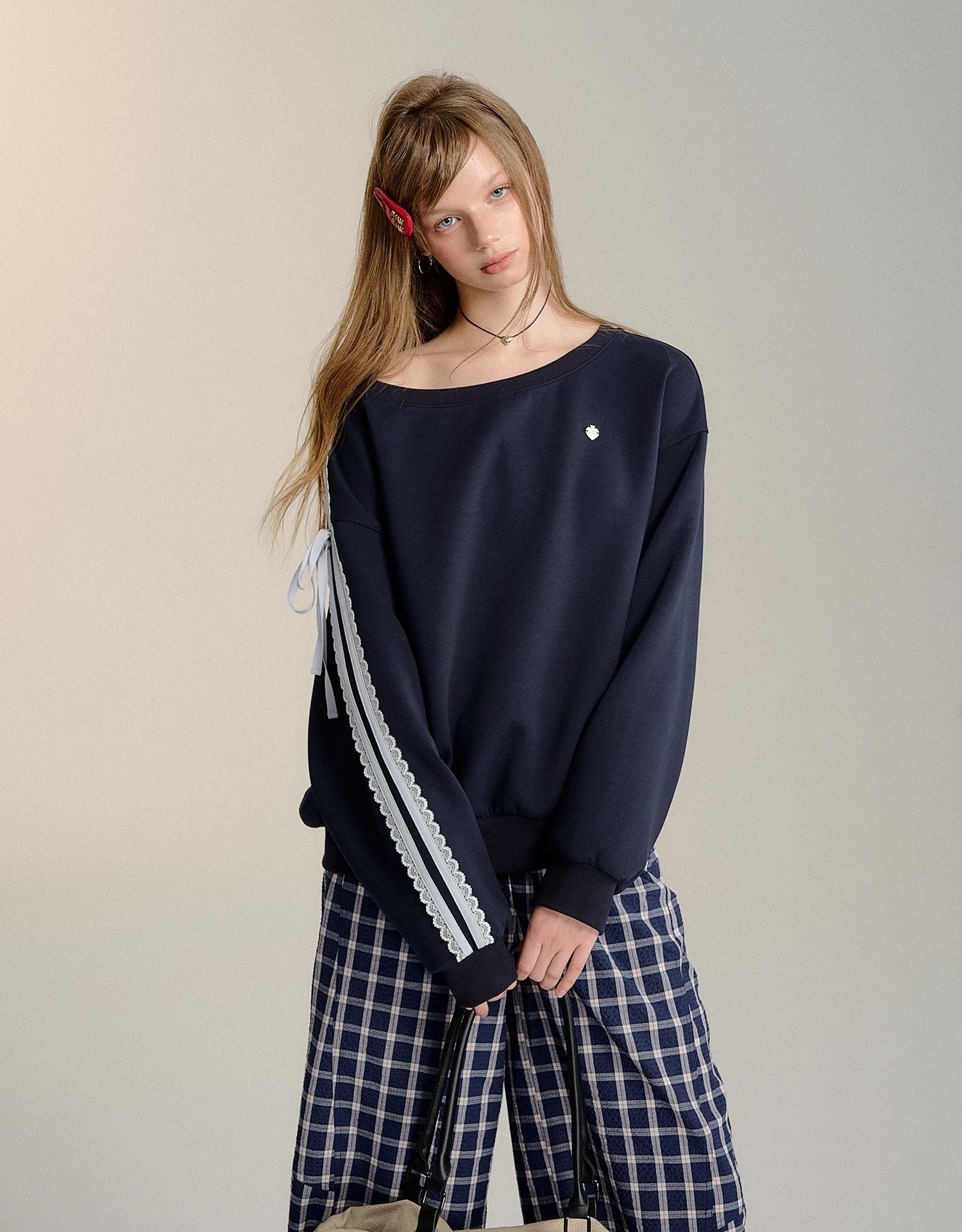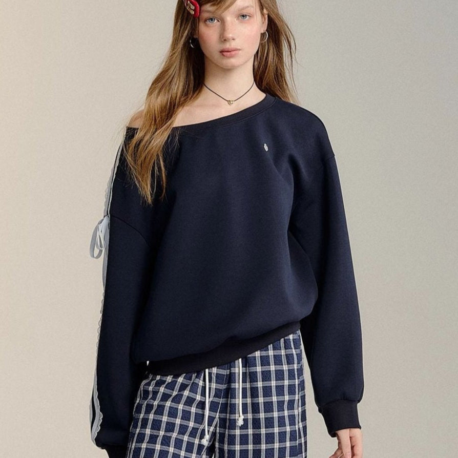 SOMESOWE 2409 蕾丝蝴蝶结露肩长袖卫衣 藏青