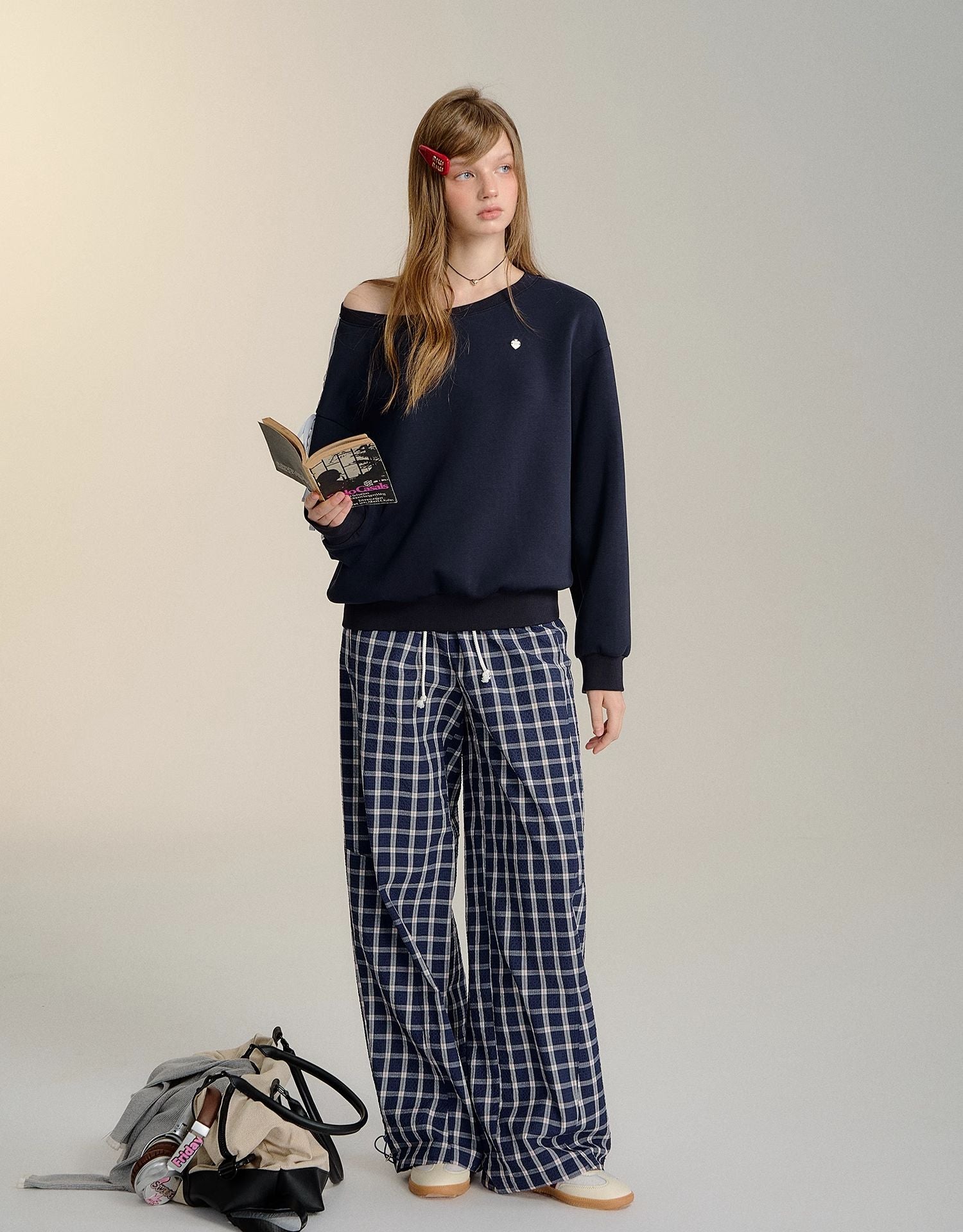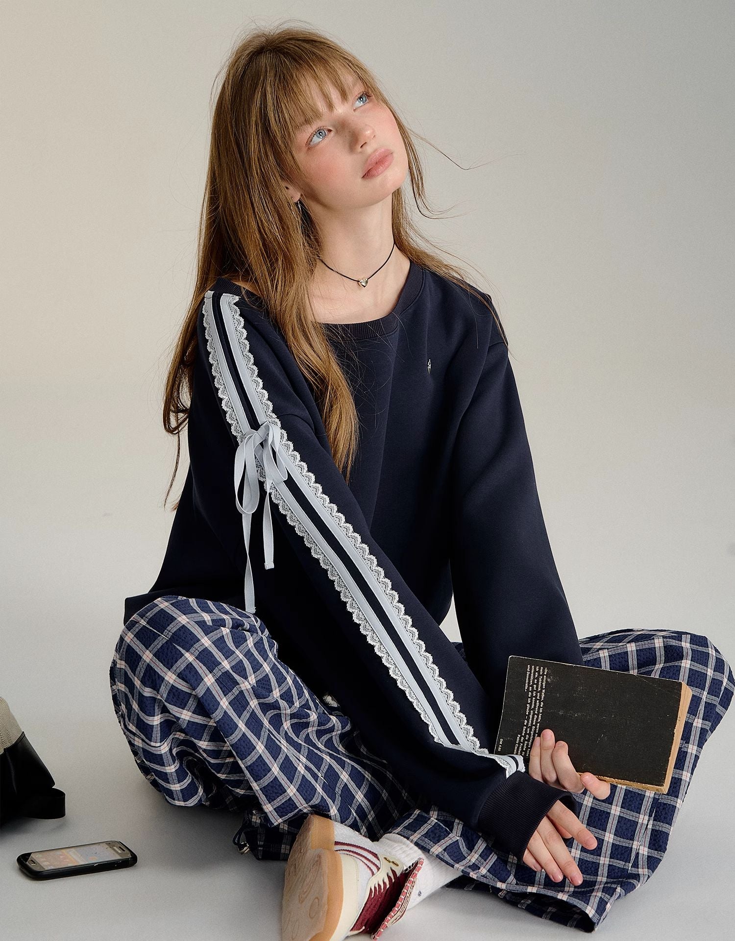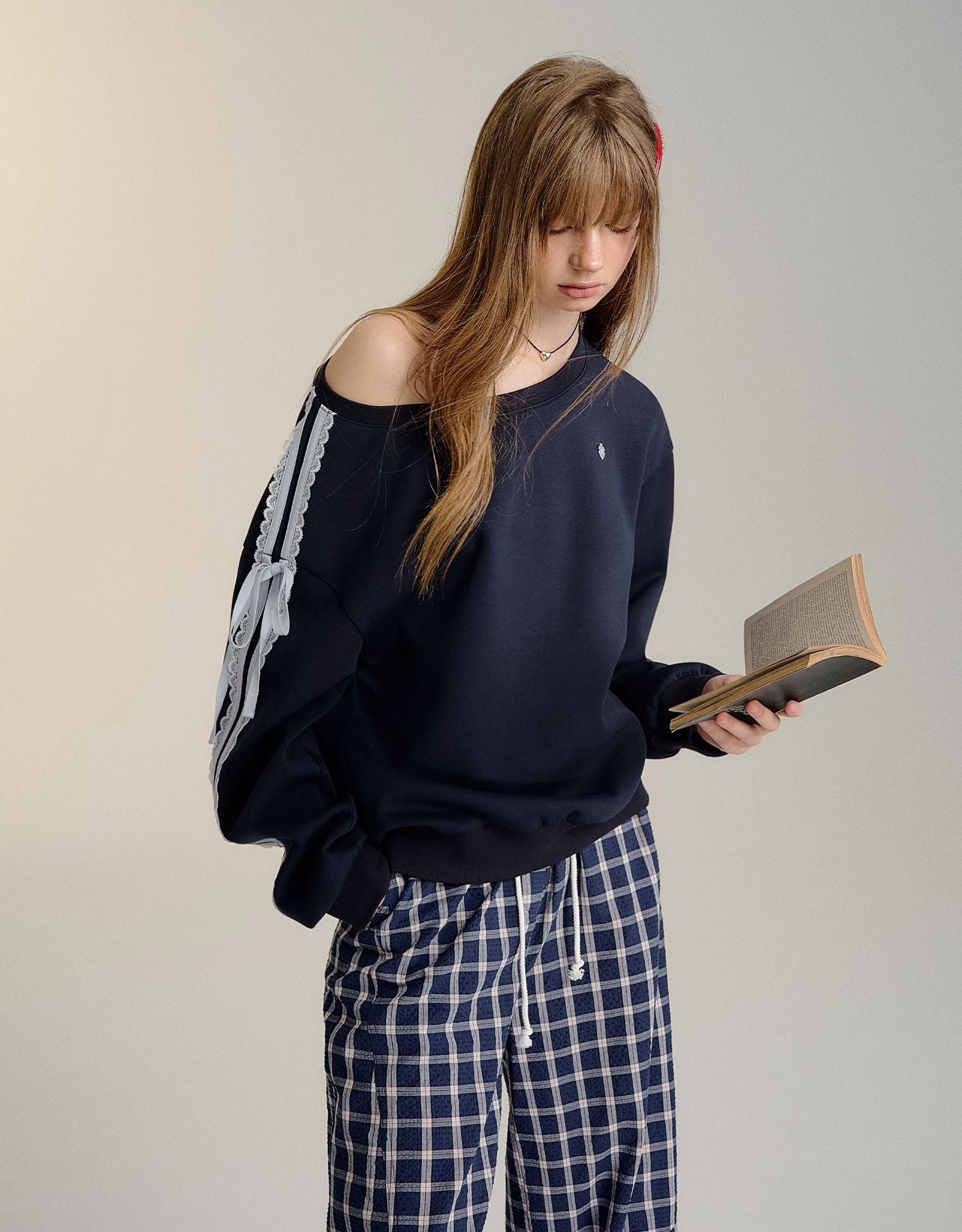 SOMESOWE 2409 蕾丝蝴蝶结露肩长袖卫衣 藏青