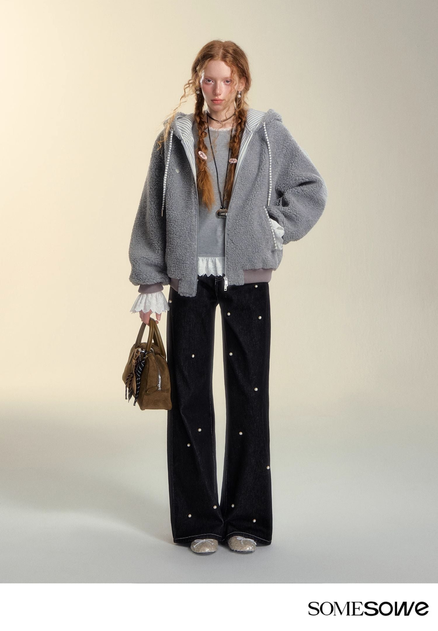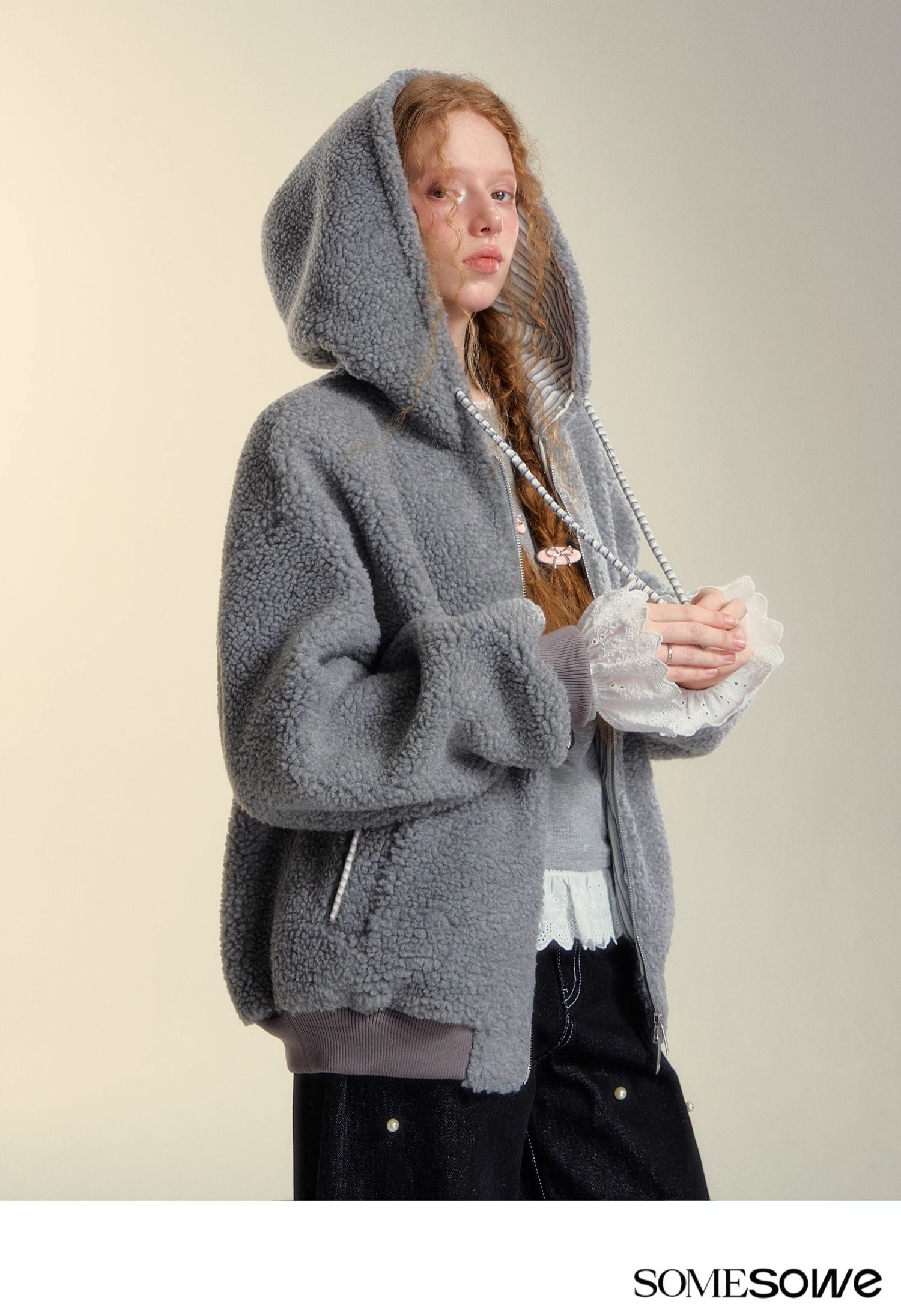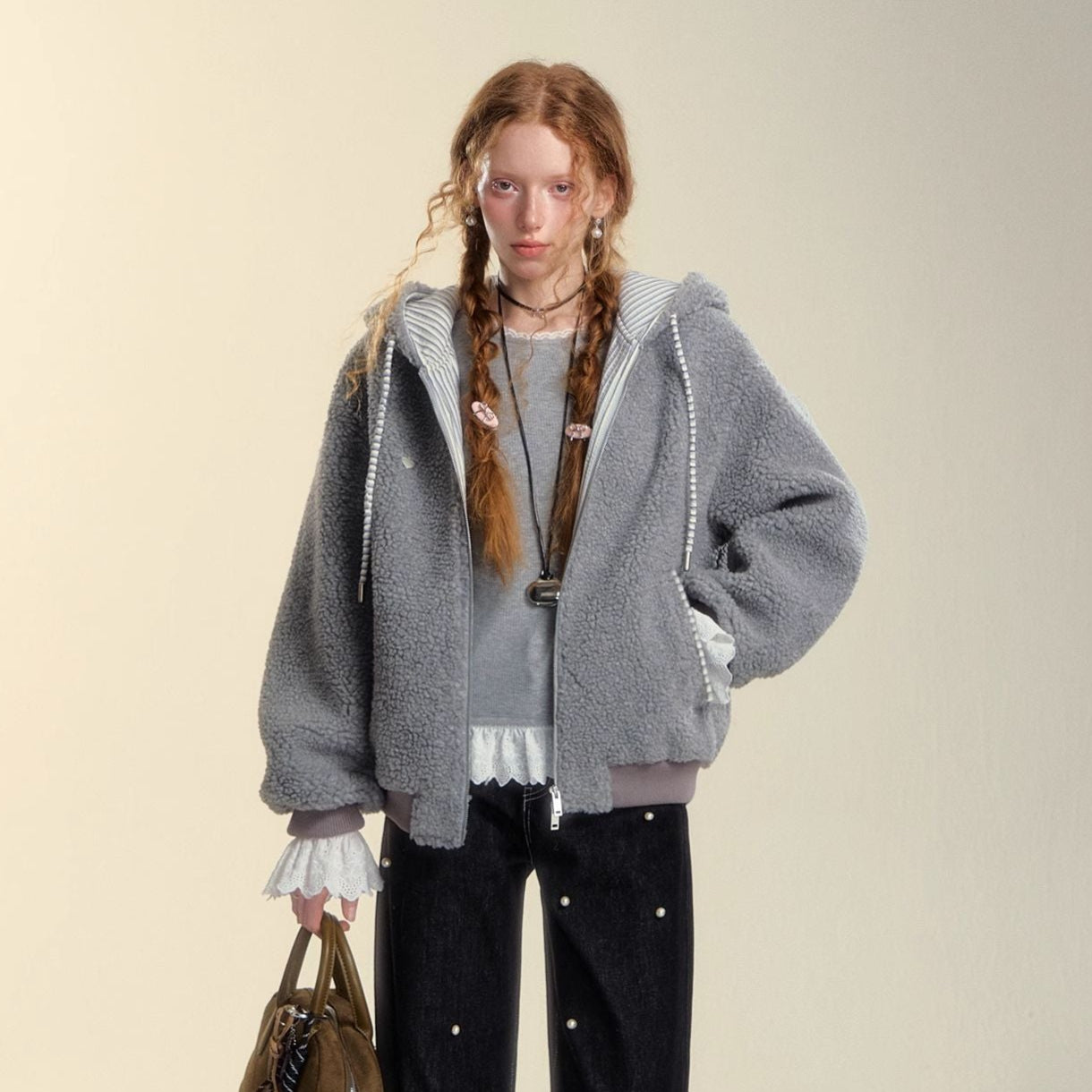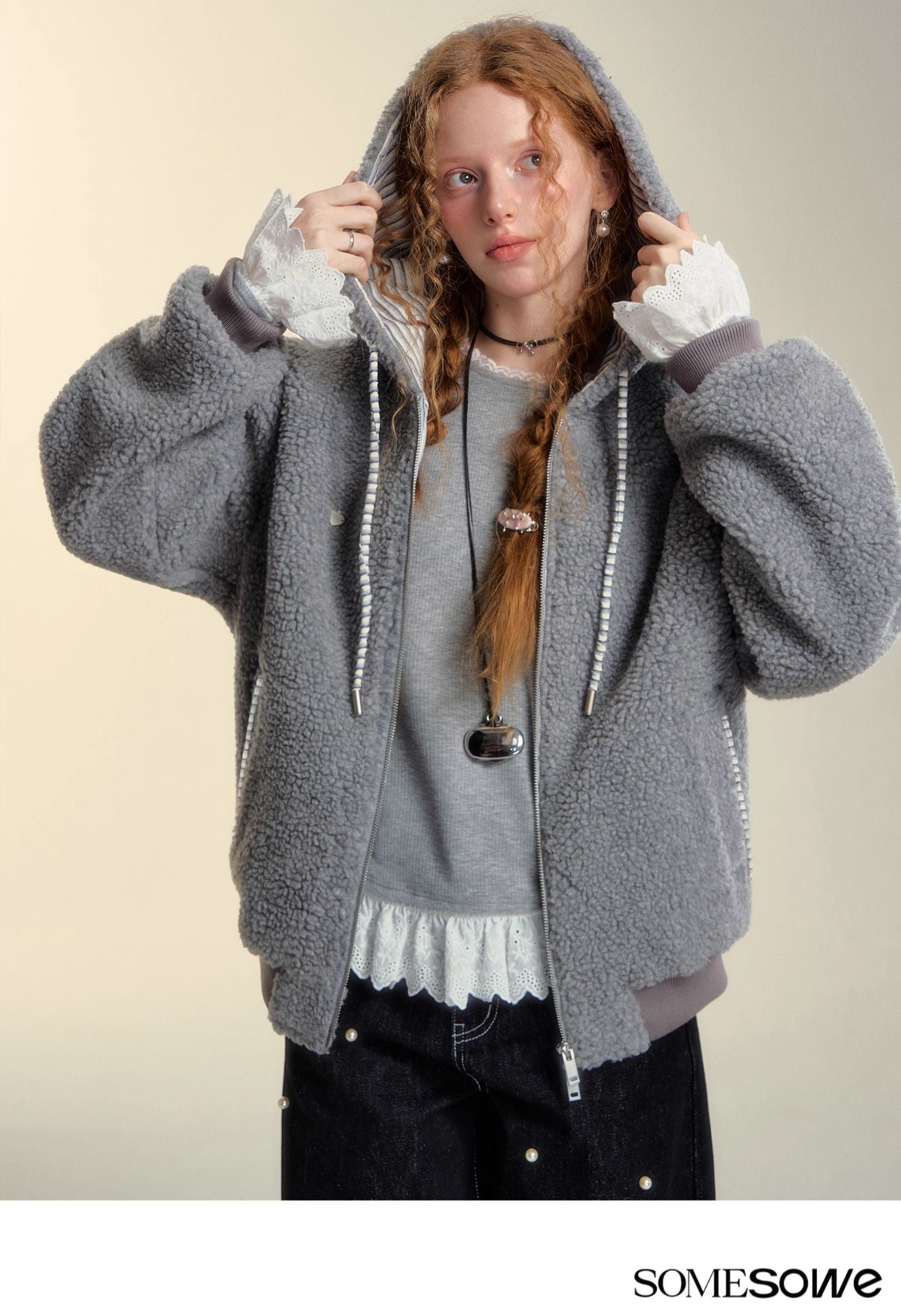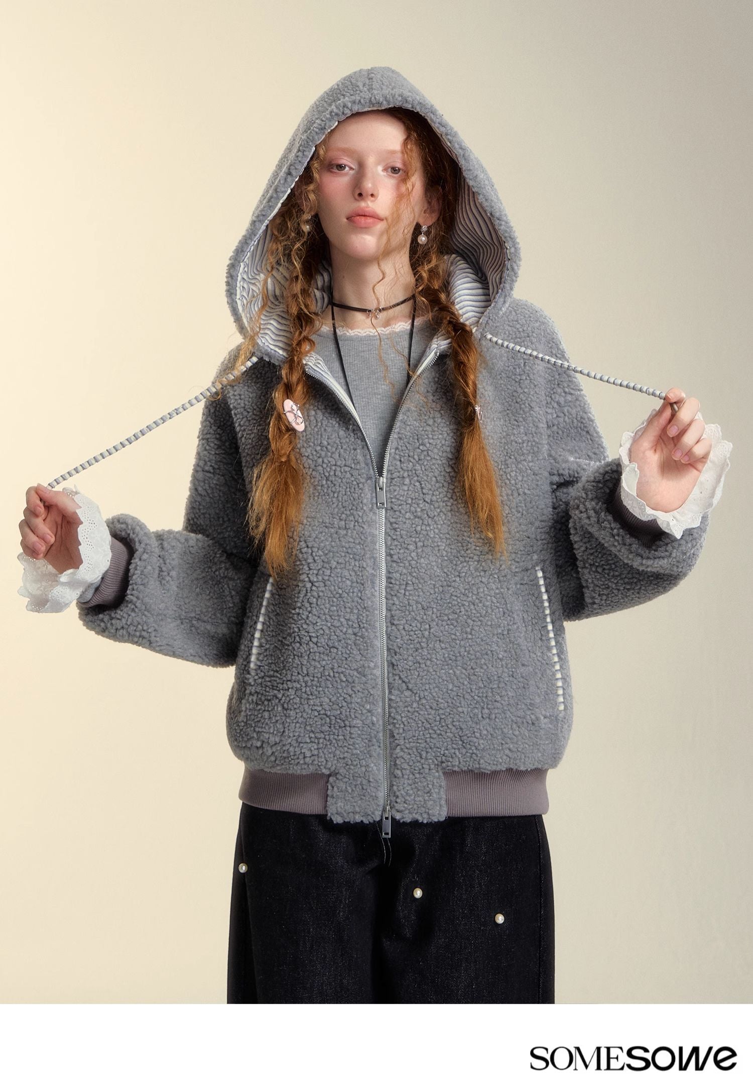 SOMESOWE 2501 条纹拼色摇粒绒连帽外套 灰