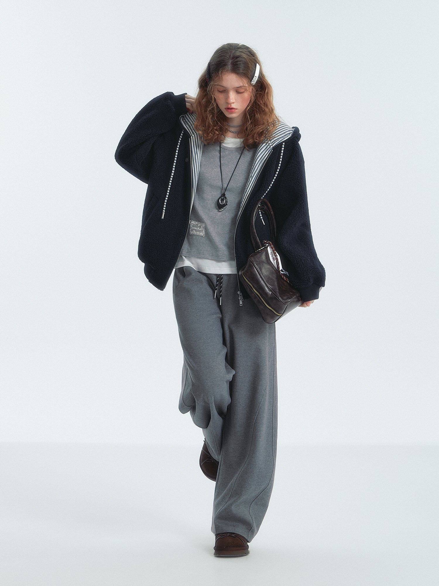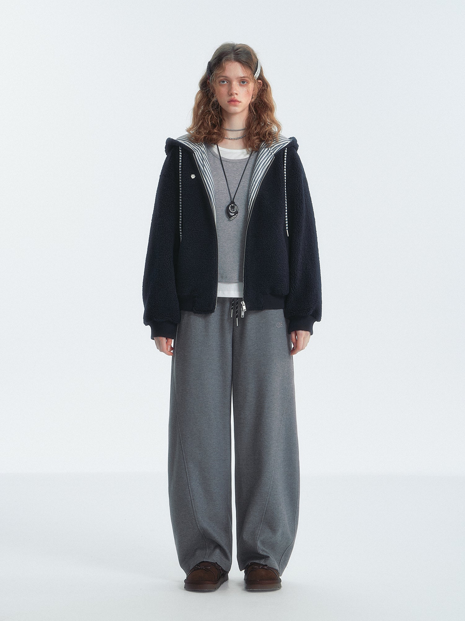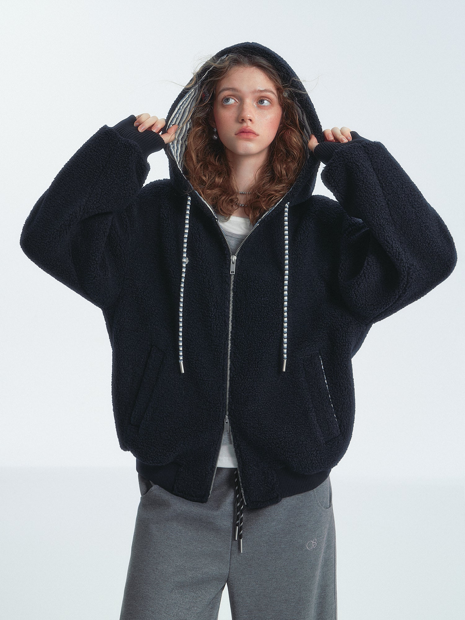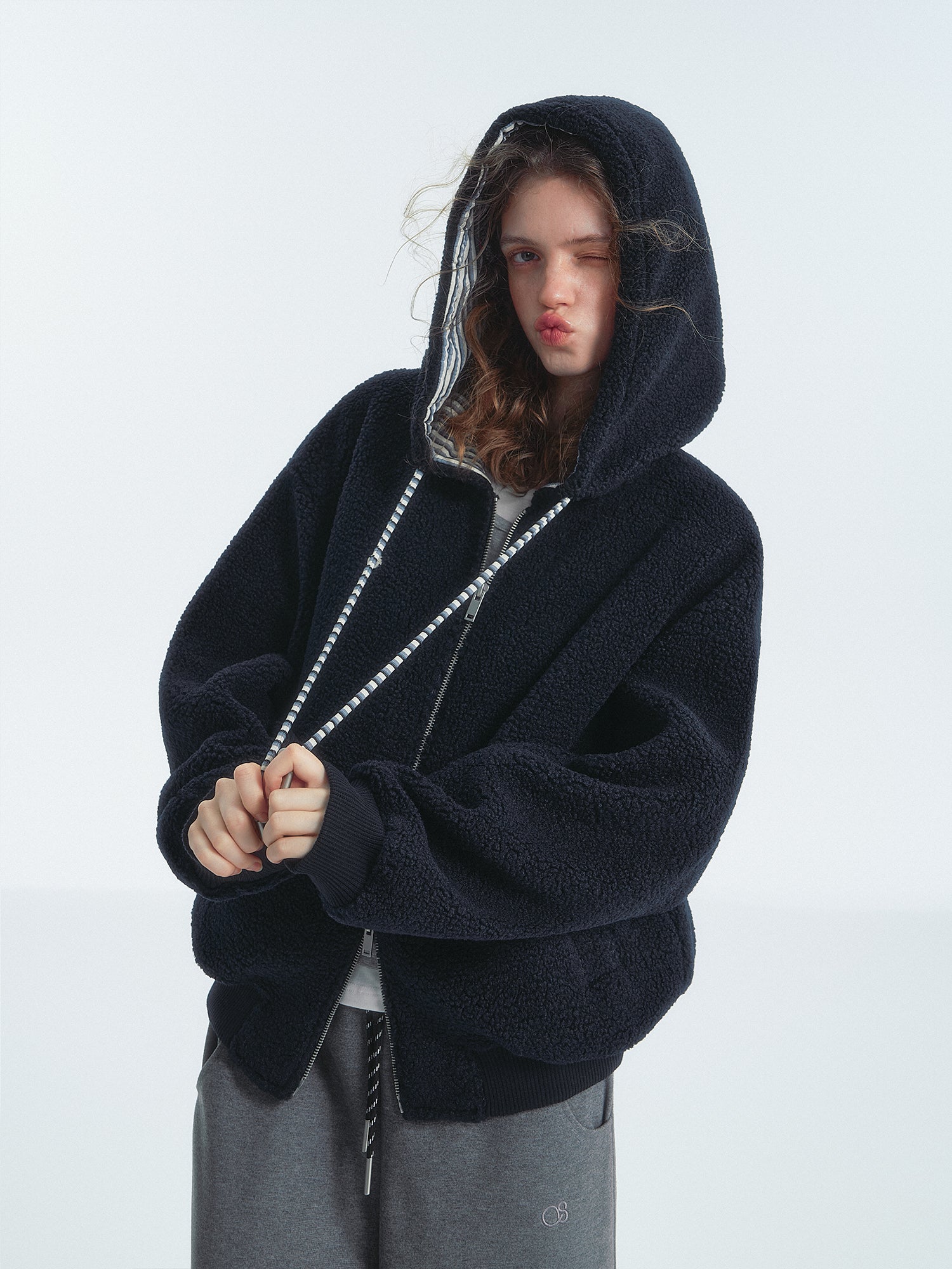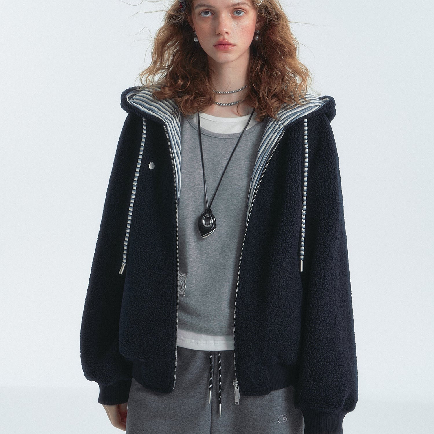 SOMESOWE 2501 条纹拼色摇粒绒连帽外套 藏青lo