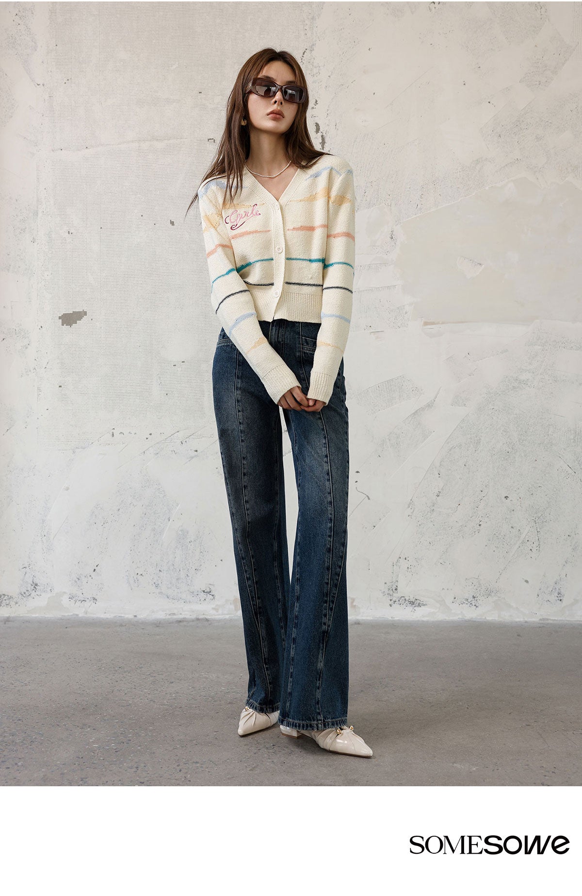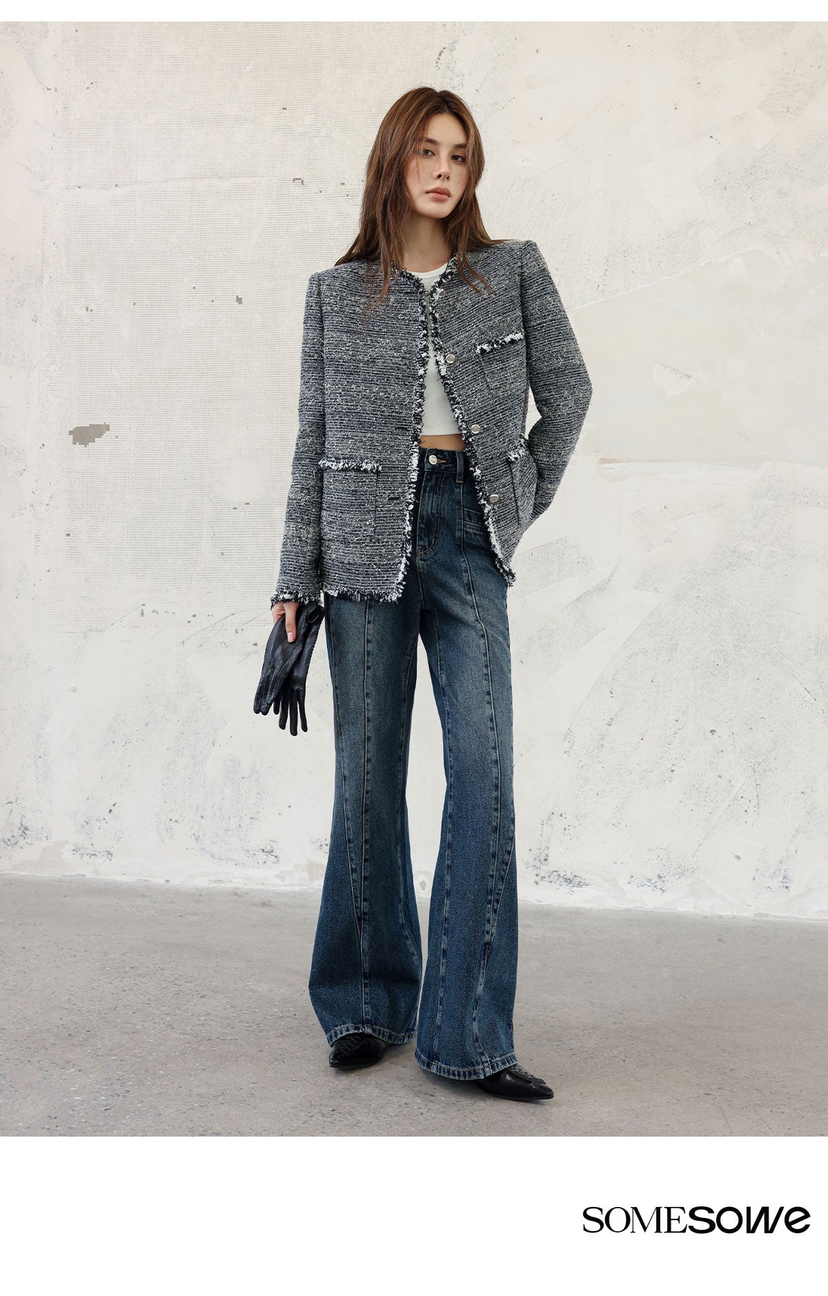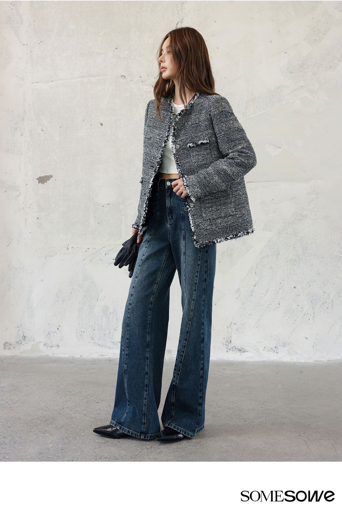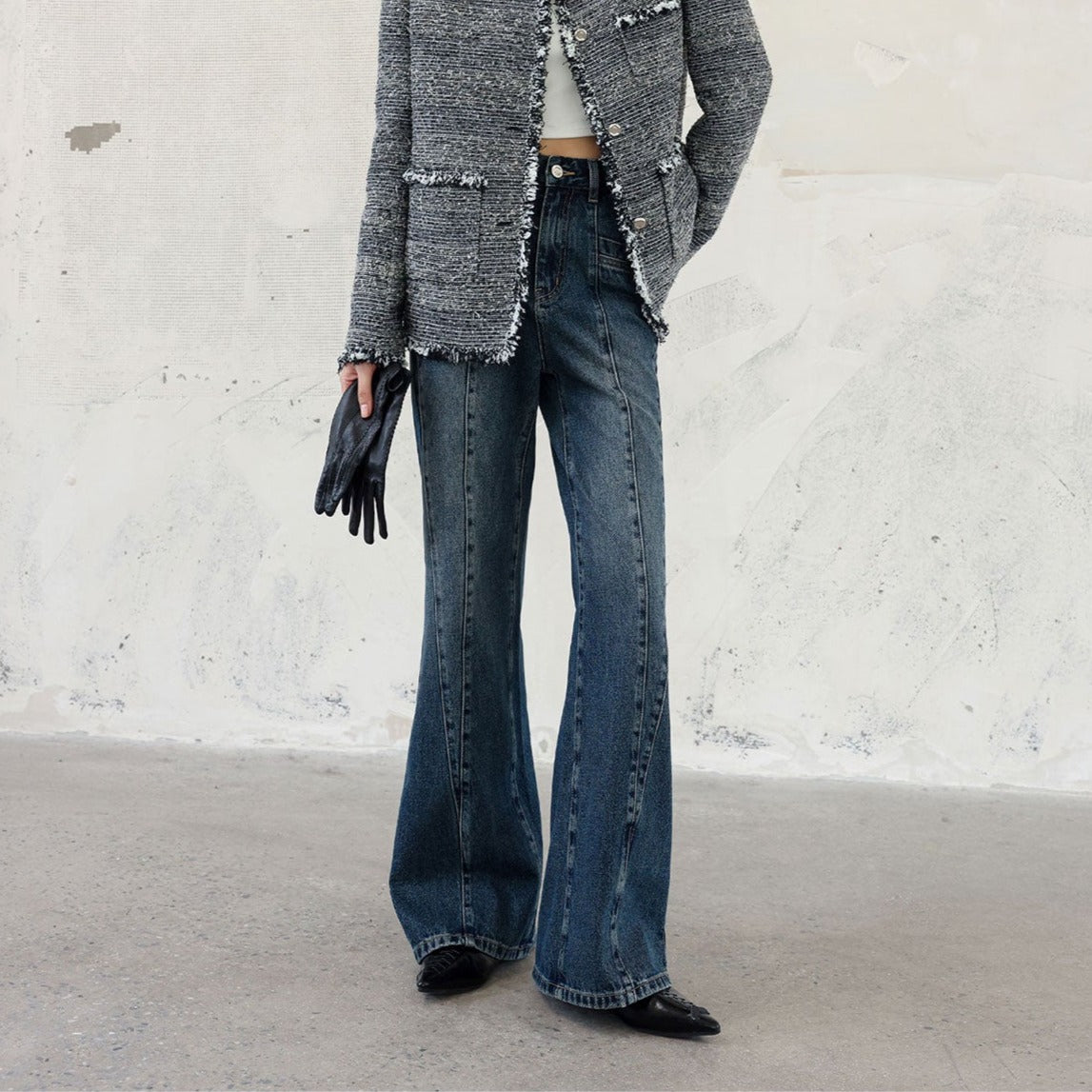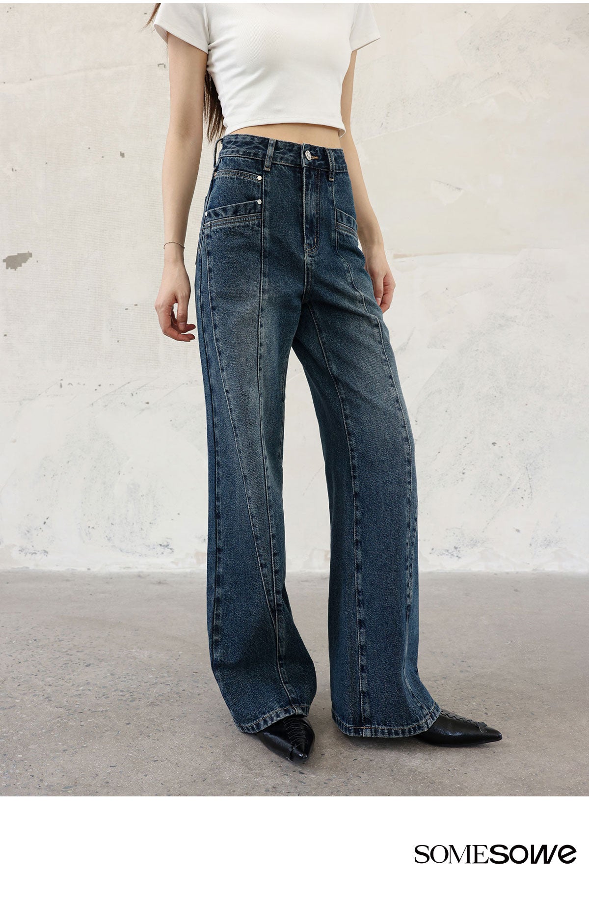 SOMESOWE SS2309 多片拼缝牛仔微喇阔腿裤 深蓝