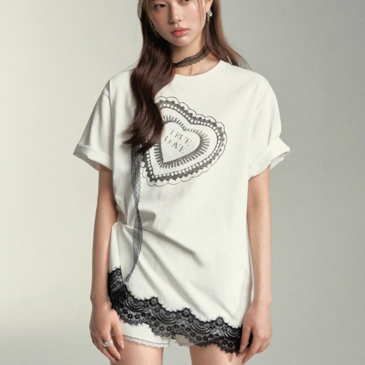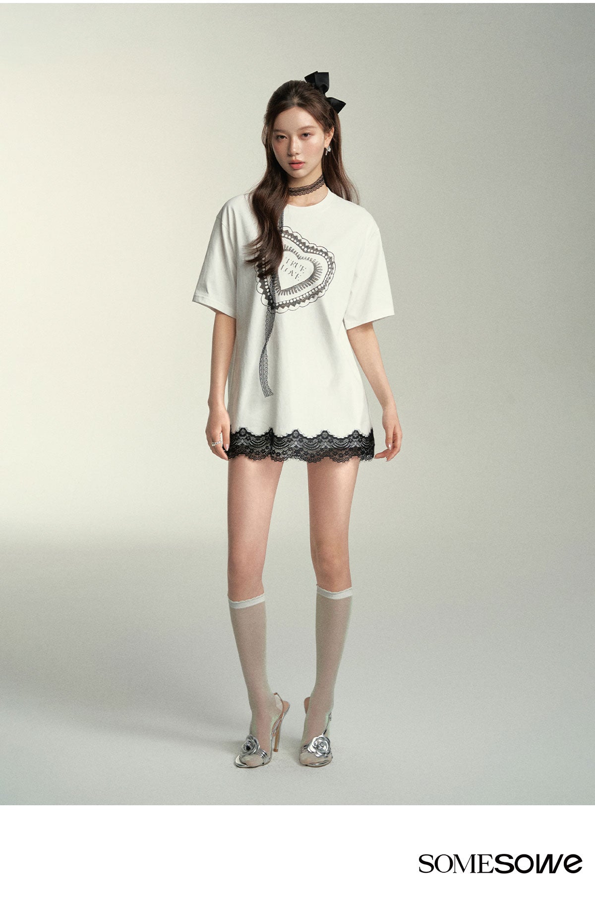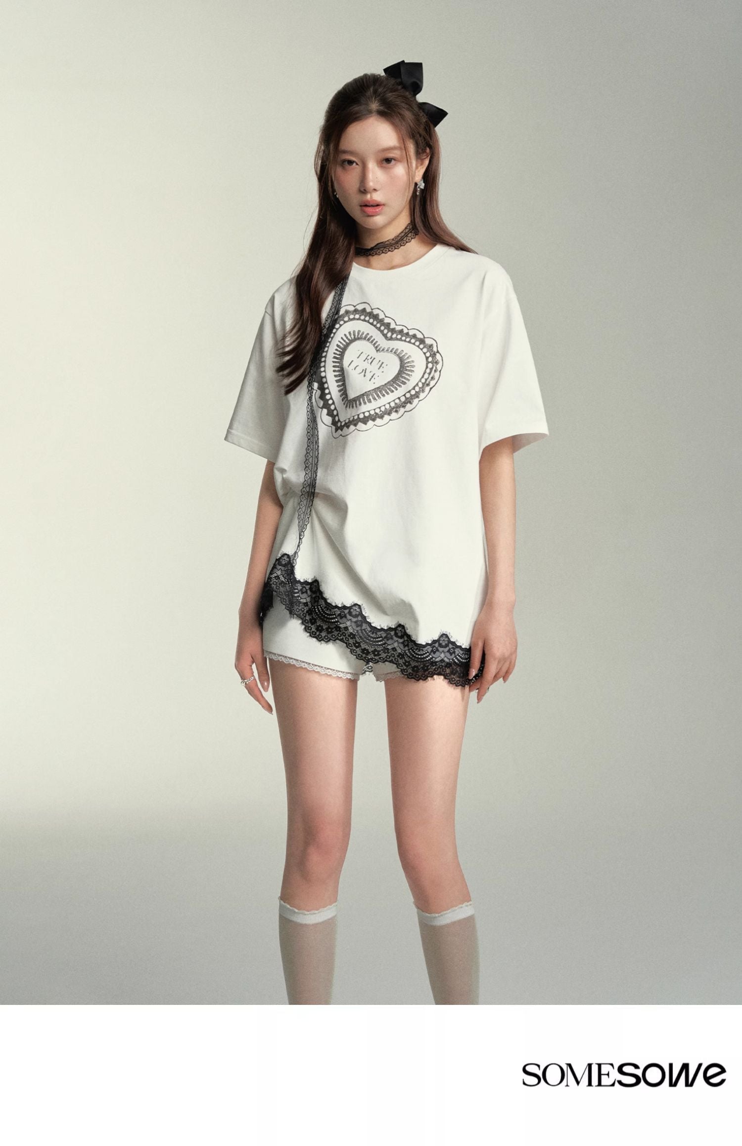 SOMESOWE SS2404 立体蕾丝爱心印花T恤 白