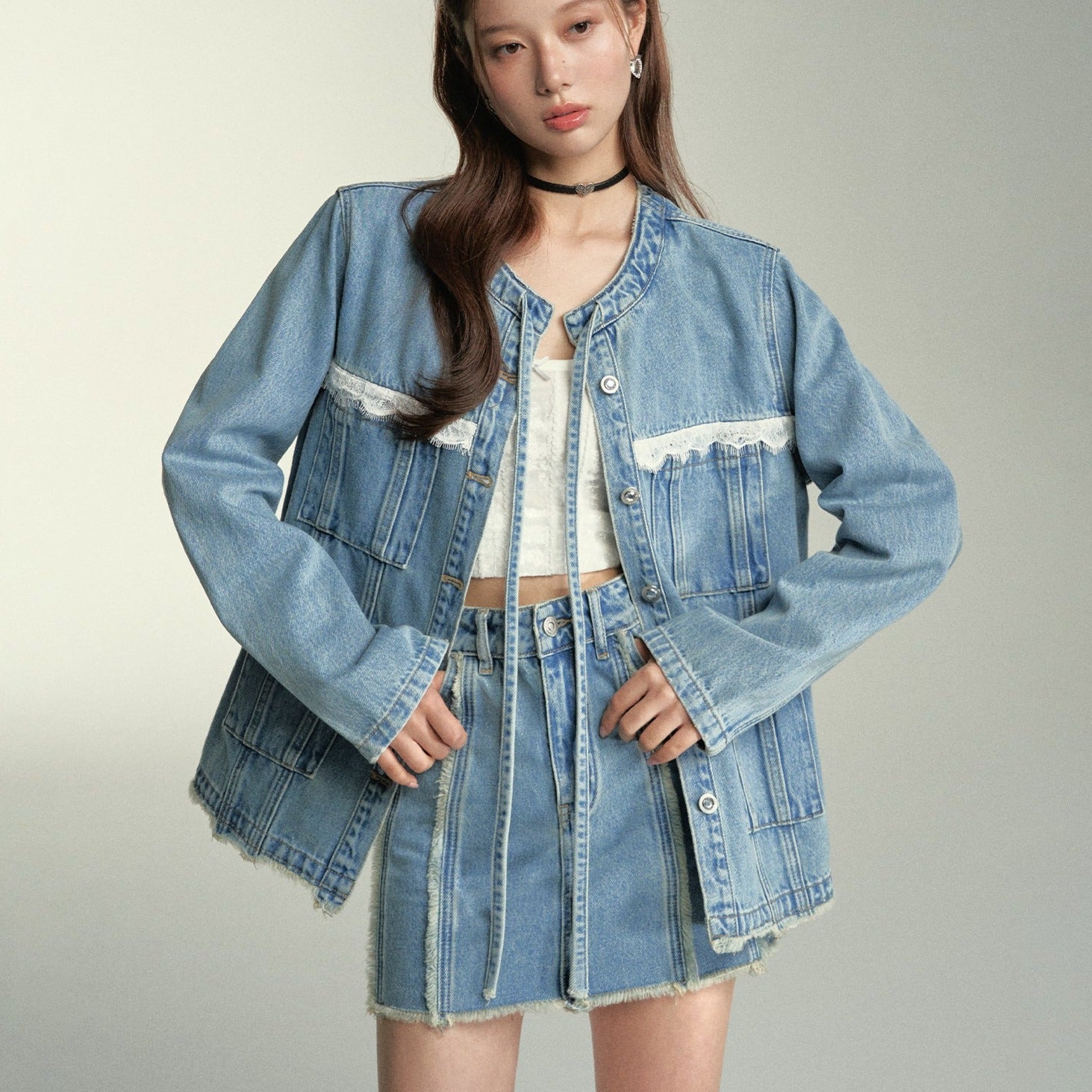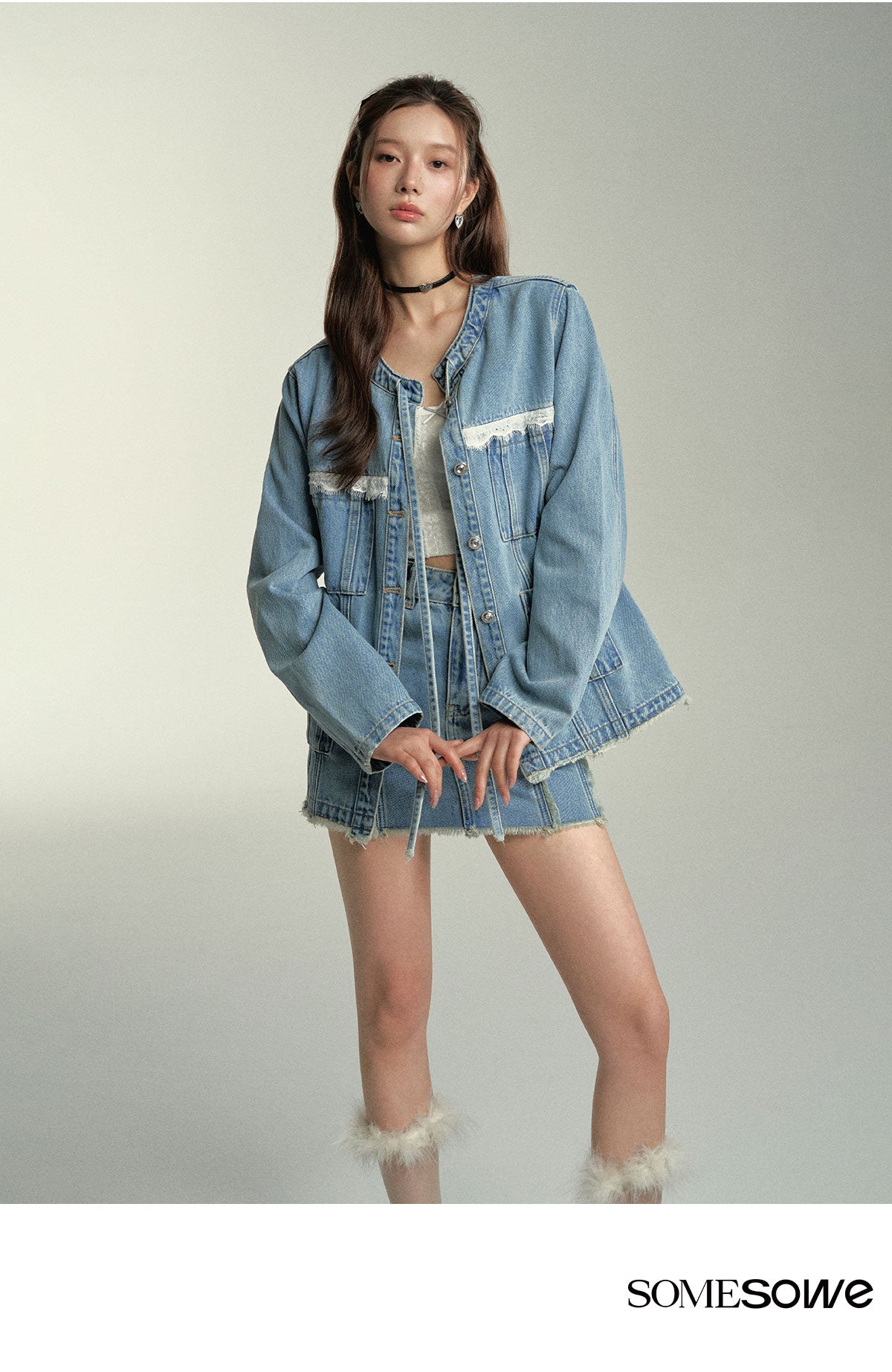 SOMESOWE SS2404 蕾丝拼接破缝须边牛仔外套 蓝