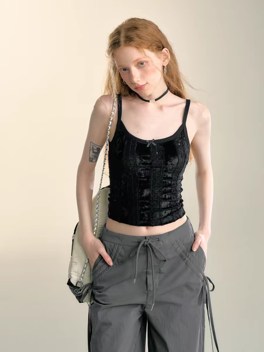 SOMESOWE SS2404 蝴蝶结蕾丝肌理吊带 黑
