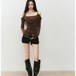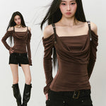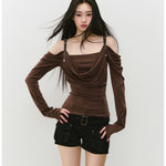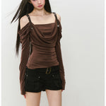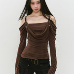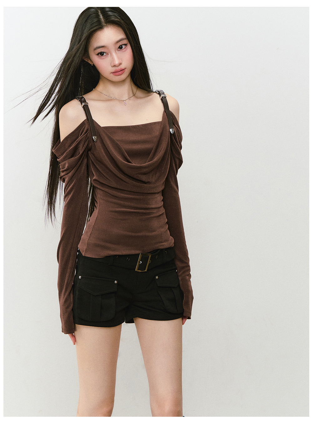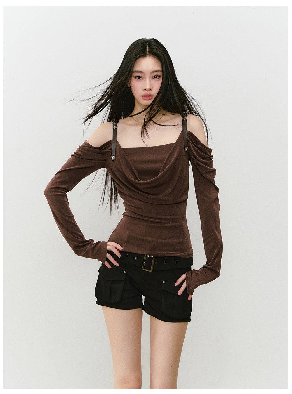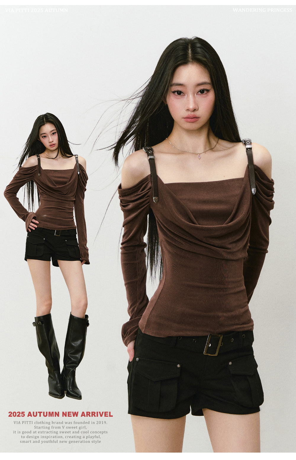 VIA PITTI 2509 露肩皮带荡领撒银针织上衣 咖
