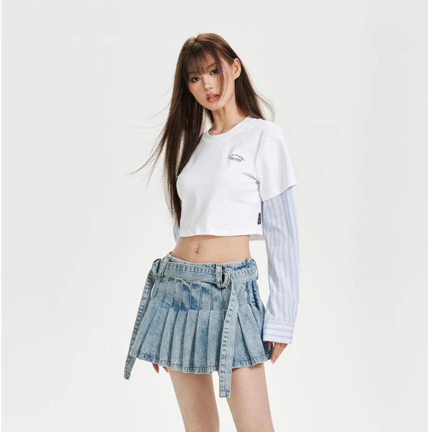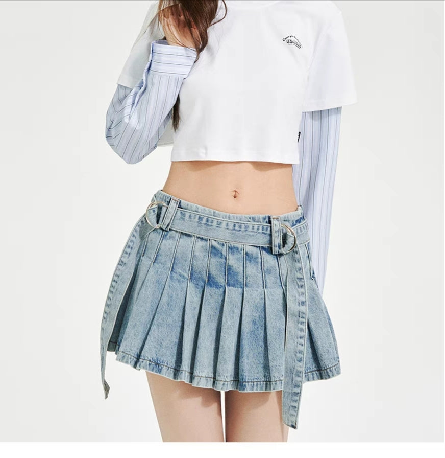 VIA PITTI SS2306 设计感绑带牛仔百褶短裙
