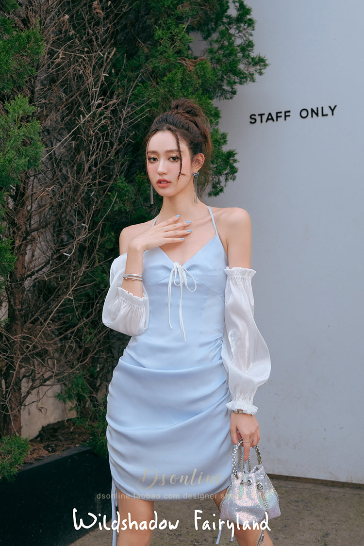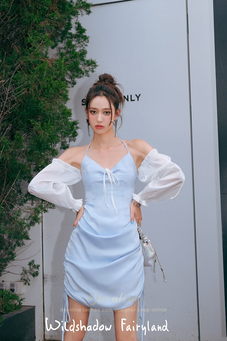 WILDSHADOW SS2307 丝滑长袖吊带蓝白裙