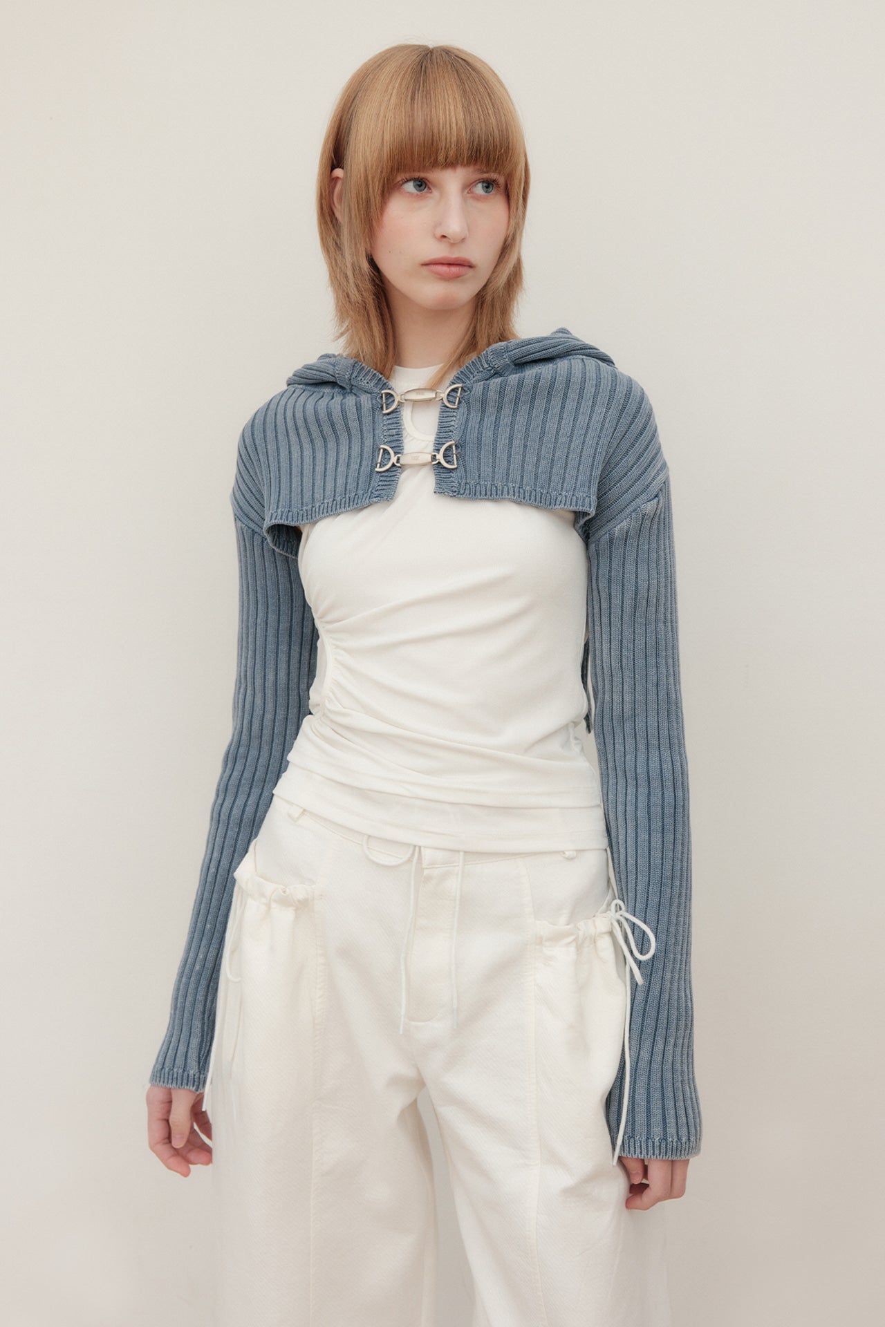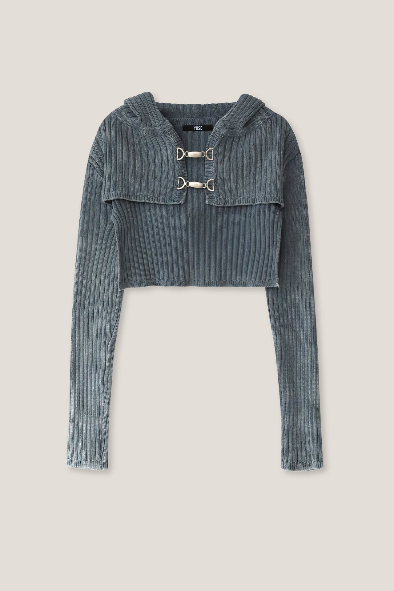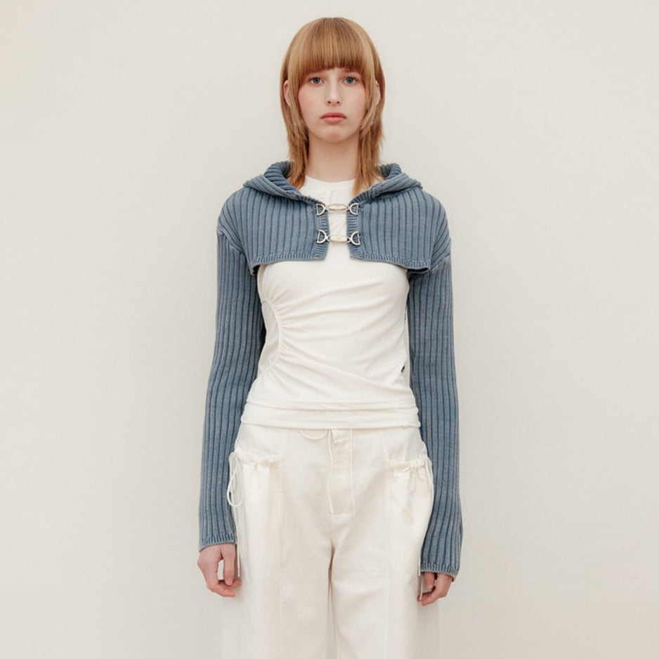 YUSE 2404 DENIM WASHING HOODIE BOLERO KNIT TOP - INDIGO