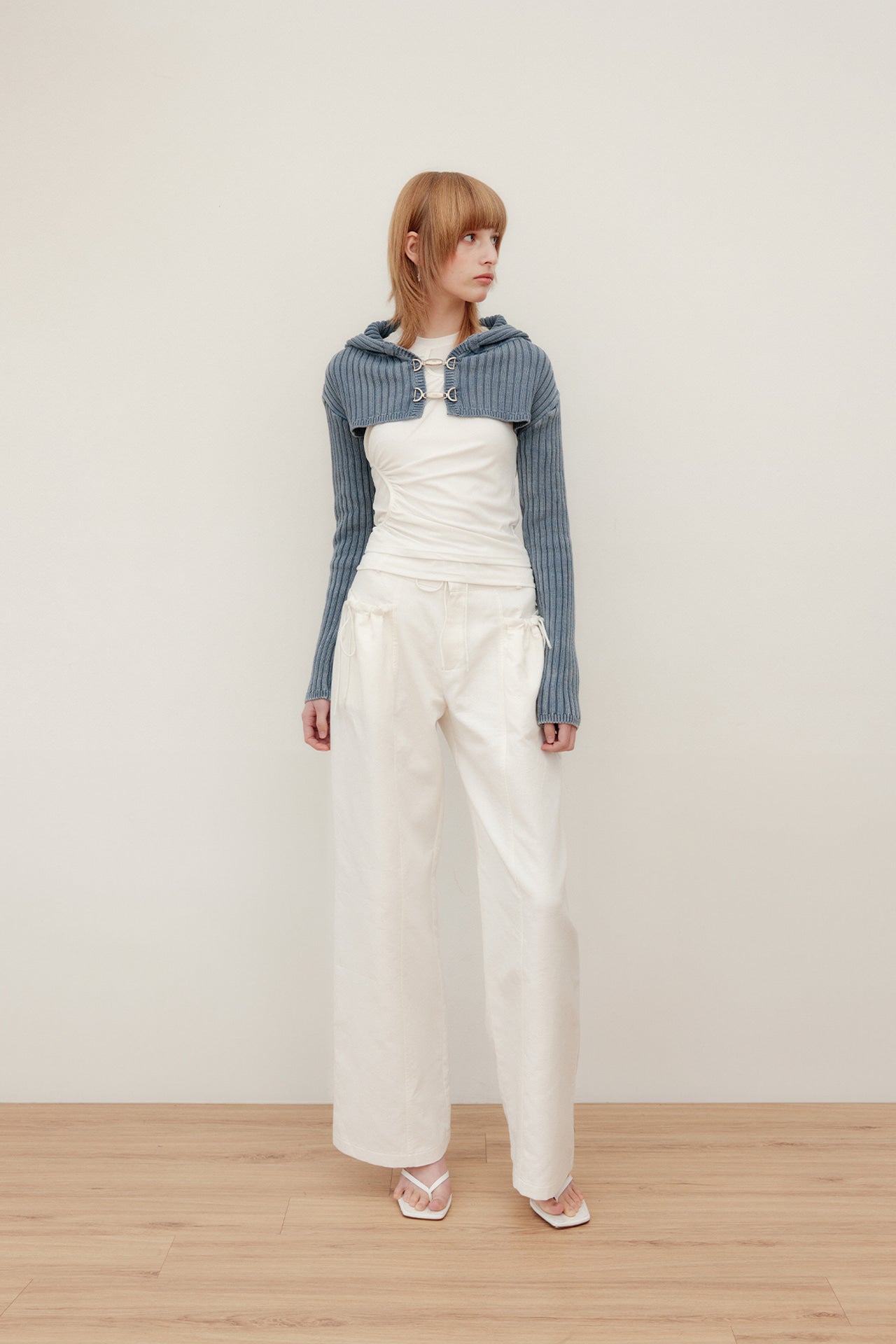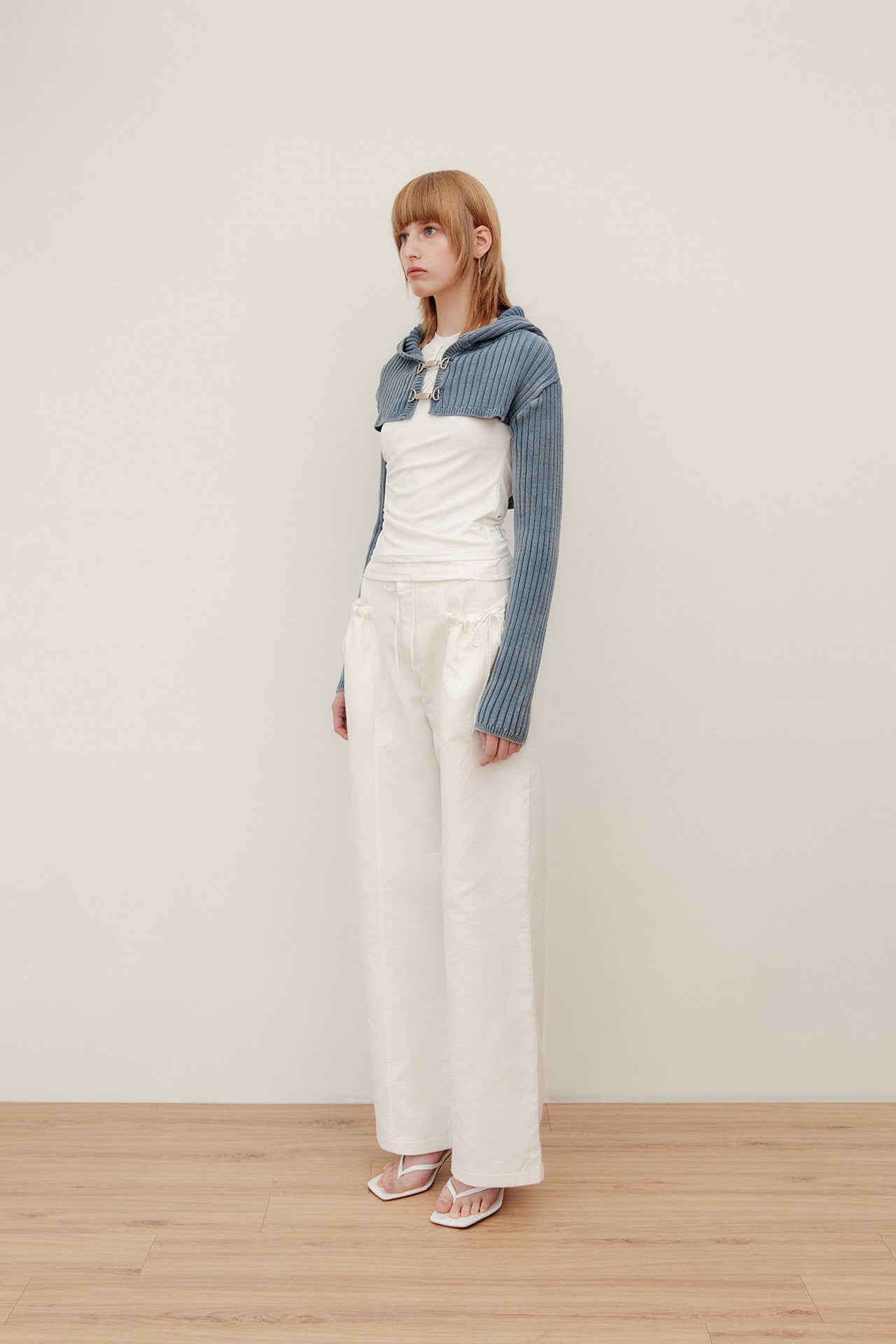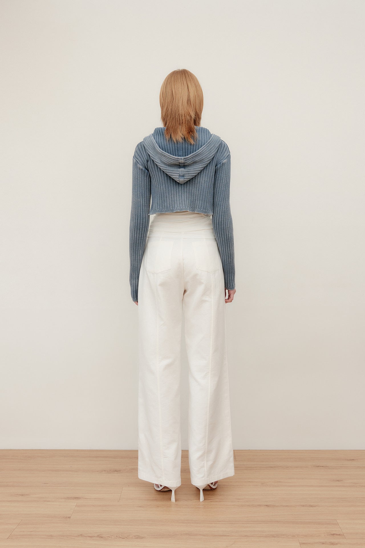 YUSE 2404 DENIM WASHING HOODIE BOLERO KNIT TOP - INDIGO
