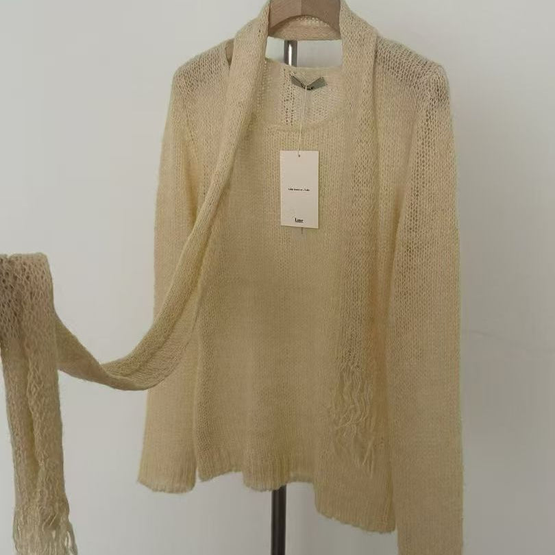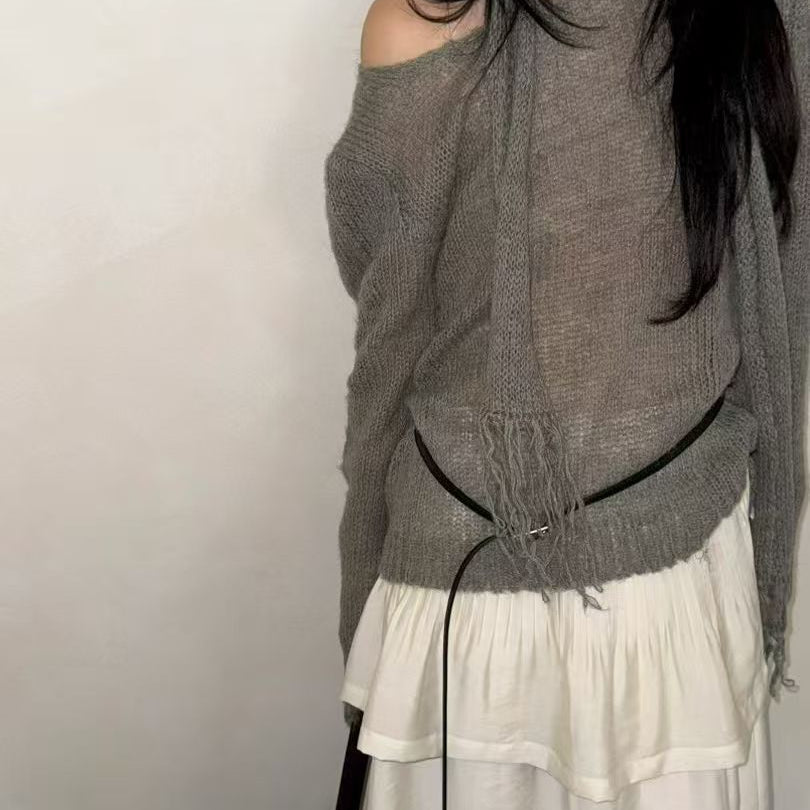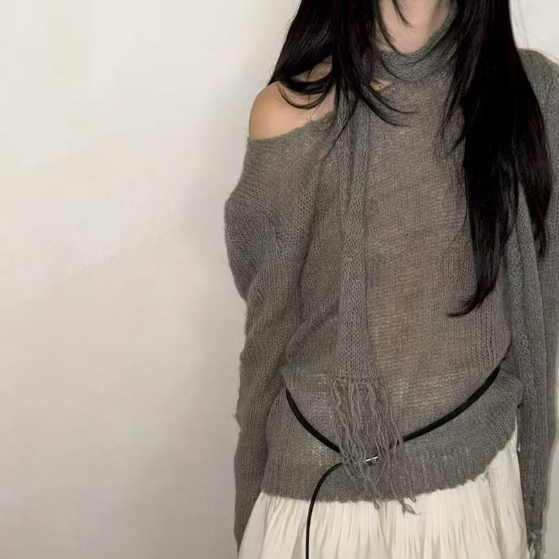 KOREAN COLLECTION 2510 可斜肩慵懒风围巾针织毛衣 浅灰