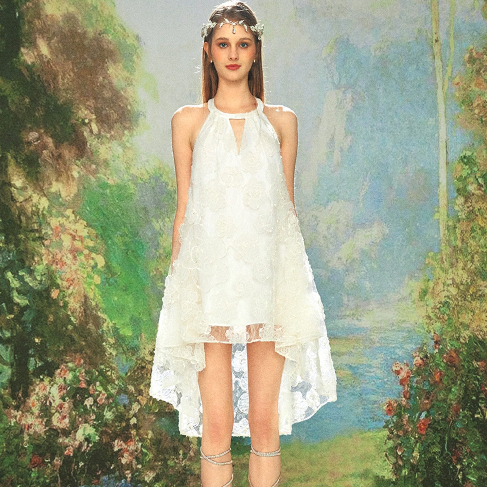 KINGWEN 2602 白色提花挂脖镂空露背连衣裙