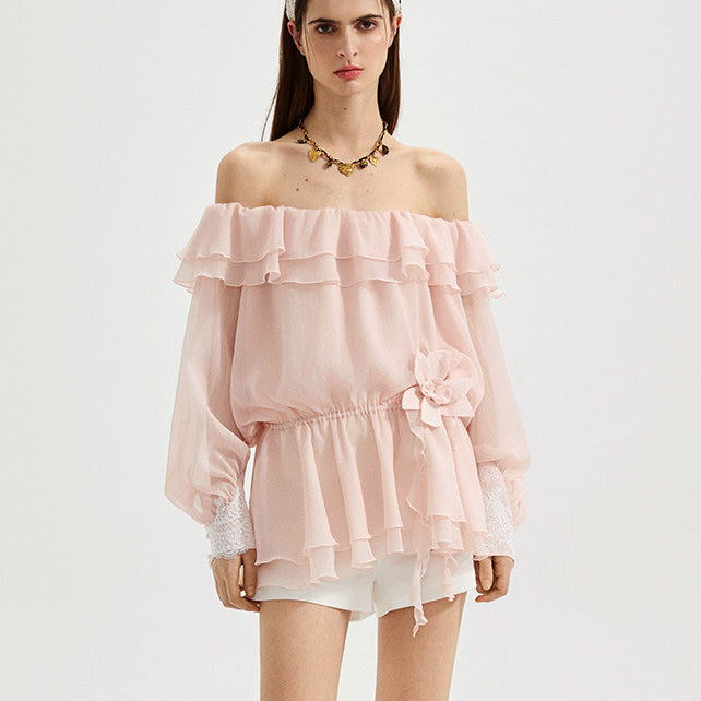 KINGWEN 2602 粉色细闪鸢尾一字肩长袖上衣
