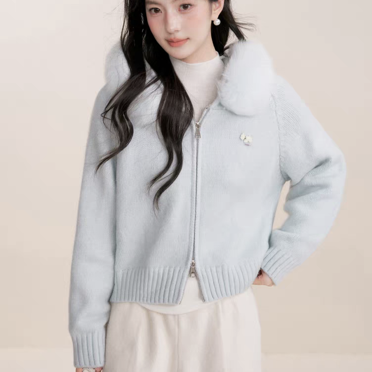 Kroche 2512 连帽大毛领双拉头加厚毛衣外套