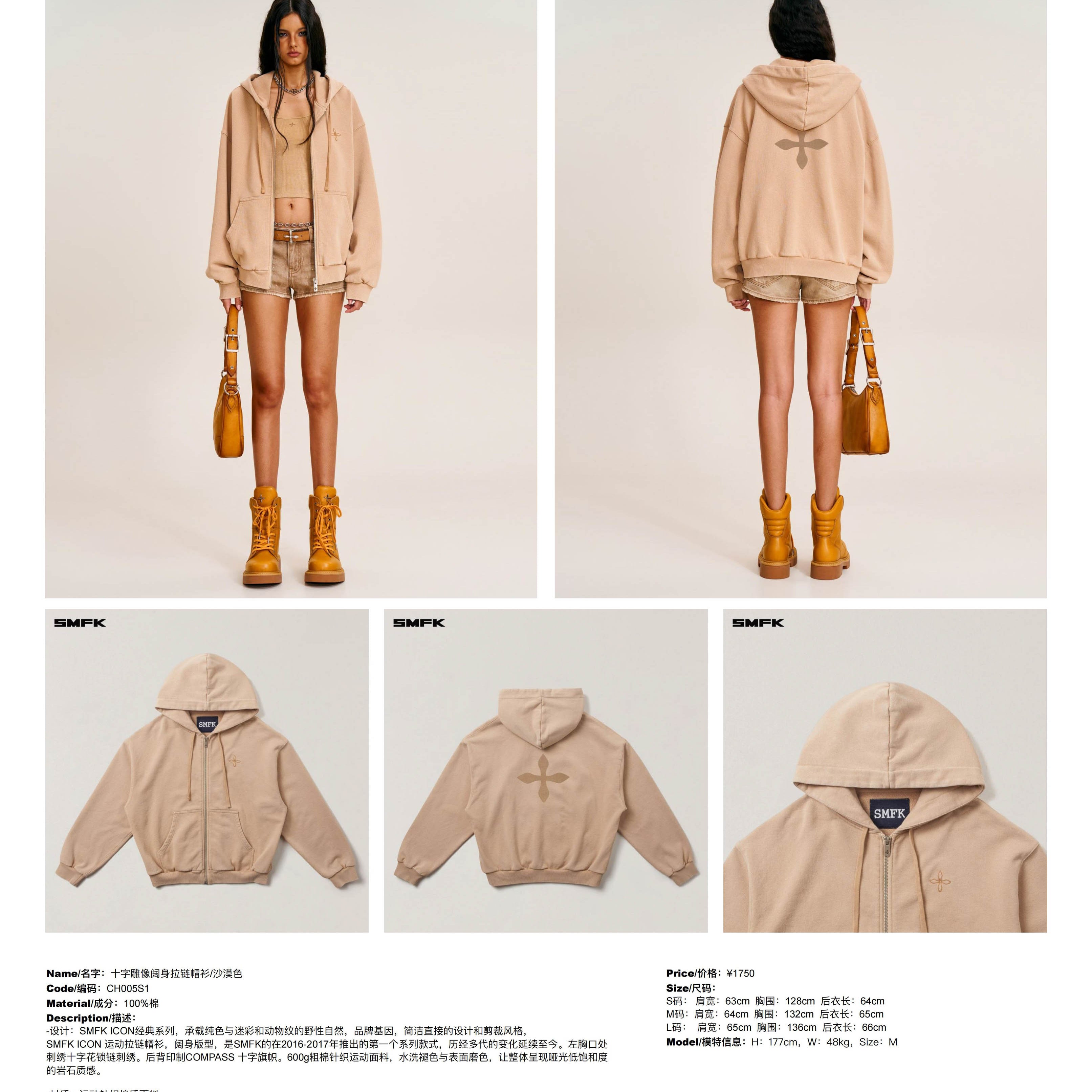 SMFK 2510十字雕像阔身拉链帽衫/沙漠色