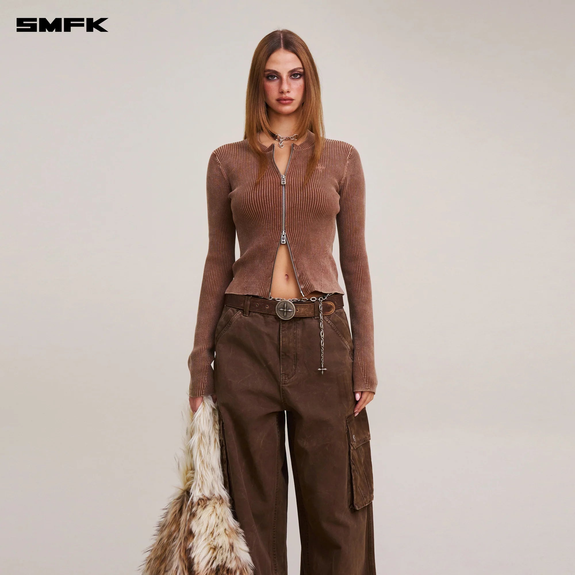 SMFK 2512 野性复古双拉链针织开衫 湮灭棕