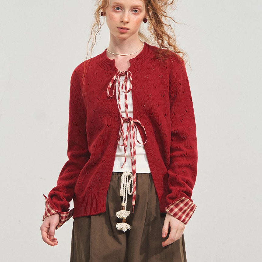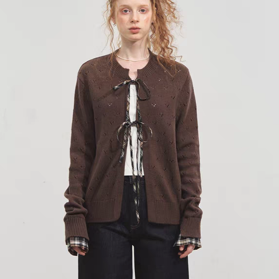 SOMESOWE 2510 复古格纹系带开衫 咖