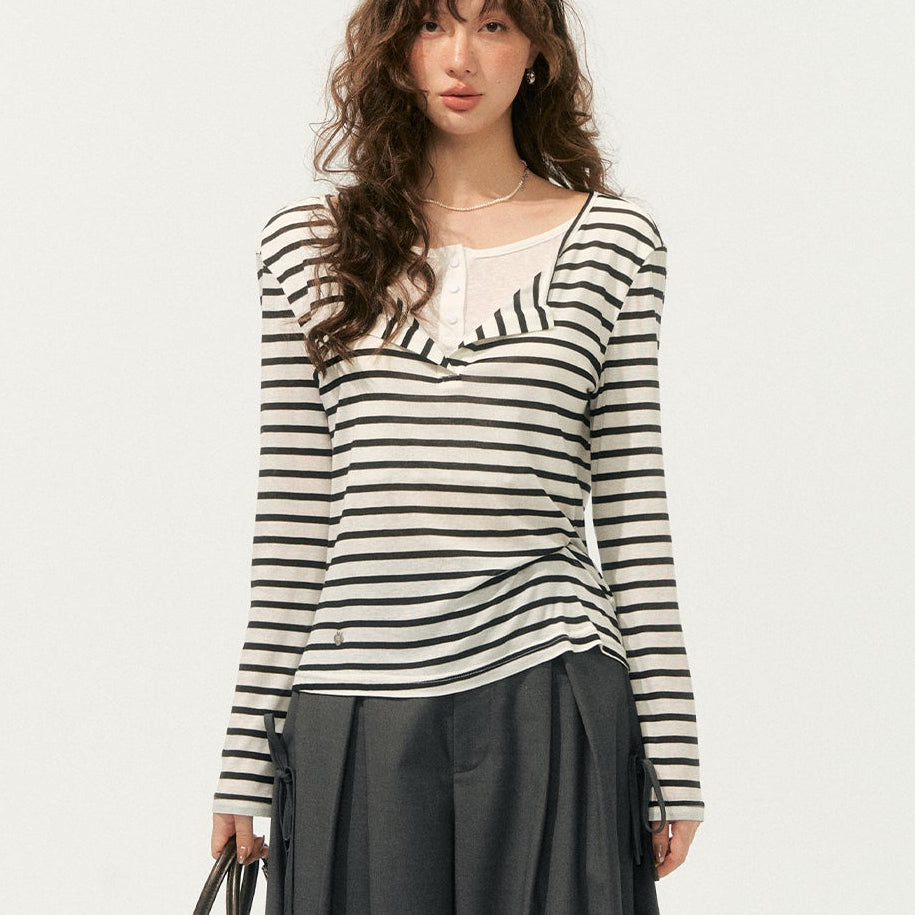 SOMESOWE 2510 假两件V荡领条纹长袖T恤