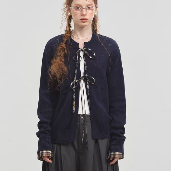 SOMESOWE 2510 复古格纹系带开衫 藏蓝
