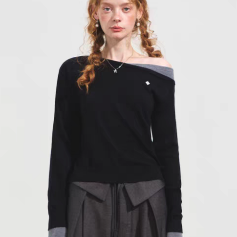 SOMESOWE 2510 撞色斜肩假两件毛衣 黑