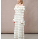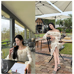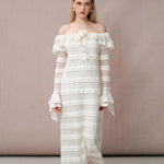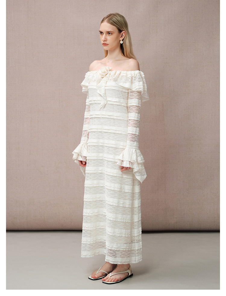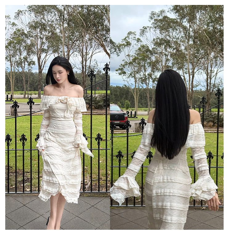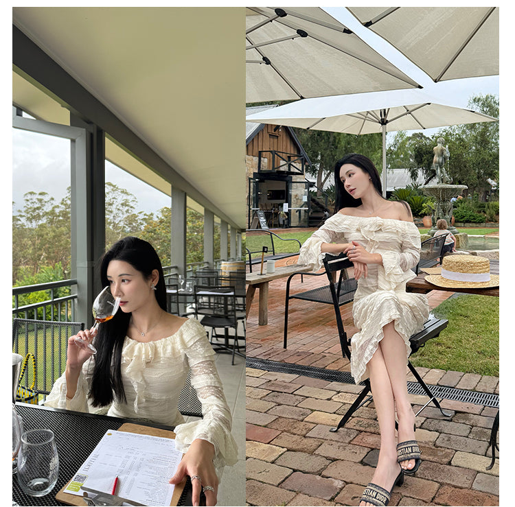DIANA VEVINA 一字肩荷叶边大翻领蕾丝连衣裙