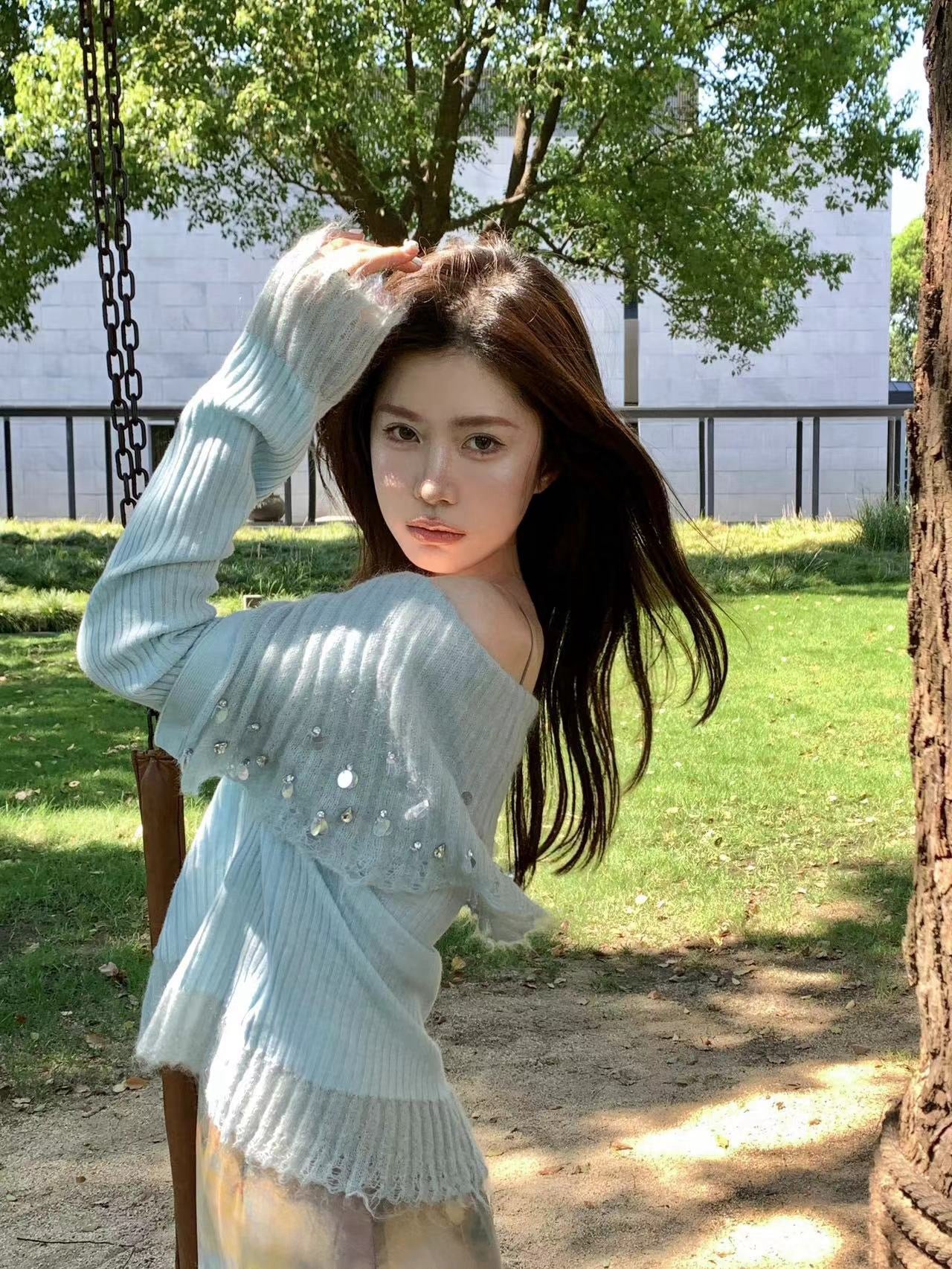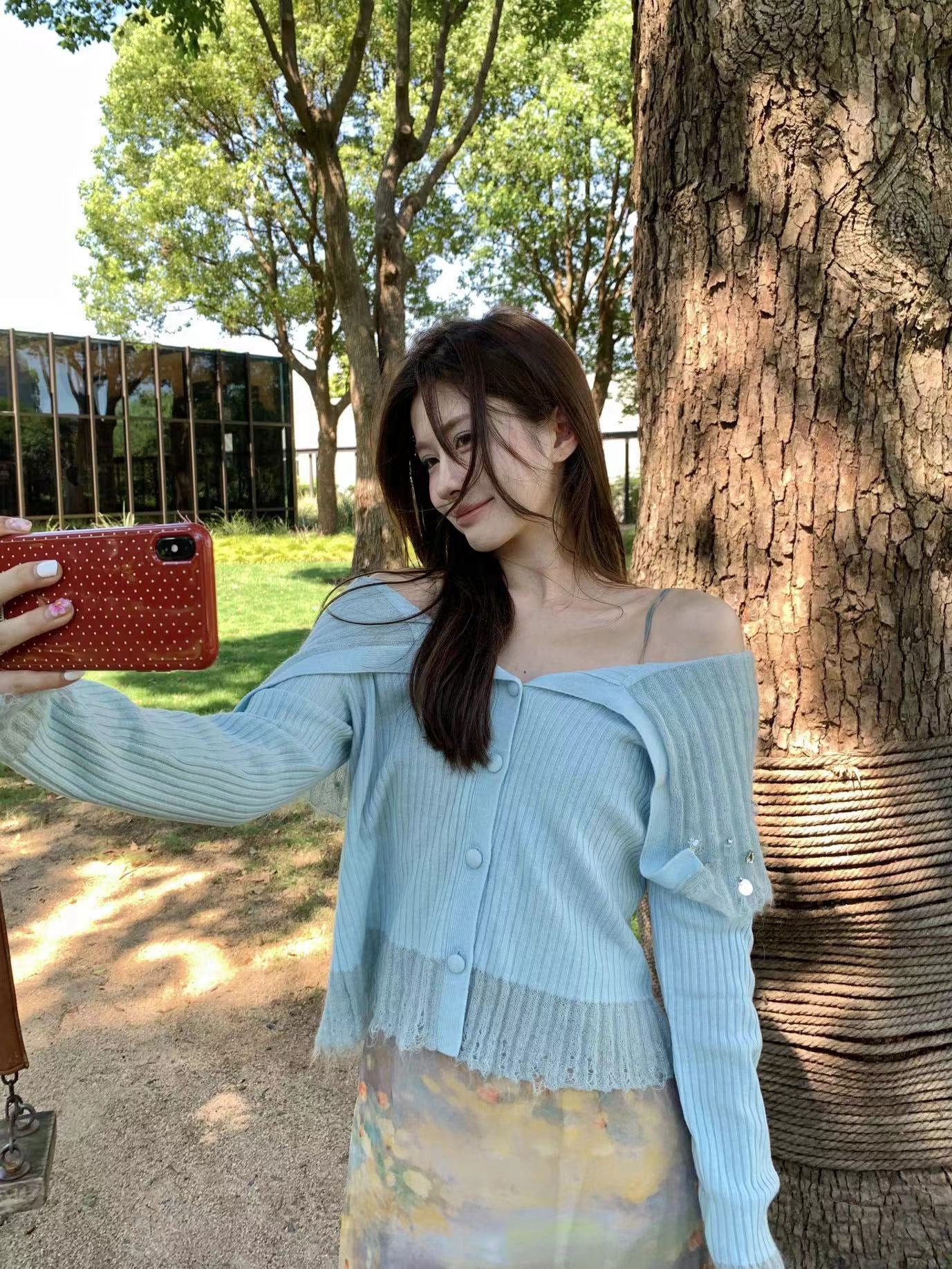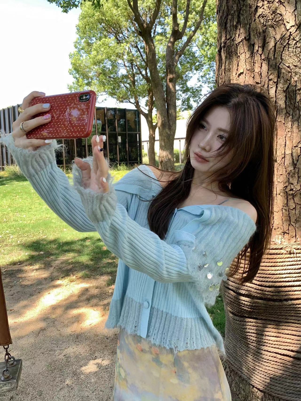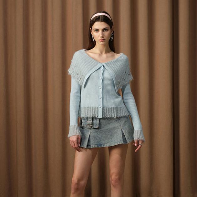 DIANA VEVINA 温柔大翻领软糯毛衣开衫 蓝