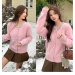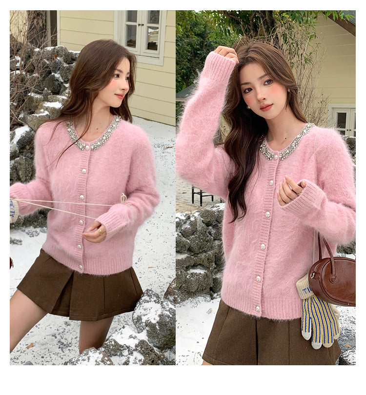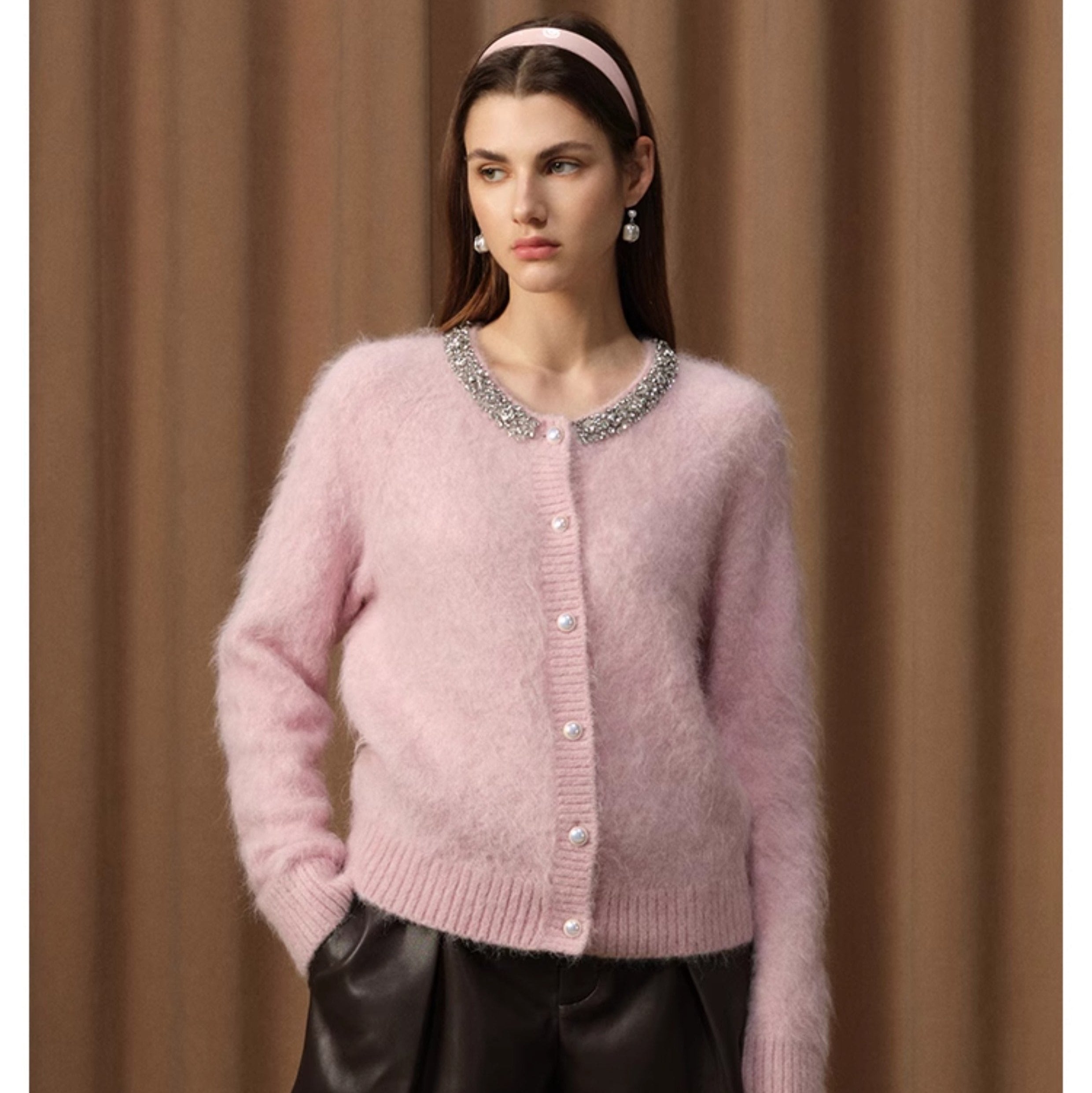 DIANA VEVINA 羊驼毛钻领珍珠扣针织衫 粉
