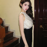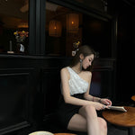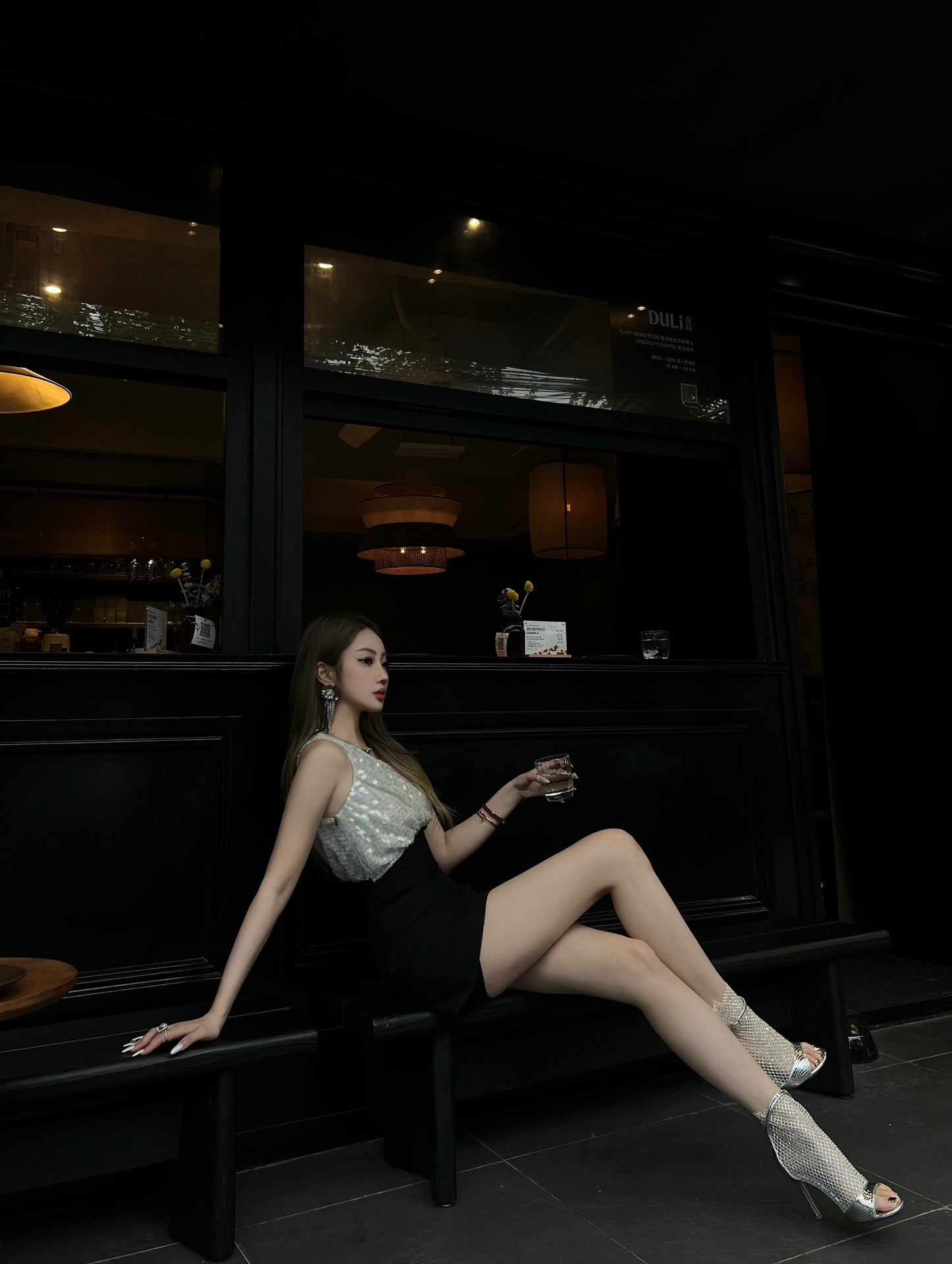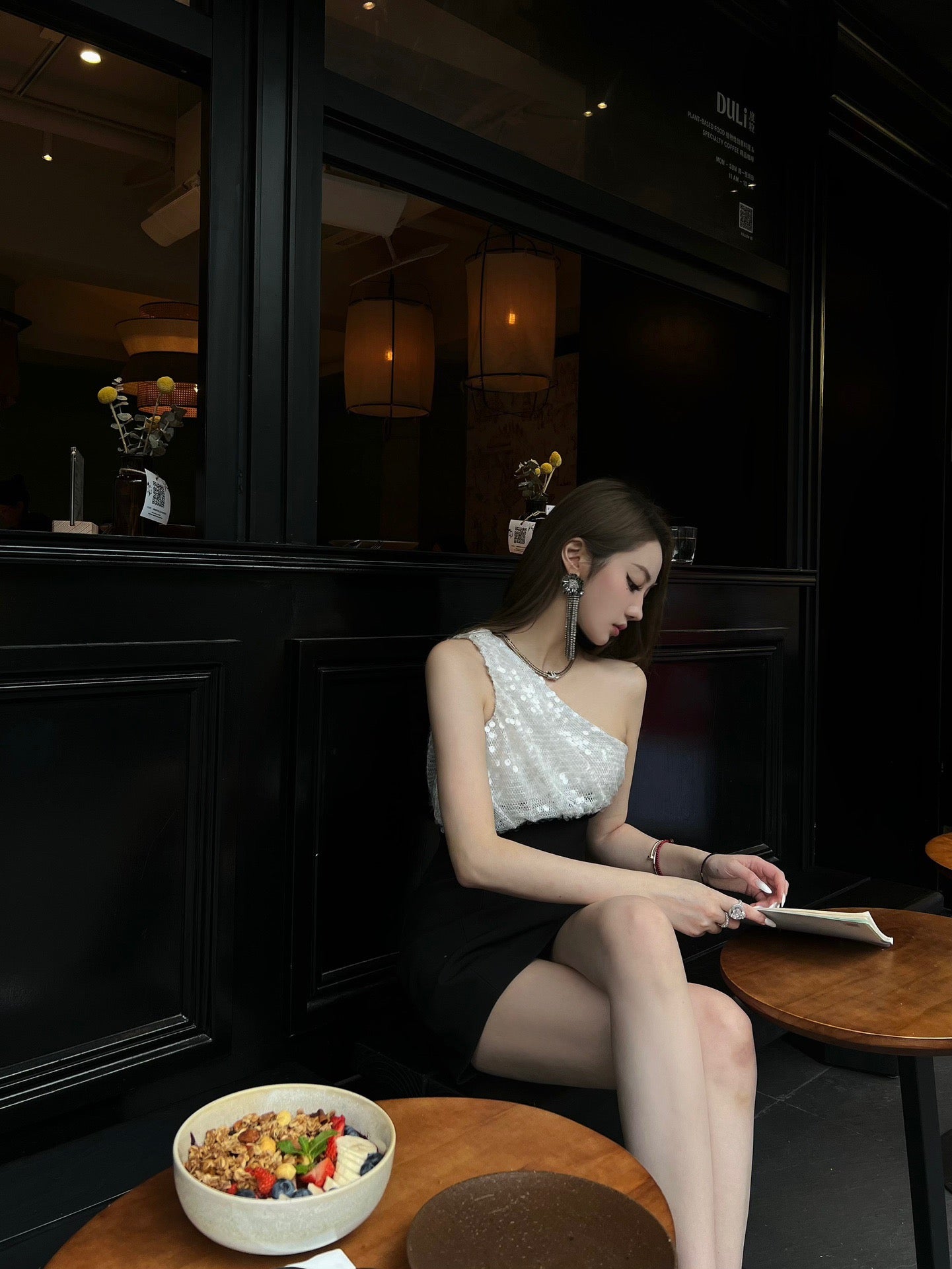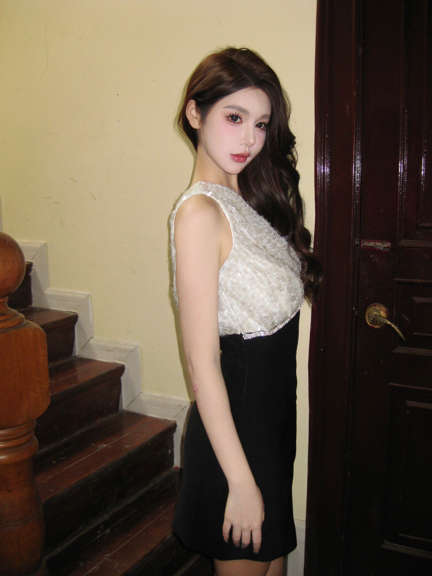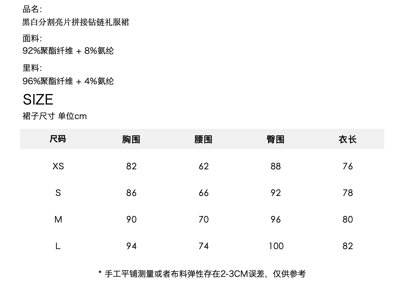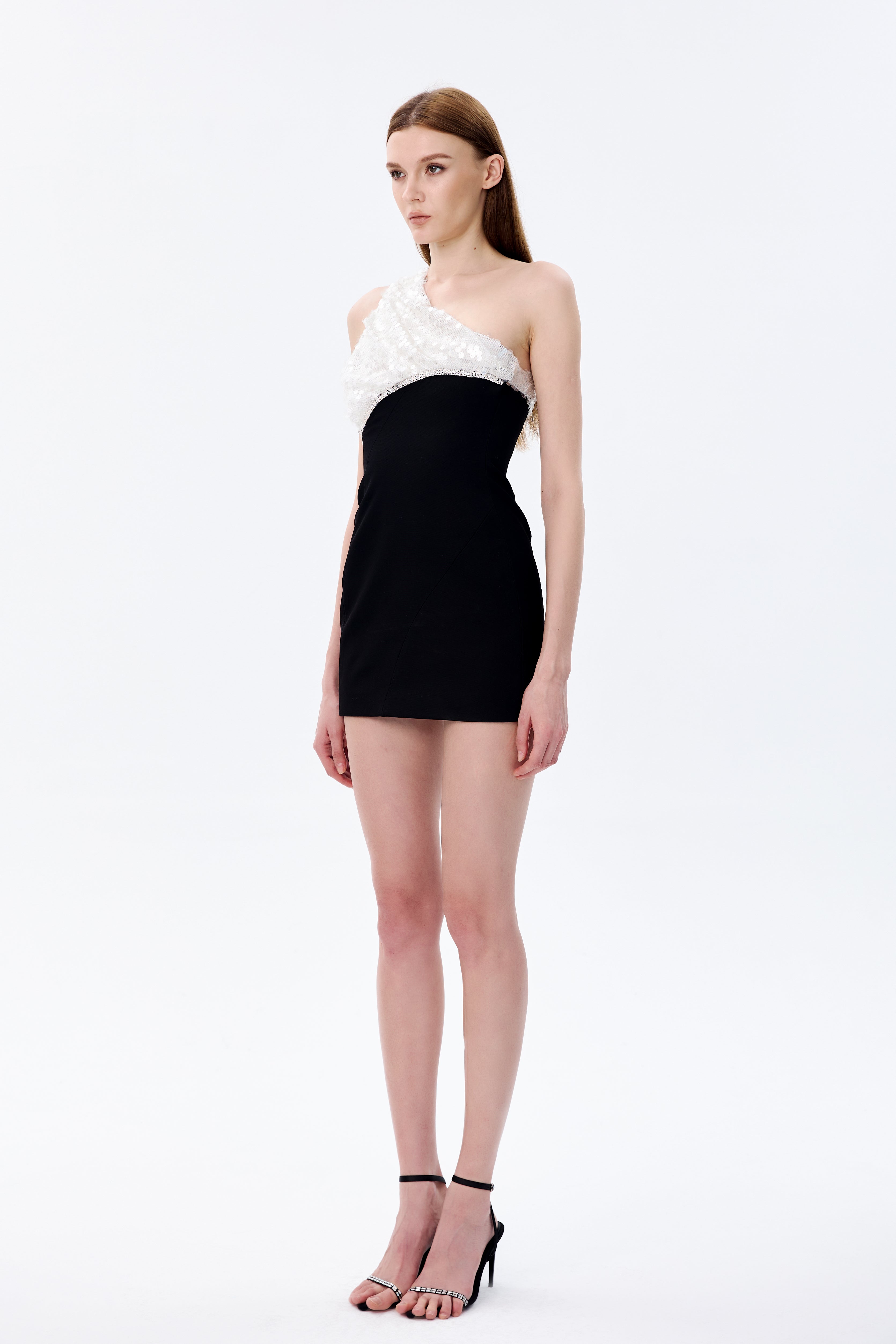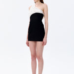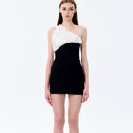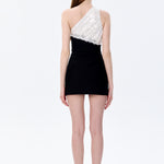 ECUME 2408 黑白拼色亮片水钻斜肩连衣裙