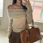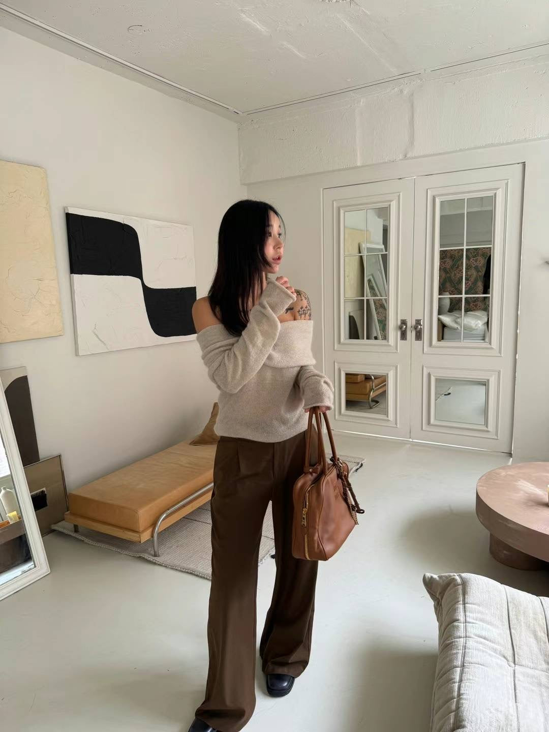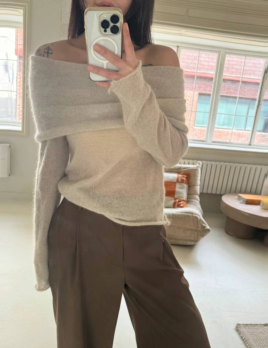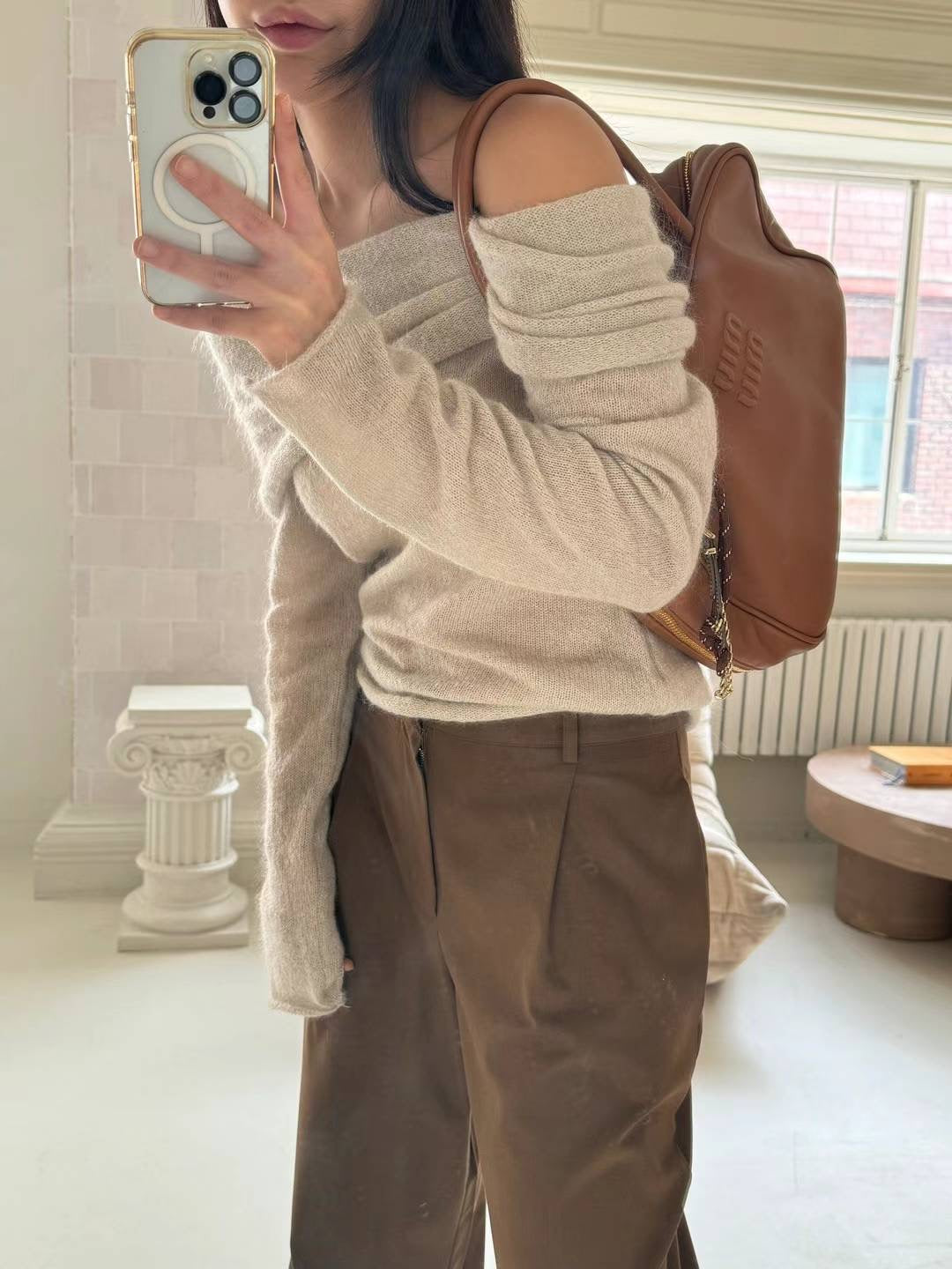 KOREAN COLLECTION 2501 纯色针织一字领上衣 浅咖
