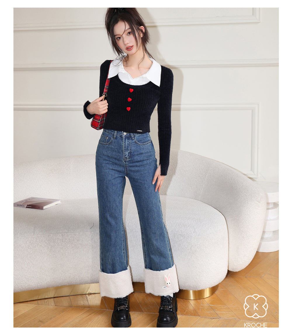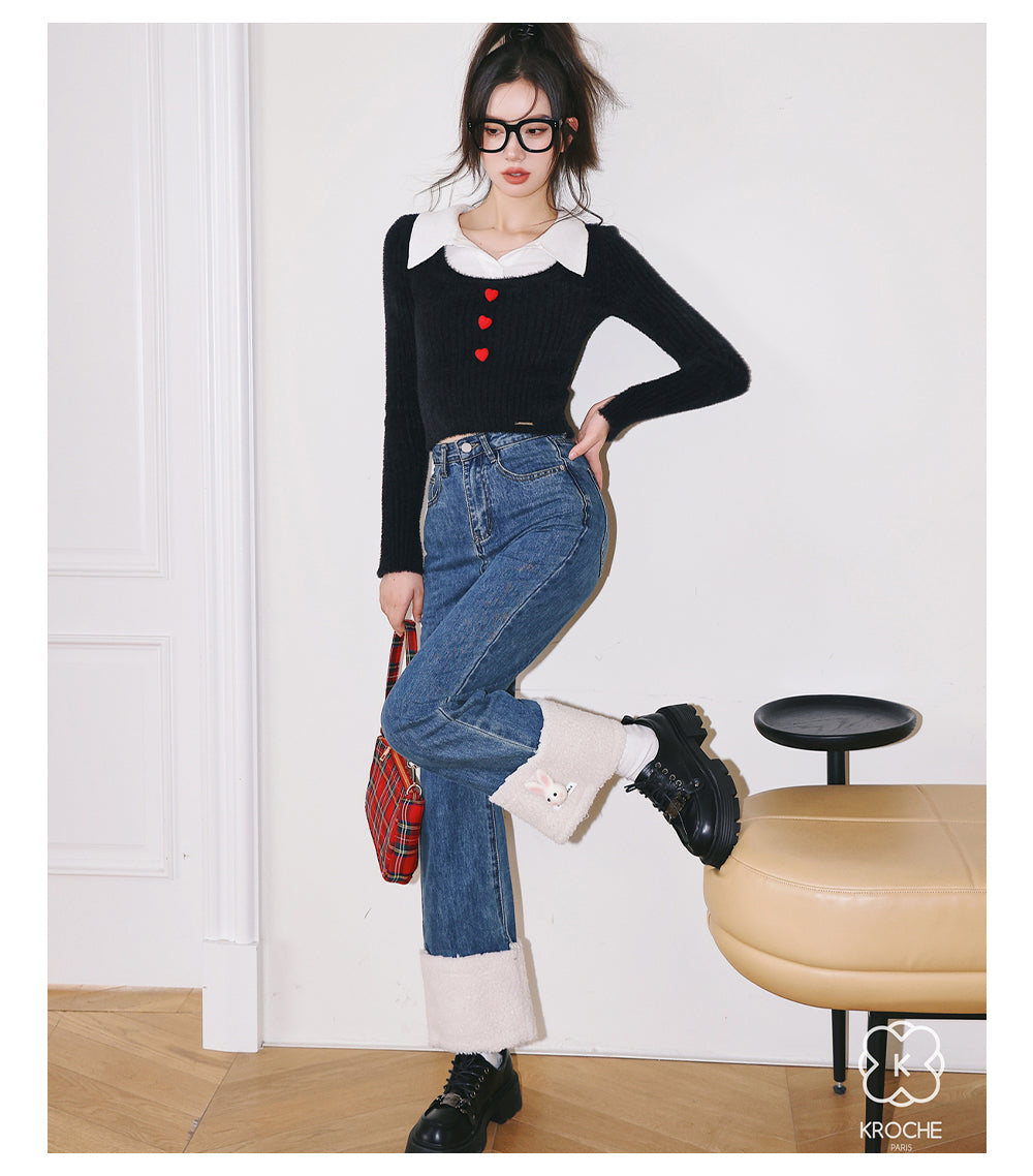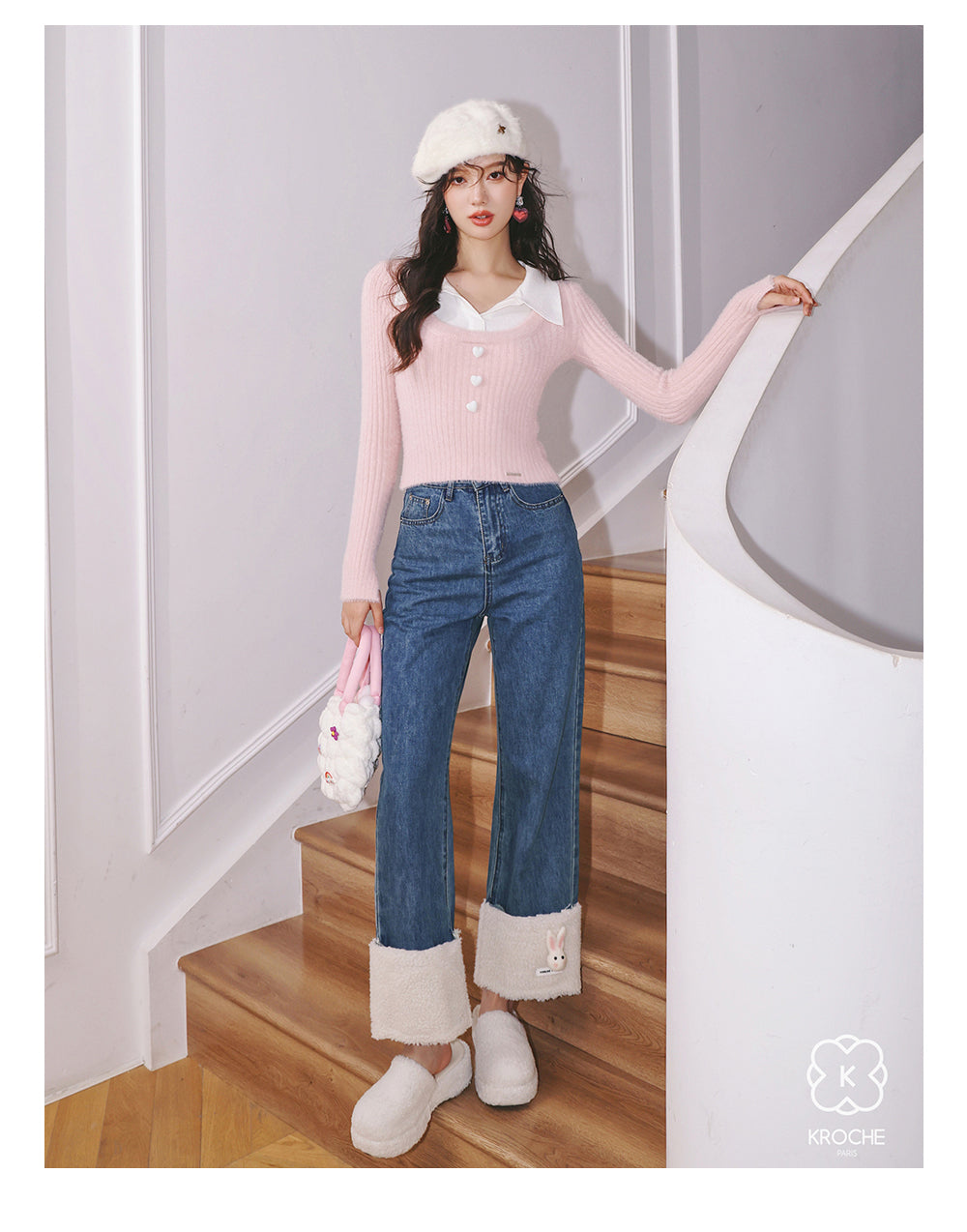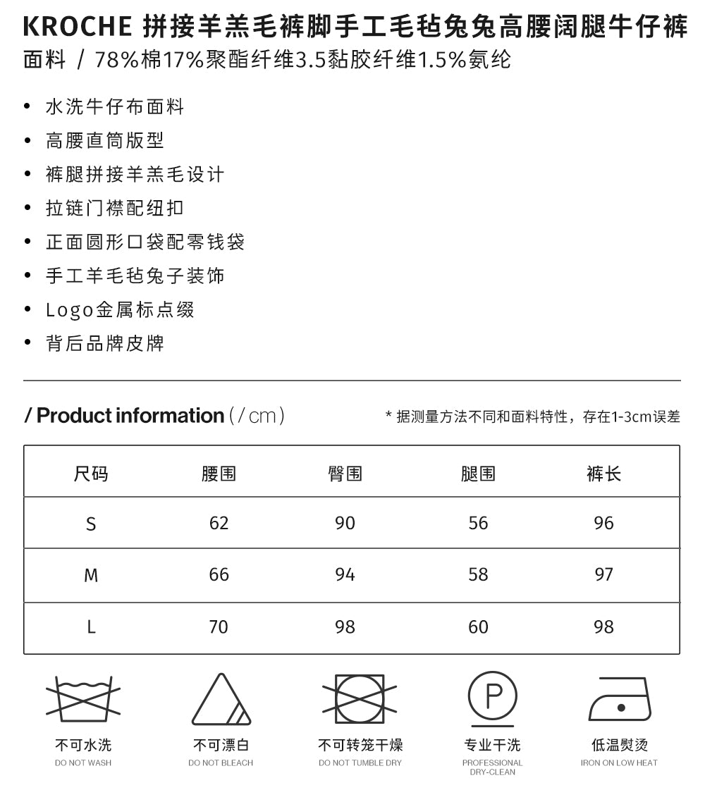 Kroche 拼接羊羔毛裤脚手工毛毡兔兔高腰牛仔裤阔腿裤
