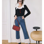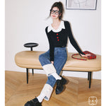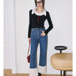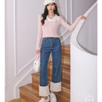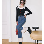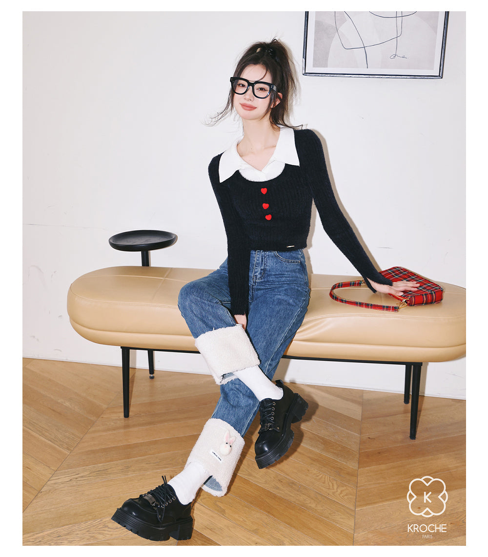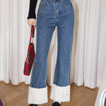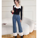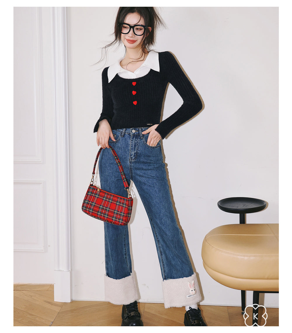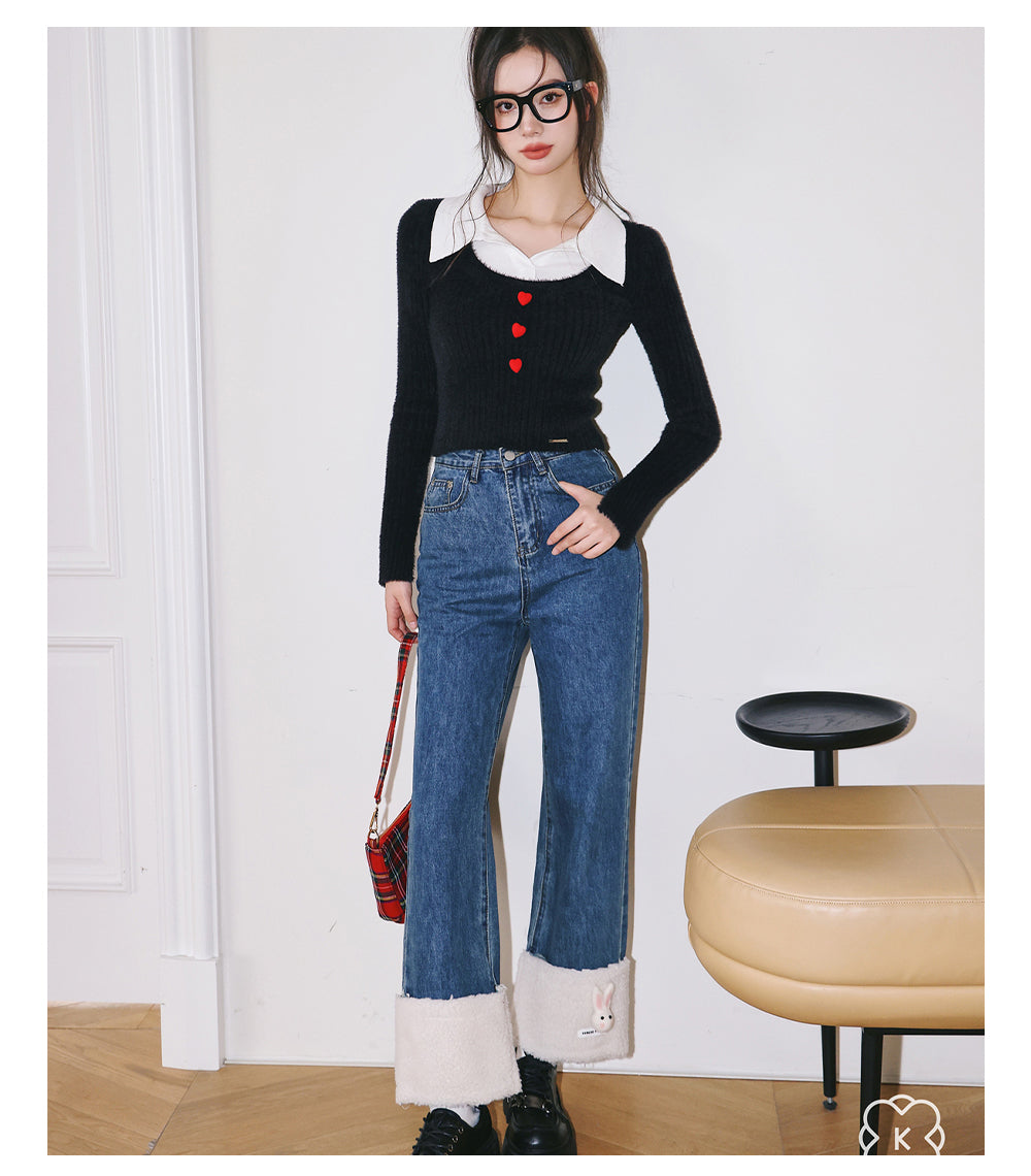 Kroche 拼接羊羔毛裤脚手工毛毡兔兔高腰牛仔裤阔腿裤