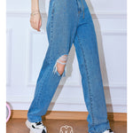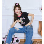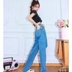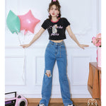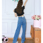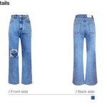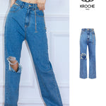 Kroche 链条穿孔高腰镂空破洞牛仔裤阔腿裤