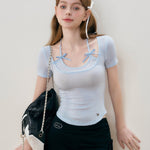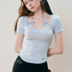 Kroche 2406 假两件蝴蝶结短袖T恤 蓝