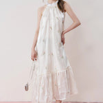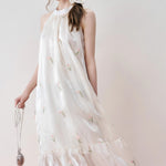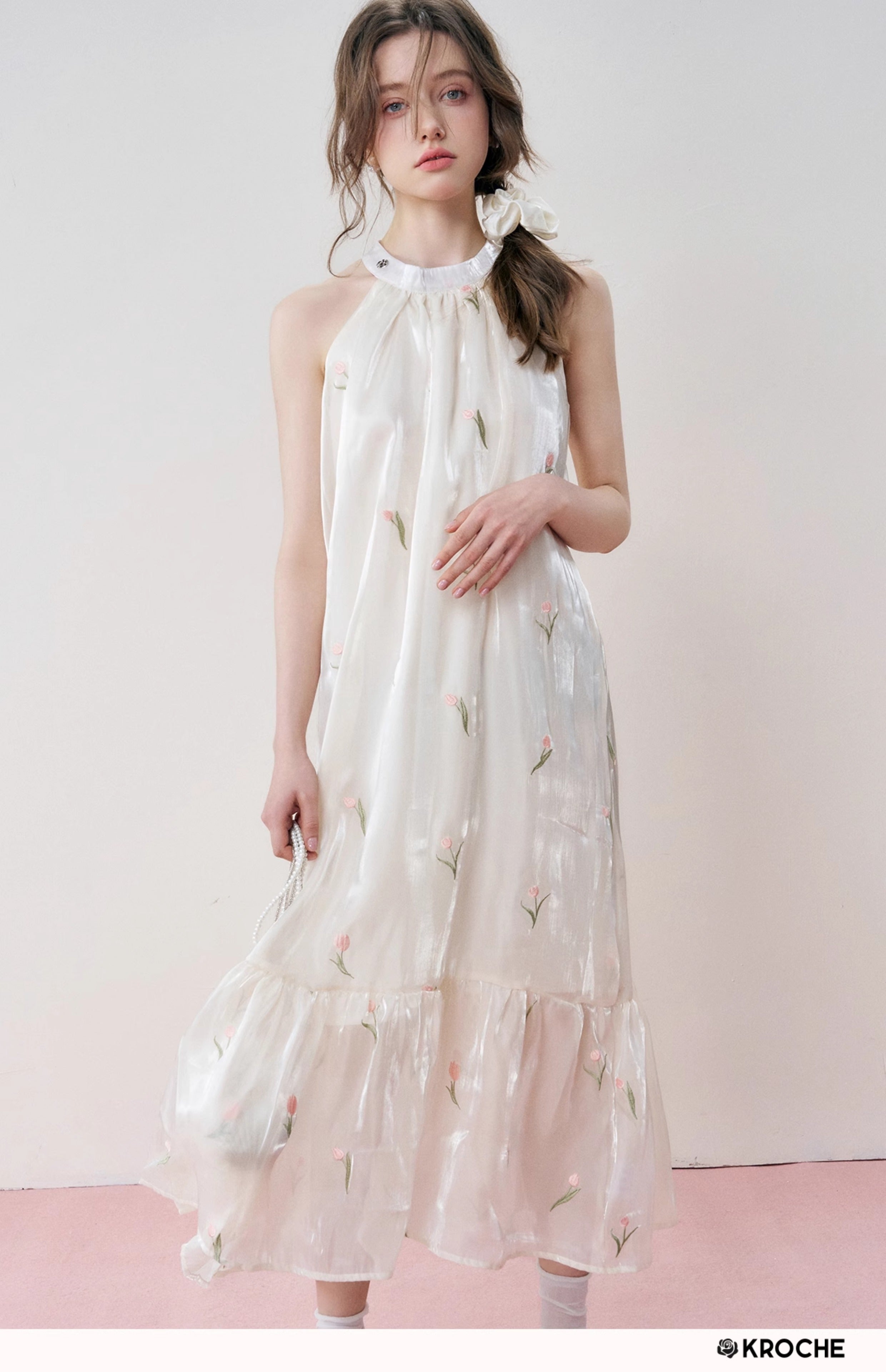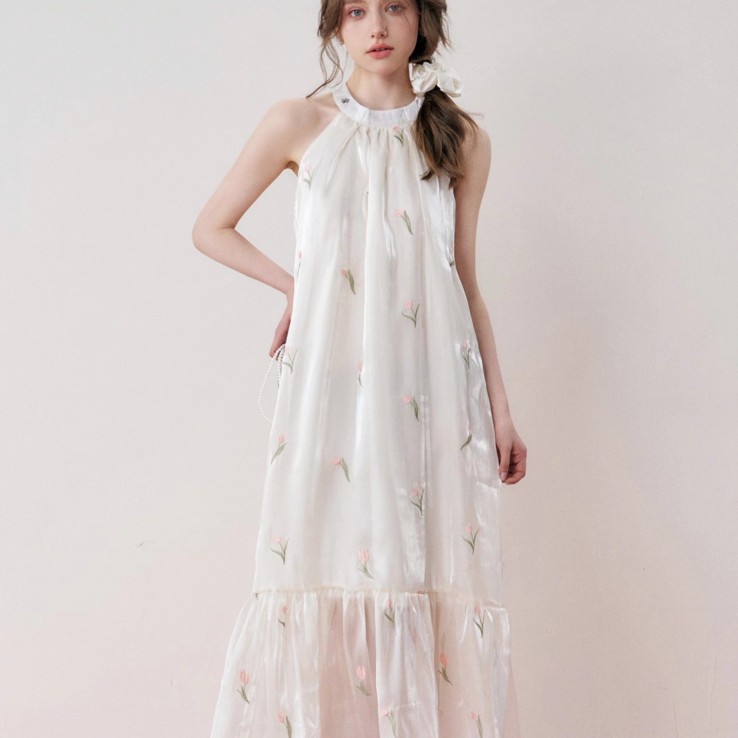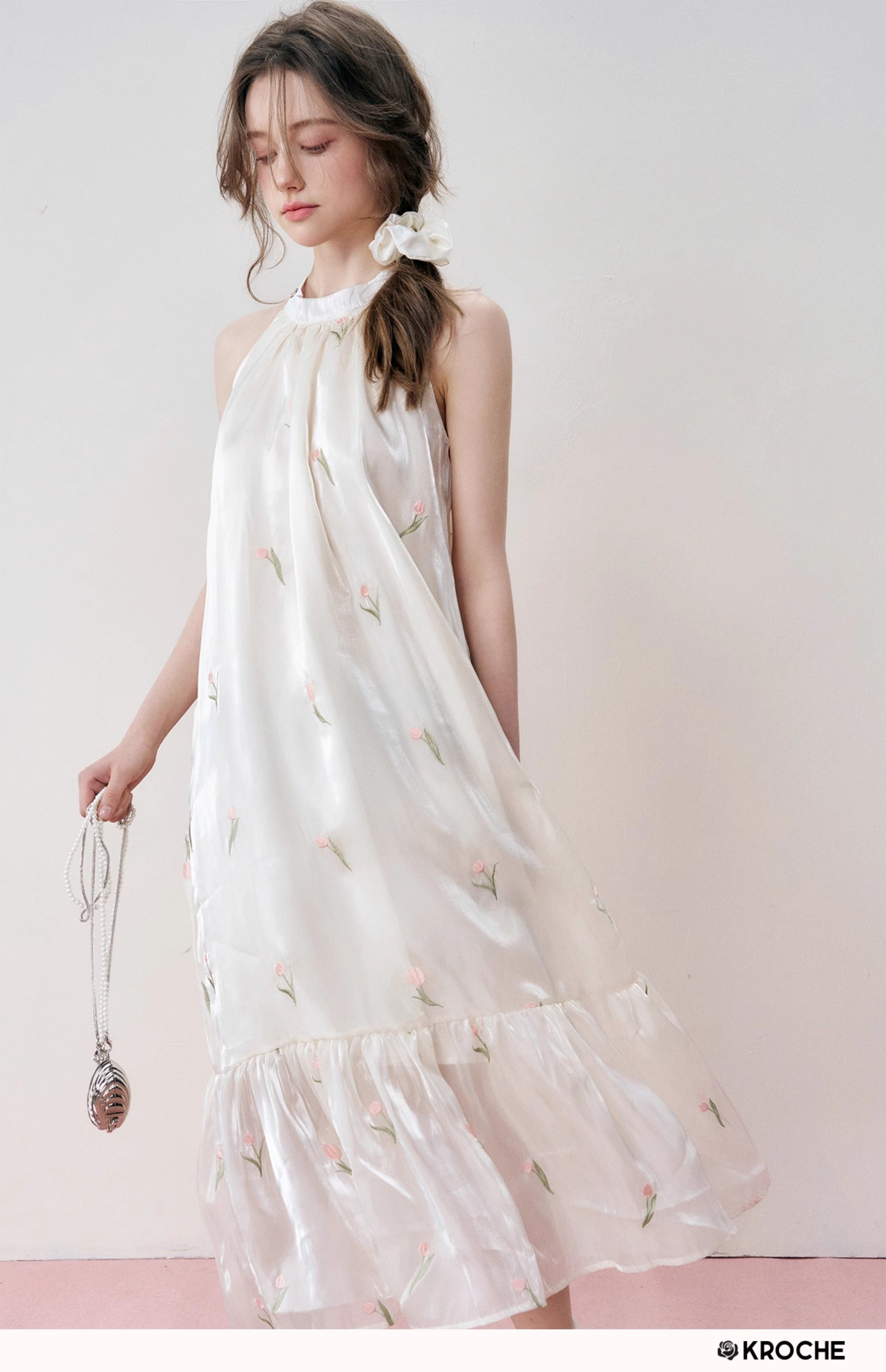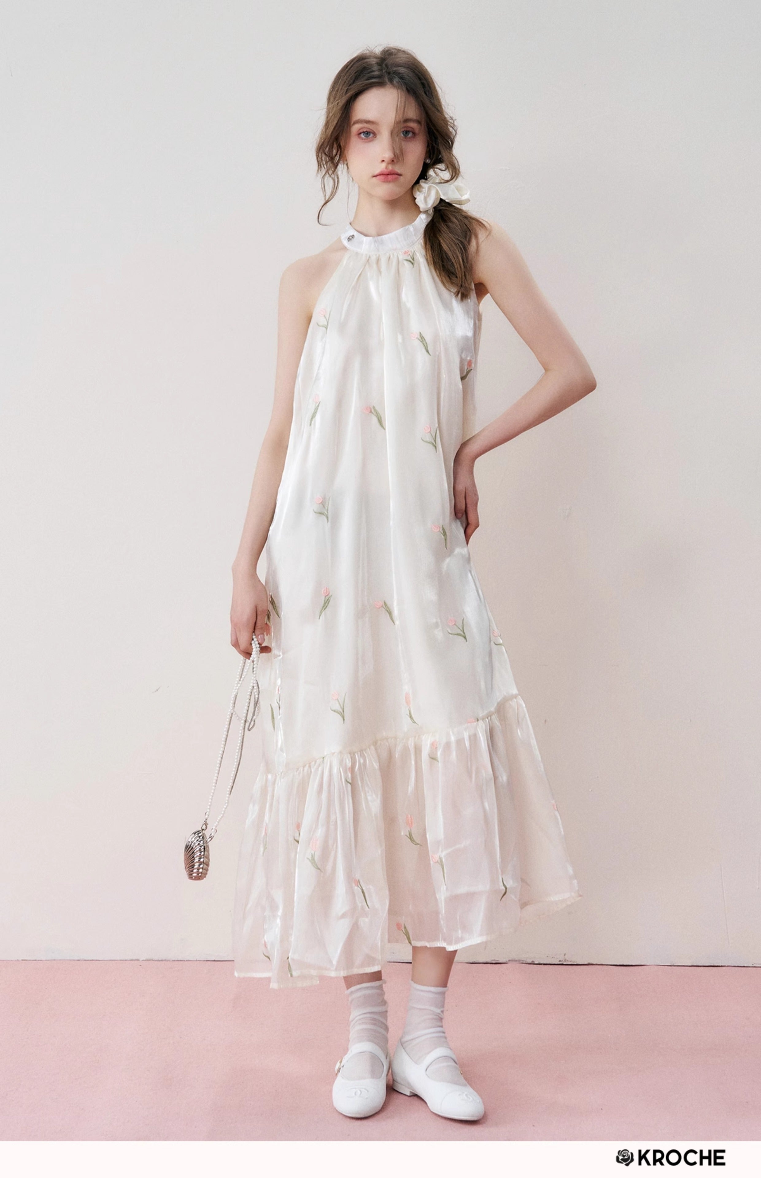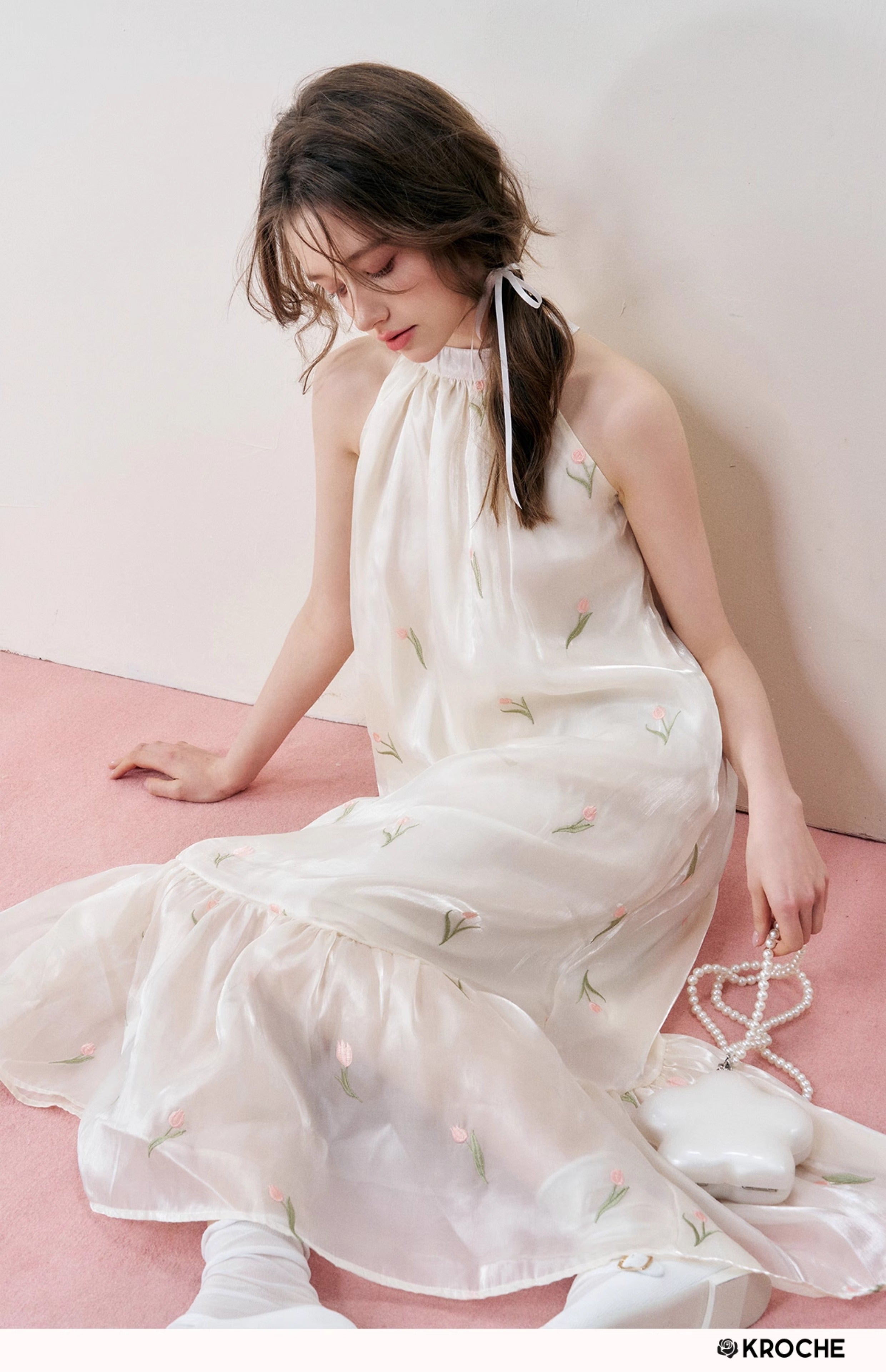 Kroche 2408 郁金香欧根纱挂脖连衣裙