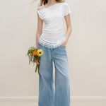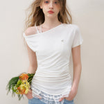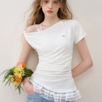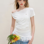 Kroche 2507 蕾丝花边扭结斜肩短袖T恤 白