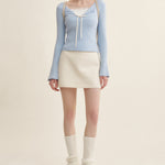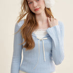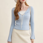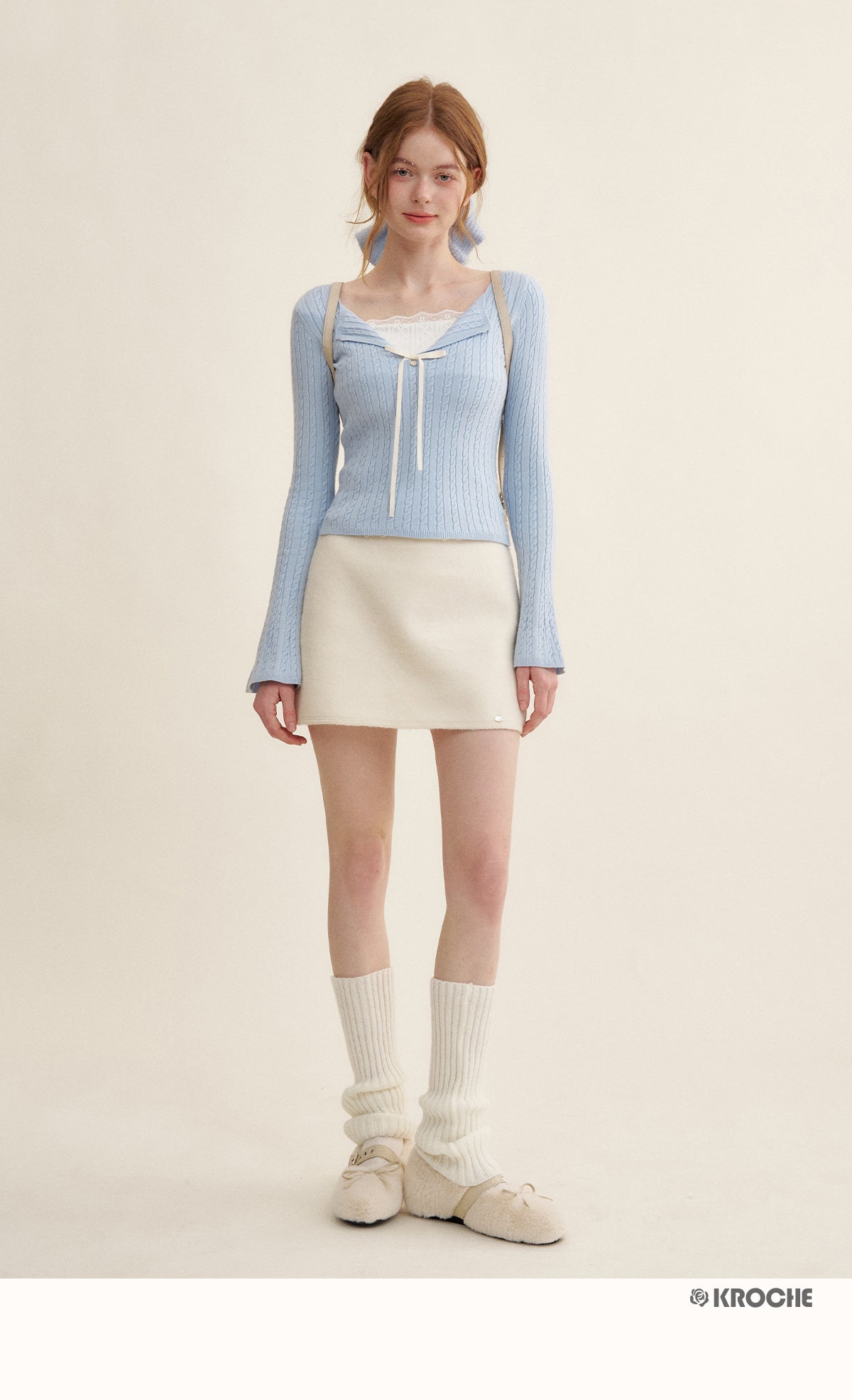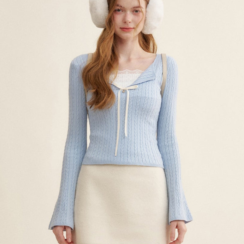 Kroche 2510 细绞花假两件拼接修身针织衫 浅蓝