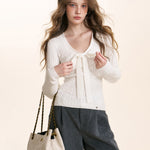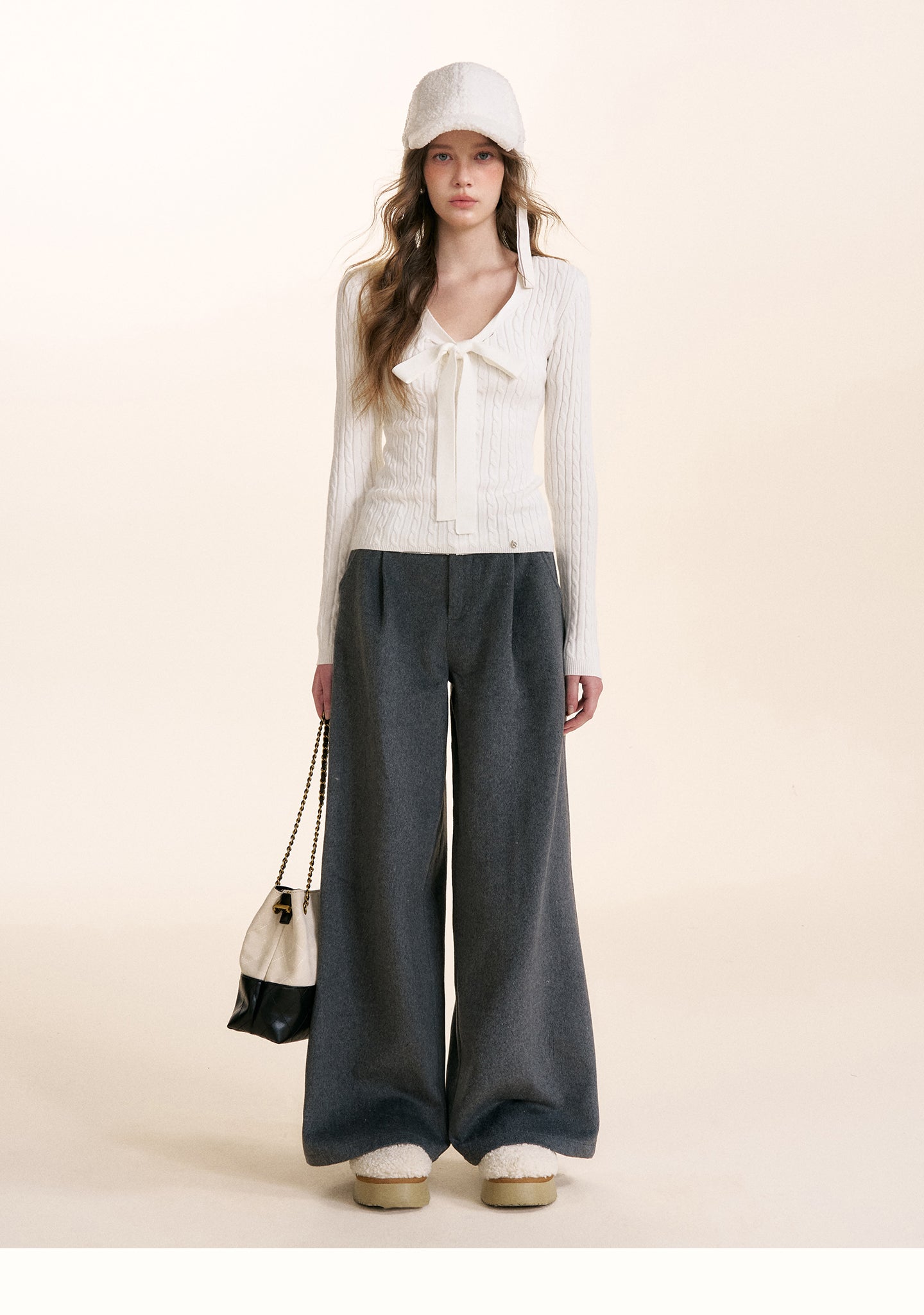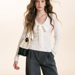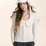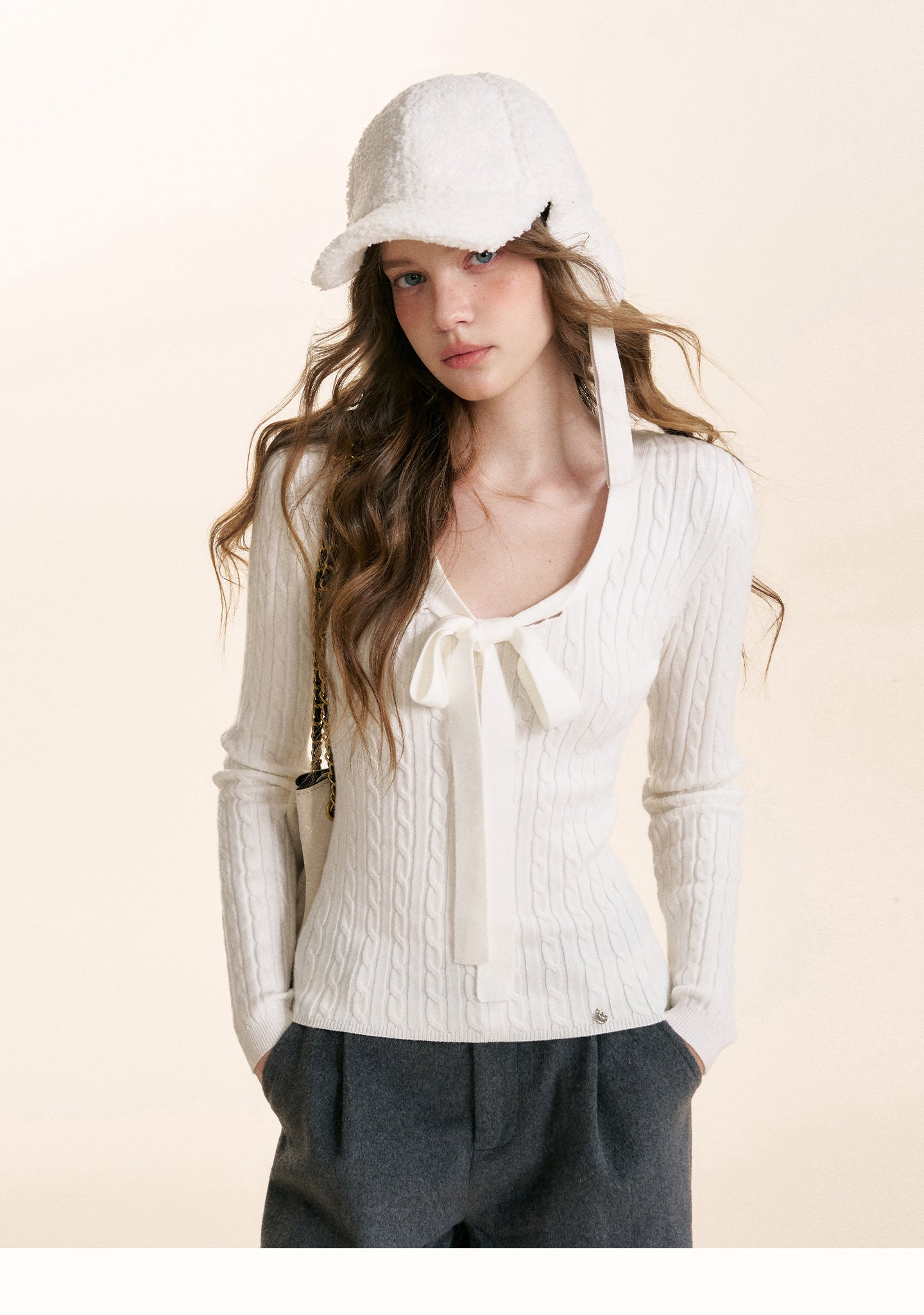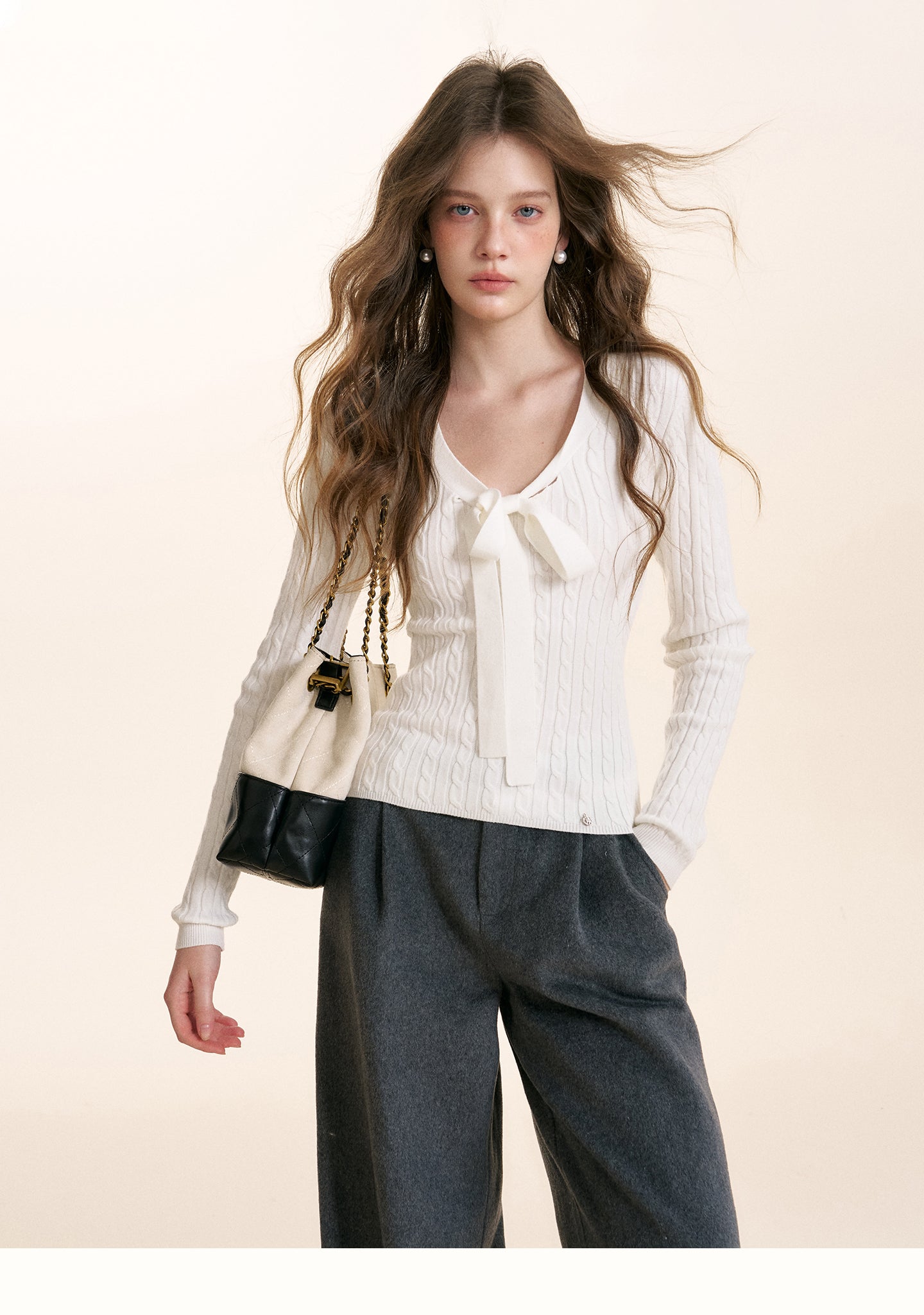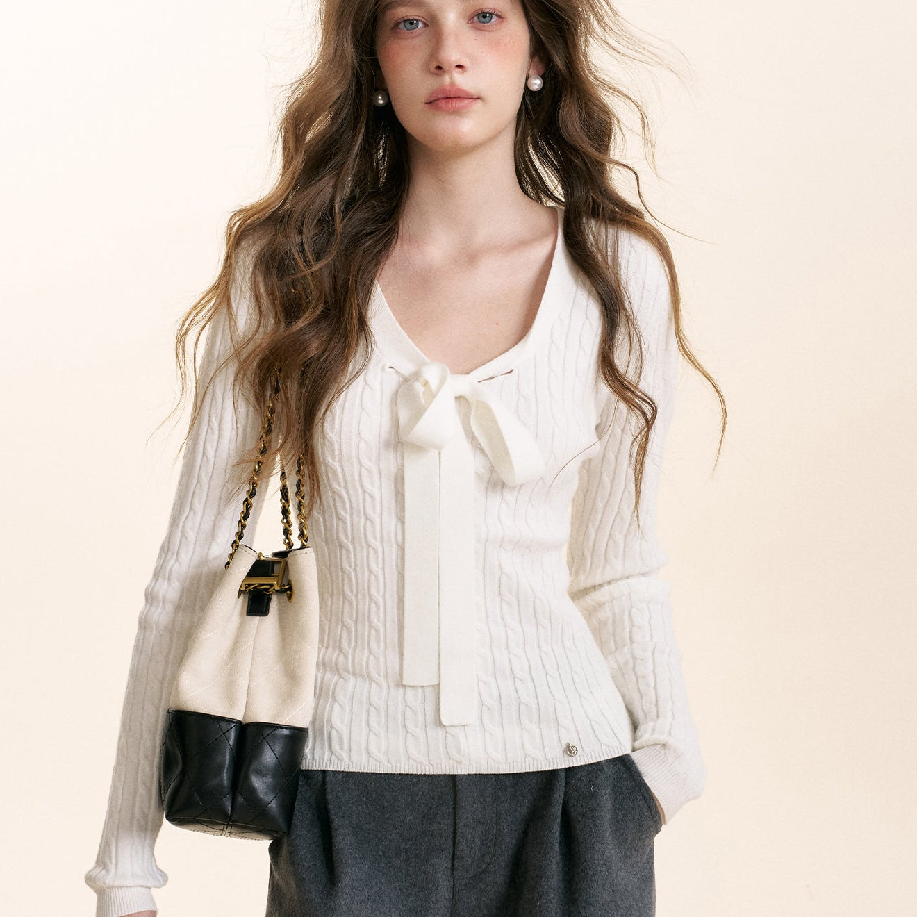 Kroche 2511 系带蝴蝶结麻花坑条修身针织打底衫
