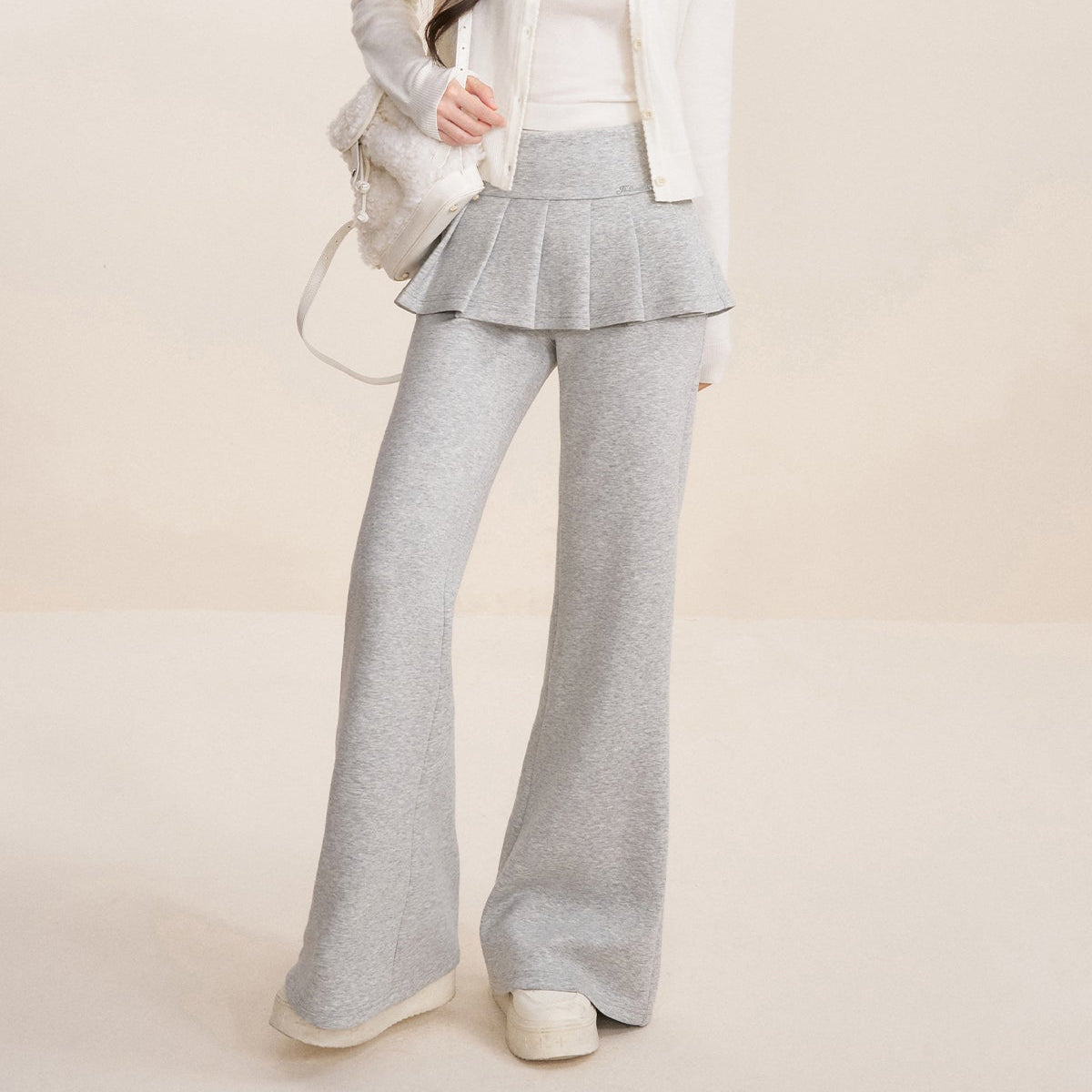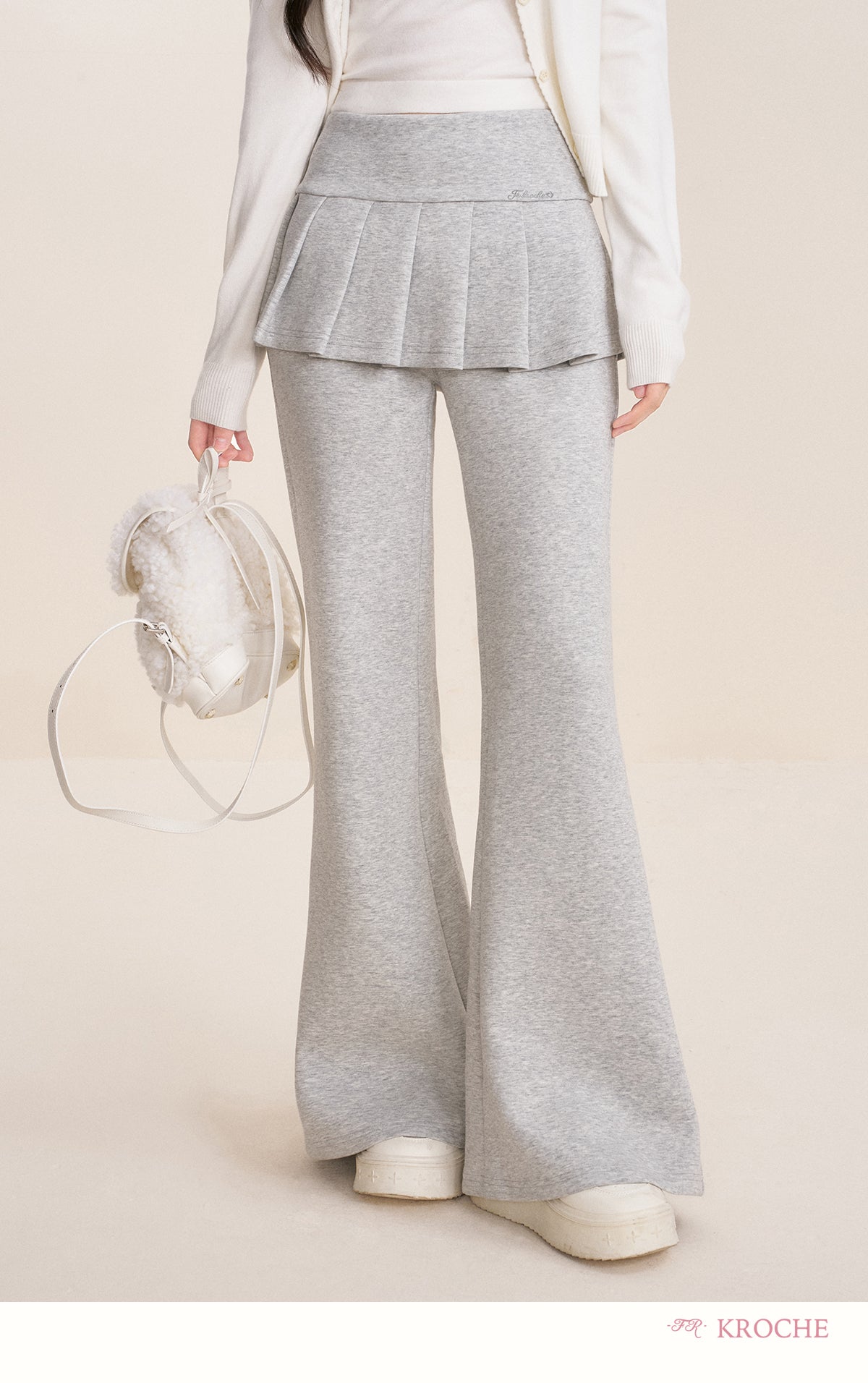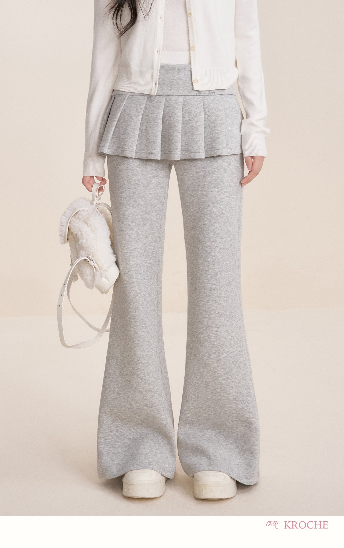 Kroche 2512 假两件 松紧腰A字百褶裙拼接休闲微喇裤