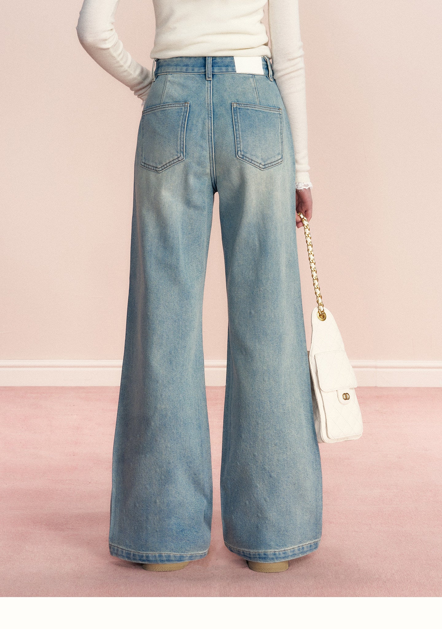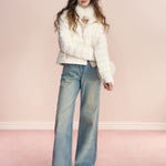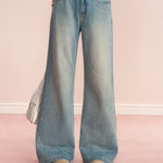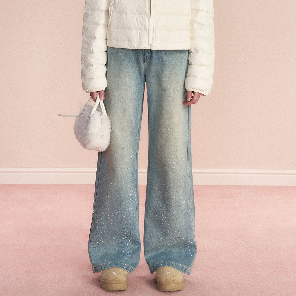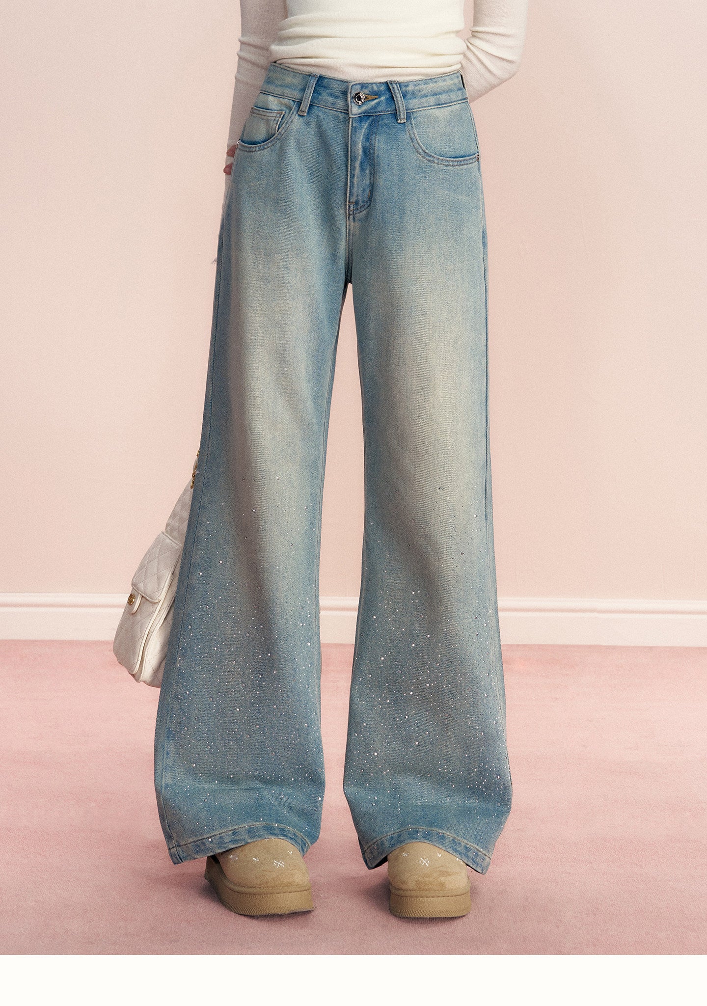 Kroche 2602 重工烫钻内里抓绒宽松直筒牛仔裤