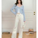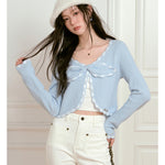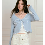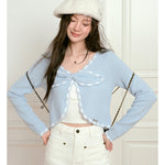 Kroche SS2309 蝴蝶结撞色手钩花边长袖针织开衫 蓝