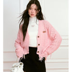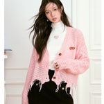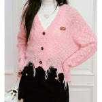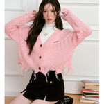 Kroche SS2310 破洞毛边V领宽松针织开衫 粉