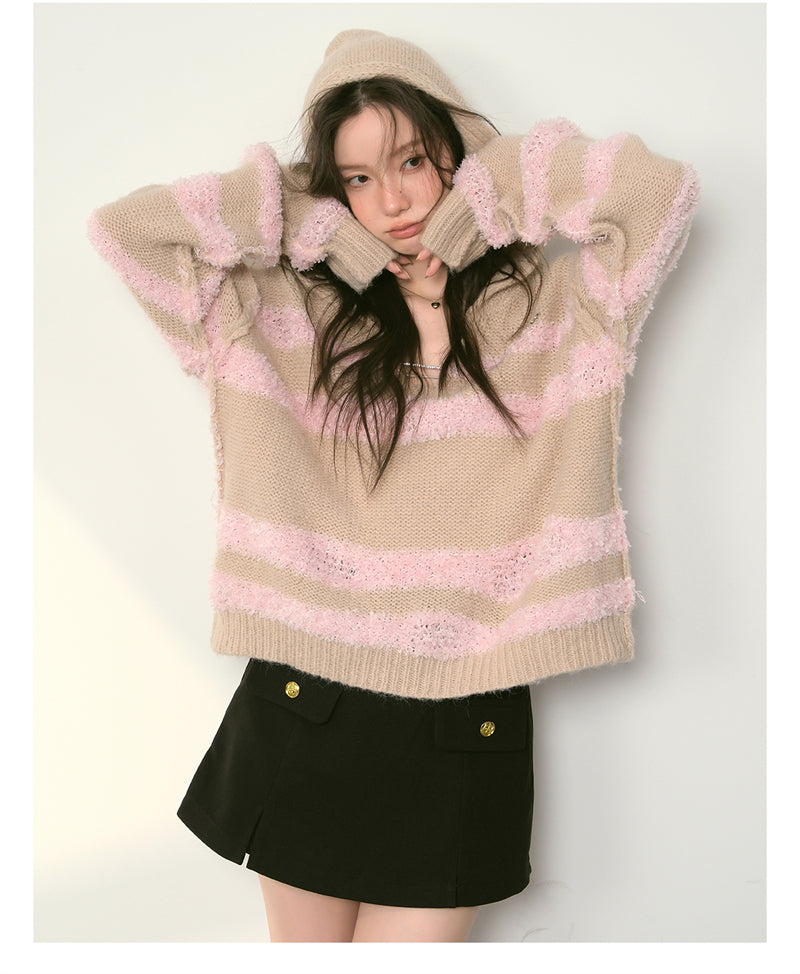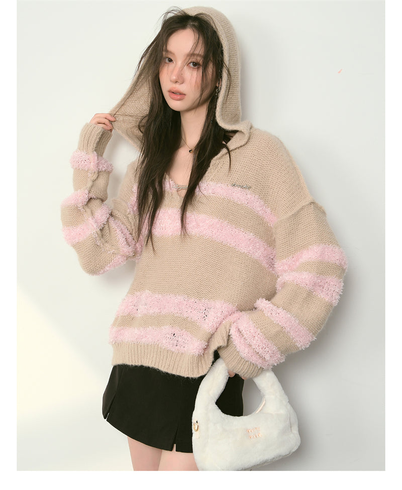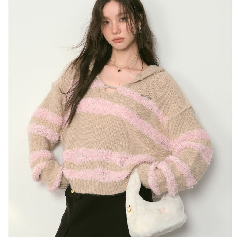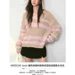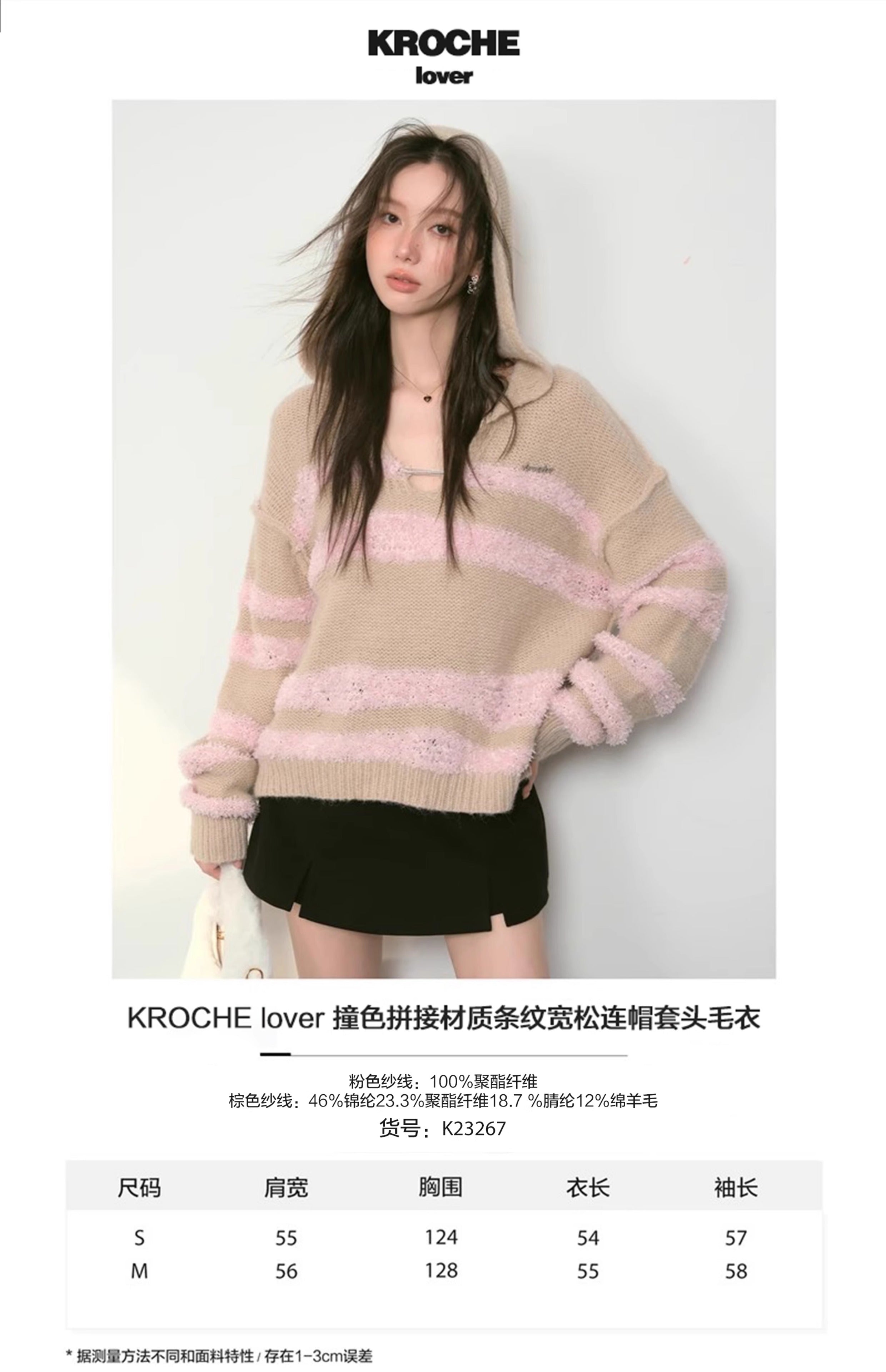 Kroche SS2311 撞色拼接条纹连帽毛衣