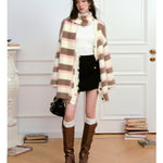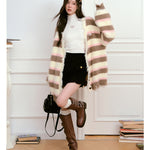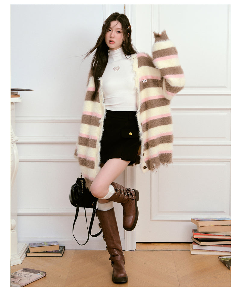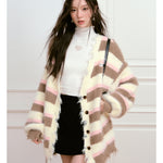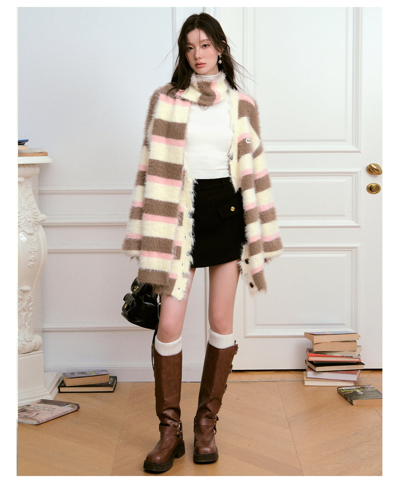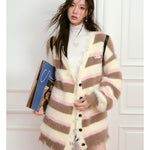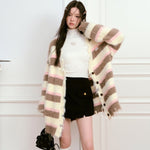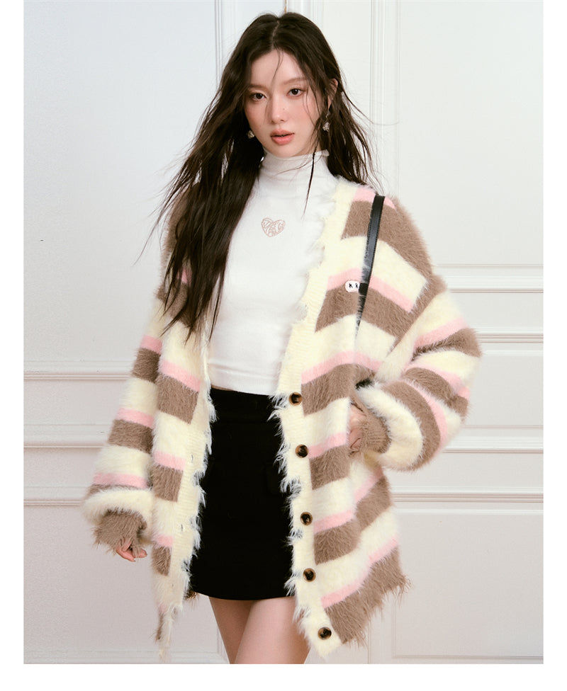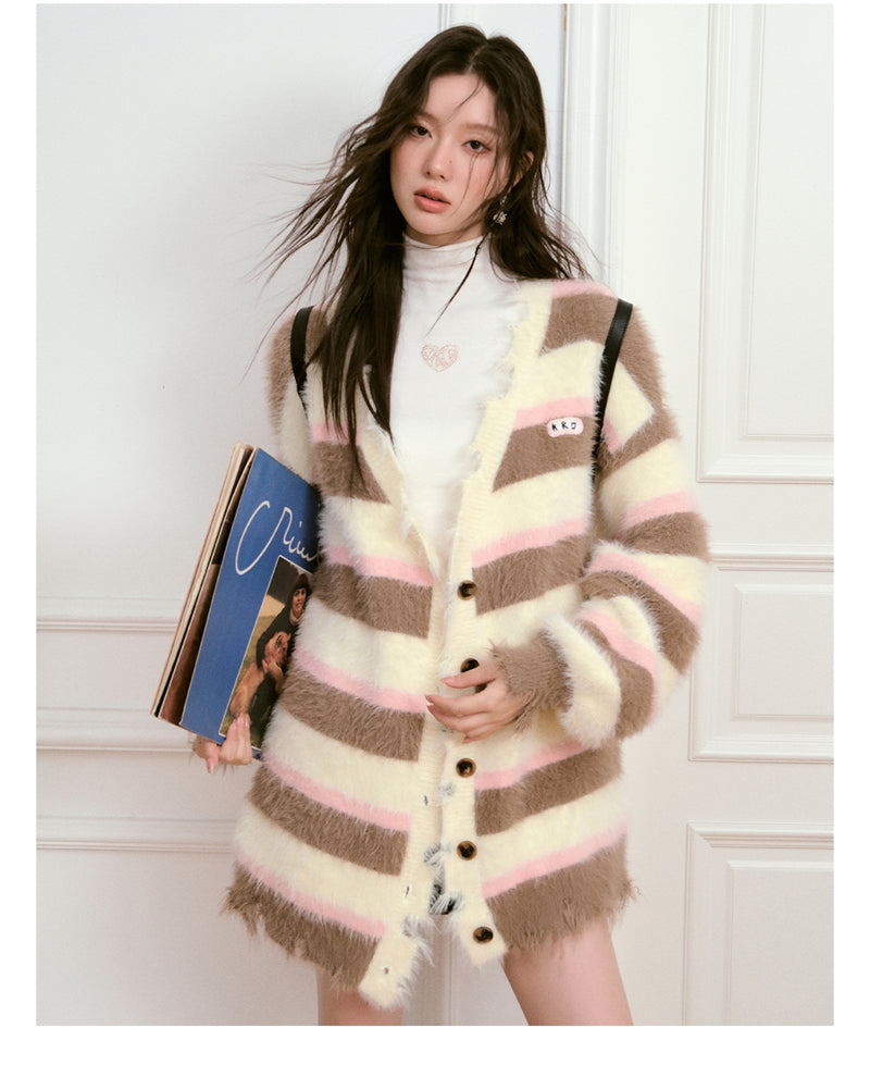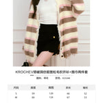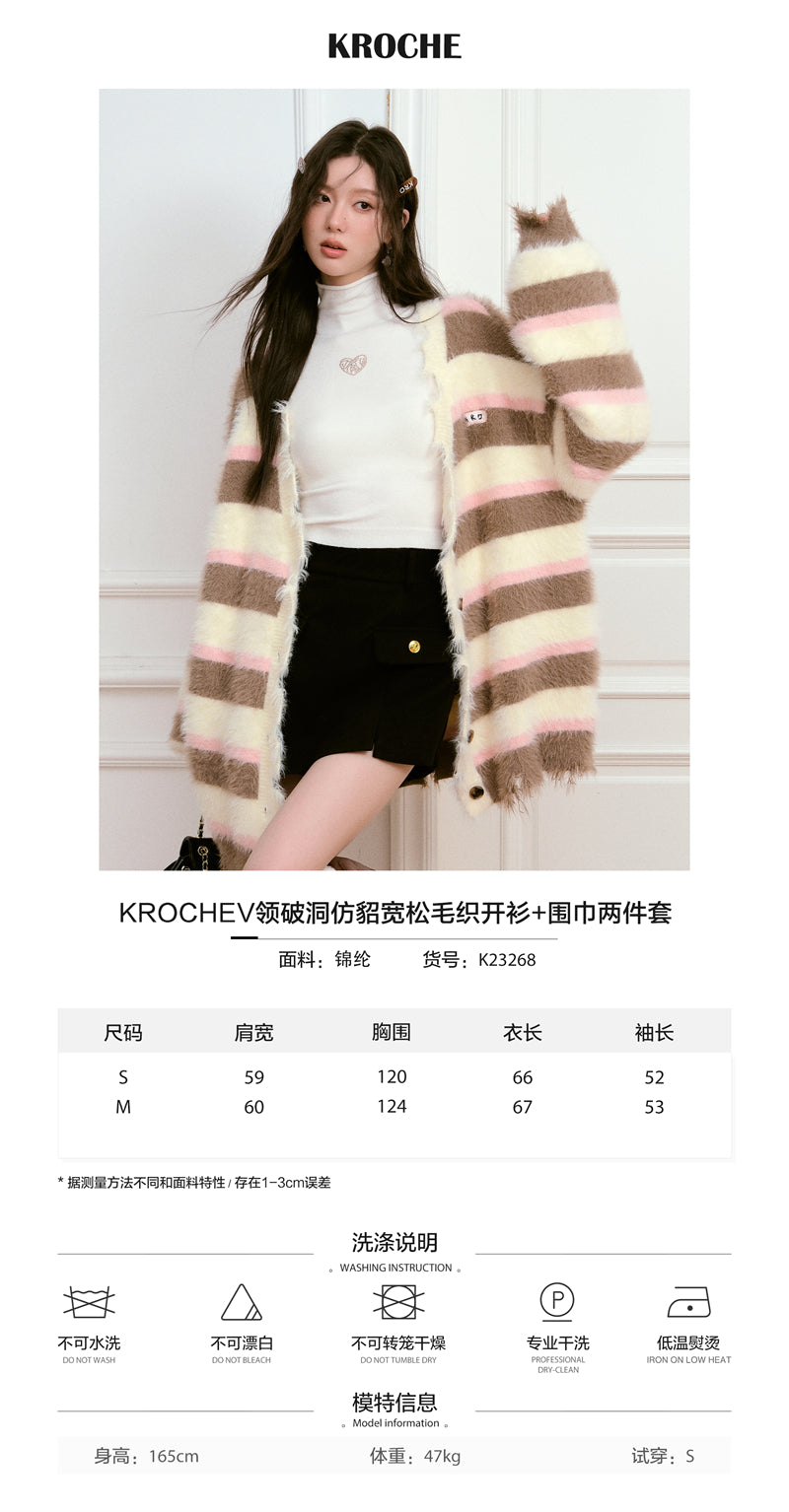 Kroche SS2311 V领破洞仿貂撞色条纹毛织开衫